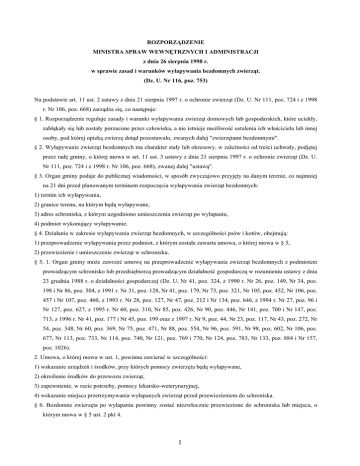 ROZPORZĄDZENIE MINISTRA SPRAW WEWNĘTRZNYCH I ADMINISTRACJI z dnia 26 sierpnia 1998 r. w sprawie zasad i warunków wyłapywania bezdomnych zwierząt. (Dz. U. Nr 116, poz. 753) Na podstawie art. 11 ust. 2 ustawy z dnia 21 sierpnia 1997 r. o ochronie zwierząt (Dz. U. Nr 111, poz. 724 i z 1998 r. Nr 106, poz. 668) zarządza się, co następuje: § 1. Rozporządzenie reguluje zasady i warunki wyłapywania zwierząt domowych lub gospodarskich, które uciekły, zabłąkały się lub zostały porzucone przez człowieka, a nie istnieje możliwość ustalenia ich właściciela lub innej osoby, pod której opieką zwierzę dotąd pozostawało, zwanych dalej "zwierzętami bezdomnymi". § 2. Wyłapywanie zwierząt bezdomnych ma charakter stały lub okresowy, w zależności od treści uchwały, podjętej przez radę gminy, o której mowa w art. 11 ust. 3 ustawy z dnia 21 sierpnia 1997 r. o ochronie zwierząt (Dz. U. Nr 111, poz. 724 i z 1998 r. Nr 106, poz. 668), zwanej dalej "ustawą". § 3. Organ gminy podaje do publicznej wiadomości, w sposób zwyczajowo przyjęty na danym terenie, co najmniej na 21 dni przed planowanym terminem rozpoczęcia wyłapywania zwierząt bezdomnych: 1) termin ich wyłapywania, 2) granice terenu, na którym będą wyłapywane, 3) adres schroniska, z którym uzgodniono umieszczenia zwierząt po wyłapaniu, 4) podmiot wykonujący wyłapywanie. § 4. Działania w zakresie wyłapywania zwierząt bezdomnych, w szczególności psów i kotów, obejmują: 1) przeprowadzenie wyłapywania przez podmiot, z którym została zawarta umowa, o której mowa w § 5, 2) przewiezienie i umieszczenie zwierząt w schronisku. § 5. 1. Organ gminy może zawrzeć umowę na przeprowadzenie wyłapywania zwierząt bezdomnych z podmiotem prowadzącym schronisko lub przedsiębiorcą prowadzącym działalność gospodarczą w rozumieniu ustawy z dnia 23 grudnia 1988 r. o działalności gospodarczej (Dz. U. Nr 41, poz. 324, z 1990 r. Nr 26, poz. 149, Nr 34, poz. 198 i Nr 86, poz. 504, z 1991 r. Nr 31, poz. 128, Nr 41, poz. 179, Nr 73, poz. 321, Nr 105, poz. 452, Nr 106, poz. 457 i Nr 107, poz. 460, z 1993 r. Nr 28, poz. 127, Nr 47, poz. 212 i Nr 134, poz. 646, z 1994 r. Nr 27, poz. 96 i Nr 127, poz. 627, z 1995 r. Nr 60, poz. 310, Nr 85, poz. 426, Nr 90, poz. 446, Nr 141, poz. 700 i Nr 147, poz. 713, z 1996 r. Nr 41, poz. 177 i Nr 45, poz. 199 oraz z 1997 r. Nr 9, poz. 44, Nr 23, poz. 117, Nr 43, poz. 272, Nr 54, poz. 348, Nr 60, poz. 369, Nr 75, poz. 471, Nr 88, poz. 554, Nr 96, poz. 591, Nr 98, poz. 602, Nr 106, poz. 677, Nr 113, poz. 733, Nr 114, poz. 740, Nr 121, poz. 769 i 770, Nr 124, poz. 783, Nr 133, poz. 884 i Nr 157, poz. 1026). 2. Umowa, o której mowa w ust. 1, powinna zawierać w szczególności: 1) wskazanie urządzeń i środków, przy których pomocy zwierzęta będą wyłapywane, 2) określenie środków do przewozu zwierząt, 3) zapewnienie, w razie potrzeby, pomocy lekarsko-weterynaryjnej, 4) wskazanie miejsca przetrzymywania wyłapanych zwierząt przed przewiezieniem do schroniska. § 6. Bezdomne zwierzęta po wyłapaniu powinny zostać niezwłocznie przewiezione do schroniska lub miejsca, o którym mowa w § 5 ust. 2 pkt 4. 1 § 7. Używane przy wyłapywaniu zwierząt bezdomnych urządzenia i środki nie mogą stwarzać zagrożenia dla ich życia i zdrowia ani zadawać im cierpienia. § 8. Środki do przewozu zwierząt powinny spełniać warunki, o których mowa w art. 24 ust. 1 ustawy. § 9. Rozporządzenie wchodzi w życie po upływie 14 dni od dnia ogłoszenia. Minister Spraw Wewnętrznych i Administracji: J. Tomaszewski 2
