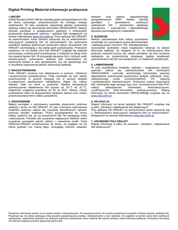 Digital Printing Material-informacje praktyczne 1.WSTĘP Orafol Europe GmbH oferuje szeroką gamę samoprzylepnych folii do druku cyfrowego, przeznaczonych do różnego rodzaju zastosowań. W celu uzyskania najwyższej jakości wykonanej aplikacji zaleca się stosowanie laminatów ORAGUARD®. Należy również pamiętać o postępowaniu zgodnym z instrukcjami producenta dotyczącymi zadruku i aplikacji folii dostępnymi na stronie internetowej www.sito.lublin.pl. Przy aplikacji folii ORAJET na samochodach warto również zapoznać się ze wskazówkami dotyczącymi wyklejania folii na samochodach. Do wykonania wszelkich aplikacji graficznych producent zaleca stosowanie folii ORAJET pochodzącej z tej samej partii produkcyjnej. Producent zapewnia, że na każdej rolce folii ORAJET znajduje się materiał pochodzący z jednej partii produkcyjnej, a materiał na danej rolce nie zawiera łączeń folii. W przypadku łączenia folii z różnych partii produkcyjnych, wykonawca aplikacji jest zobowiązany do wykonania testów w celu sprawdzenia, czy nie spowoduje ono w rezultacie pogorszenia jakości wykonanej aplikacji. 2. MAGAZYNOWANIE Folie ORAJET powinny być składowane w suchym, chłodnym i zaciemnionym pomieszczeniu. Folie nawinięte na role należy przechowywać w pozycji wiszącej lub w pozycji stojącej (z nałożonymi plastikowymi nakładkami). Nigdy nie należy układać rolek na ziemi w poziomie. Idealna temperatura pomieszczenia składowania folii wynosi od 18 C ̊ do 22 C, ̊ wilgotność względna powietrza od 50 do 60%. Należy unikać wystawiania rolek na bezpośrednie działanie słońca oraz unikać przechowywania folii w obliżu grzejników. 3. DRUKOWANIE Należy pamiętać o zachowaniu wszelkiej staranności podczas aplikacji i druku na folii ORAJET. W celu uniknięcia zabrudzenia materiału podczas zaleca się używanie bawełnianych rękawic podczas obróbki materiału. Przed przystąpieniem do druku należy upewnić się, że na powierzchni folii nie występują wady i zabrudzenia. Ponadto dla uzyskania najlepszych efektów warto wcześniej sprawdzić jakość plików i ustawienia profili. Folie ORACAL/ORAJET przeznaczone do druku, ze względu na ich różną grubość czy rodzaj kleju, wymagają różnych ustawień drukarki oraz doboru odpowiedniego oprogramowania (RIP). Należy również pamiętać o sprawdzeniu możliwych zastosowań folii i atramentów (aplikacja zewnętrzna i wewnętrzna) i odpowiedniego łączenia poszczególnych materiałów. 4. SUSZENIE Świeżo zadrukowane folie należy pozostawić rozwinięte do wyschnięcia przed laminowaniem i aplikacją przez minimum 72h. Nieodpowiednie wysuszenie wydruków może negatywnie wpłynąć na jakość końcowej aplikacji. Ze względu na to, że zadrukowana folia podczas suszenia kurczy się, należy pamiętać, że zbyt wczesne naklejenie na powierzchnię docelową, będzie skutkować podnoszeniem się folii na krawędziach i w miejscach przetłoczeń. 5. LAMINOWANIE W celu przedłużenia trwałości aplikacji i zwiększenia jakości wydruku zaleca się zabezpieczenie folii laminatami ORAGUARD®. Laminaty wzmacniają kolorystykę poprzez odpowiednie wykończenie powierzchni (połysk, półpołysk, mat), zabezpieczają przed promieniowaniem UV, wilgocią i uszkodzeniami mechanicznymi. Producent zaleca stosowanie folii i laminatów tego samego typu (tzn. monomeryczne folie PVC należy zabezpieczać laminatami monomerycznymi, a polimeryczne folie–laminatami polimerycznymi). Więcej informacji na temat laminatów ORAGUARD@ znajduje się na www.sito.lublin.pl. 6. APLIKACJA Więcej informacji na temat aplikacji folii ORAJET znajduje się w pliku „Obróbka i składowanie folii ploterowych”. Przy aplikacji folii ORAJET na samochodach warto zapoznać się z „Wskazówkami dotyczącymi wyklejania folii na samochodach” dostępnymi na stronie internetowej www.sito.lublin.pl. 7. USUWANIE FOLII ORAJET Więcej informacji w pliku do pobrania: „Obróbka i składowanie folii ploterowych”. Powyższe informacje oparte są na naszej wiedzy i doświadczeniu. W powyższej karcie nie zostały wyjaśnione wszystkie możliwe aspekty aplikacji folii. Przyjmuje się, że osoba aplikująca folię posiada specjalistyczną wiedzę i doświadczenie w tym zakresie. Ze względu na bardzo dużą ilość możliwych zastosowań, użytkownik powinien we własnym zakresie przetestować dany materiał dla swoich potrzeb, przed końcową aplikacją. Powyższa informacja nie stanowi wiążącej prawnie gwarancji jakości folii.