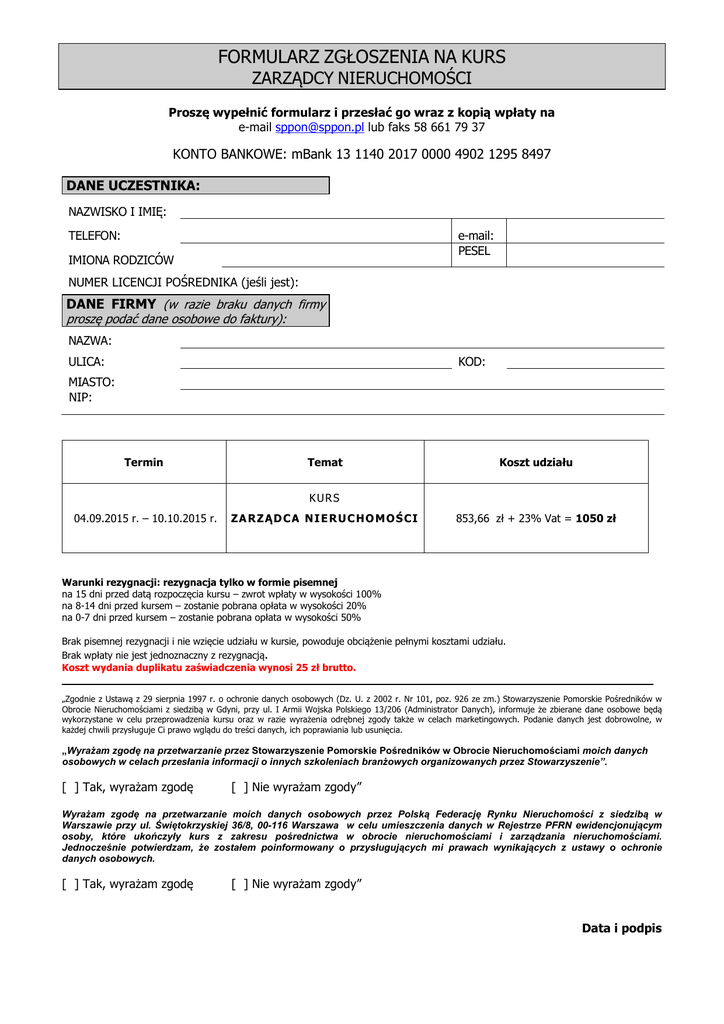 FORMULARZ ZGŁOSZENIA NA KURS ZARZĄDCY NIERUCHOMOŚCI Proszę wypełnić formularz i przesłać go wraz z kopią wpłaty na e-mail [email protected] lub faks 58 661 79 37 KONTO BANKOWE: mBank 13 1140 2017 0000 4902 1295 8497 DANE UCZESTNIKA: NAZWISKO I IMIĘ: TELEFON: e-mail: PESEL IMIONA RODZICÓW NUMER LICENCJI POŚREDNIKA (jeśli jest): DANE FIRMY (w razie braku danych firmy proszę podać dane osobowe do faktury): NAZWA: ULICA: KOD: MIASTO: NIP: Termin Temat Koszt udziału KURS 04.09.2015 r. – 10.10.2015 r. ZARZĄDCA NIERUCHOMOŚCI 853,66 zł + 23% Vat = 1050 zł Warunki rezygnacji: rezygnacja tylko w formie pisemnej na 15 dni przed datą rozpoczęcia kursu – zwrot wpłaty w wysokości 100% na 8-14 dni przed kursem – zostanie pobrana opłata w wysokości 20% na 0-7 dni przed kursem – zostanie pobrana opłata w wysokości 50% Brak pisemnej rezygnacji i nie wzięcie udziału w kursie, powoduje obciążenie pełnymi kosztami udziału. Brak wpłaty nie jest jednoznaczny z rezygnacją. Koszt wydania duplikatu zaświadczenia wynosi 25 zł brutto. „Zgodnie z Ustawą z 29 sierpnia 1997 r. o ochronie danych osobowych (Dz. U. z 2002 r. Nr 101, poz. 926 ze zm.) Stowarzyszenie Pomorskie Pośredników w Obrocie Nieruchomościami z siedzibą w Gdyni, przy ul. I Armii Wojska Polskiego 13/206 (Administrator Danych), informuje że zbierane dane osobowe będą wykorzystane w celu przeprowadzenia kursu oraz w razie wyrażenia odrębnej zgody także w celach marketingowych. Podanie danych jest dobrowolne, w każdej chwili przysługuje Ci prawo wglądu do treści danych, ich poprawiania lub usunięcia. „Wyrażam zgodę na przetwarzanie przez Stowarzyszenie Pomorskie Pośredników w Obrocie Nieruchomościami moich danych osobowych w celach przesłania informacji o innych szkoleniach branżowych organizowanych przez Stowarzyszenie”. [ ] Tak, wyrażam zgodę [ ] Nie wyrażam zgody” Wyrażam zgodę na przetwarzanie moich danych osobowych przez Polską Federację Rynku Nieruchomości z siedzibą w Warszawie przy ul. Świętokrzyskiej 36/8, 00-116 Warszawa w celu umieszczenia danych w Rejestrze PFRN ewidencjonującym osoby, które ukończyły kurs z zakresu pośrednictwa w obrocie nieruchomościami i zarządzania nieruchomościami. Jednocześnie potwierdzam, że zostałem poinformowany o przysługujących mi prawach wynikających z ustawy o ochronie danych osobowych. [ ] Tak, wyrażam zgodę [ ] Nie wyrażam zgody” Data i podpis