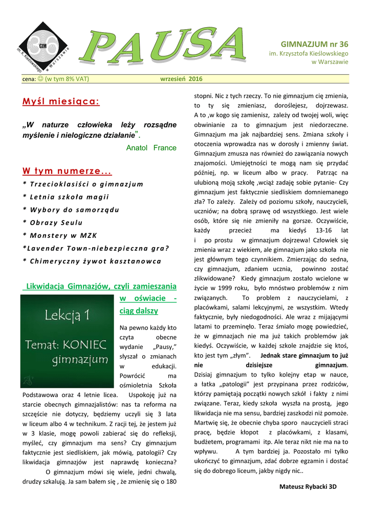 GIMNAZJUM nr 36 im. Krzysztofa Kieślowskiego w Warszawie cena: (w tym 8% VAT) wrzesień 2016 Myśl miesiąca: „W naturze człowieka leży rozsądne myślenie i nielogiczne działanie”. Anatol France W tym numerze... * Trzecioklasiści o gimnazjum * Letnia szkoła magii * Wybory do samorządu * Obrazy Seulu * Monstery w MZK *Lavender Town-niebezpieczna gra? * Chimeryczny żywot kasztanowca Likwidacja Gimnazjów, czyli zamieszania w oświacie ciąg dalszy Na pewno każdy kto czyta obecne wydanie „Pausy,” słyszał o zmianach w edukacji. Powrócić ma ośmioletnia Szkoła Podstawowa oraz 4 letnie licea. Uspokoję już na starcie obecnych gimnazjalistów: nas ta reforma na szczęście nie dotyczy, będziemy uczyli się 3 lata w liceum albo 4 w technikum. Z racji tej, że jestem już w 3 klasie, mogę powoli zabierać się do refleksji, myśleć, czy gimnazjum ma sens? Czy gimnazjum faktycznie jest siedliskiem, jak mówią, patologii? Czy likwidacja gimnazjów jest naprawdę konieczna? O gimnazjum mówi się wiele, jedni chwalą, drudzy szkalują. Ja sam bałem się , że zmienię się o 180 stopni. Nic z tych rzeczy. To nie gimnazjum cię zmienia, to ty się zmieniasz, doroślejesz, dojrzewasz. A to ,w kogo się zamienisz, zależy od twojej woli, więc obwinianie za to gimnazjum jest niedorzeczne. Gimnazjum ma jak najbardziej sens. Zmiana szkoły i otoczenia wprowadza nas w dorosły i zmienny świat. Gimnazjum zmusza nas również do zawiązania nowych znajomości. Umiejętności te mogą nam się przydać później, np. w liceum albo w pracy. Patrząc na ulubioną moją szkołę ,wciąż zadaję sobie pytanie- Czy gimnazjum jest faktycznie siedliskiem domniemanego zła? To zależy. Zależy od poziomu szkoły, nauczycieli, uczniów; na dobrą sprawę od wszystkiego. Jest wiele osób, które się nie zmieniły na gorsze. Oczywiście, każdy przecież ma kiedyś 13-16 lat i po prostu w gimnazjum dojrzewa! Człowiek się zmienia wraz z wiekiem, ale gimnazjum jako szkoła nie jest głównym tego czynnikiem. Zmierzając do sedna, czy gimnazjum, zdaniem ucznia, powinno zostać zlikwidowane? Kiedy gimnazjum zostało wcielone w życie w 1999 roku, było mnóstwo problemów z nim związanych. To problem z nauczycielami, z placówkami, salami lekcyjnymi, ze wszystkim. Wtedy faktycznie, były niedogodności. Ale wraz z mijającymi latami to przeminęło. Teraz śmiało mogę powiedzieć, że w gimnazjach nie ma już takich problemów jak kiedyś. Oczywiście, w każdej szkole znajdzie się ktoś, kto jest tym „złym”. Jednak stare gimnazjum to już nie dzisiejsze gimnazjum. Dzisiaj gimnazjum to tylko kolejny etap w nauce, a łatka „patologii” jest przypinana przez rodziców, którzy pamiętają początki nowych szkół i fakty z nimi związane. Teraz, kiedy szkoła wyszła na prostą, jego likwidacja nie ma sensu, bardziej zaszkodzi niż pomoże. Martwię się, że obecnie chyba sporo nauczycieli straci pracę, będzie kłopot z placówkami, z klasami, budżetem, programami itp. Ale teraz nikt nie ma na to wpływu. A tym bardziej ja. Pozostało mi tylko ukończyć to gimnazjum, zdać dobrze egzamin i dostać się do dobrego liceum, jakby nigdy nic.. Mateusz Rybacki 3D Letnia Szkoła Magii kocha HP albo chce poznać ten magiczny świat. Więcej możecie dowiedzieć się na stronie koloniena5.pl Karolina Kupiec 3A Szkoła zaczęła się już na dobre, ale większość z Nas pewnie wciąż wspomina wakacje. W tym roku przeżyłam tak niesamowite chwile, że aż proszą się o opisanie . Od razu zaznaczę, że jestem książkoholikiem, więc nikogo nie powinno zdziwić, iż część tegorocznych wakacji spędziłam w Letniej Szkole Magii – obozie dla fanów Harry’ego Pottera (HP). Przez dwa tygodnie mieszkaliśmy w Zamku Czocha, położonym na Dolnym Śląsku. Zamek owiany jest tajemnicą, nie jest tak zwykły, jak się wydaje. Można tam znaleźć tak zwane „tajne przejścia”, które tak naprawdę są dawnymi przejściami dla służby. Prawda o tym zamku jeszcze długo pozostanie ukryta. (Pamiętajcie! – Nie ufajcie przewodnikom!) Wracając do kolonii - polegały one w dużej mierze na roleplay’u, czyli, krótko mówiąc, na wczuciu się w rolę i drobnej grze aktorskiej np. jeśli ktoś rzucił na ciebie zaklęcie, musisz udawać, że naprawdę zadziałało. Jak sama nazwa mówi, była to szkoła, więc były też lekcje. Na starożytnych runach uczyliśmy się pisać Futharkiem – skandynawskim pismem runicznym. Były też zajęcia z demonologii, gdzie uczyliśmy się mitologii słowiańskiej i o stworach w niej występujących oraz lekcje o magicznych stworzeniach, na których omawialiśmy typowe zwierzęta z HP np. hipogryf, śmierciotula, deminoz. Mieliśmy też lekcje, takie jak: smokologia, szyfrologia, zaklęcia, alchemia, matamorfomagia i wiele innych. Nie zabrakło również zajęć sportowych – graliśmy w mugolską wersję popularnego wśród wszystkich czarodziejów Quidditch’a. Ale nie myślcie, że całe kolonie to tylko nauka. Wystawialiśmy grupowe przedstawienia, prowadziliśmy debaty, urządziliśmy bal klimatyczny, graliśmy w różne gry. Ogólnie mówiąc ten obóz jest jedną z najlepszych rzeczy, jakie mnie spotkały – świetnie się bawiłam, dowiedziałam się wielu ciekawych informacji, poznałam wielu miłych ludzi i znalazłam swoją bratnią duszę. Podsumowując, mogę polecić Letnią Szkołę Magii każdemu , kto lubi bądź Nasze szkolne wybory URM 29 września odbyły się w naszej szkole wybory na przewodniczącego samorządu szkolnego, co wywołało spore emocje, bo przed wyborami odbyła się bardzo ciekawa i merytoryczna kampania, dzięki której uczniowie mogli poznać wizję naszej szkoły każdego kandydata. W wyborach brało udział 4 kandydatów, po dwóch przedstawicieli każdej płci z klas II i III. Po emocjonującej walce, przewodniczącym samorządu została Zofia Wroniecka. Pozostali kandydaci po wyrównanej walce musiel