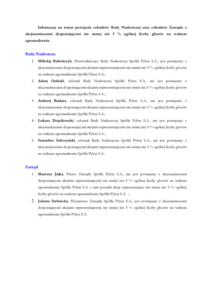 Informacja na temat powiązań członków Rady Nadzorczej oraz członków Zarządu z akcjonariuszami dysponującymi nie mniej niż 5 % ogólnej liczby głosów na walnym zgromadzeniu: Rada Nadzorcza 1. Mikołaj Rubeńczyk, Przewodniczący Rady Nadzorczej Spółki Pylon S.A., jest powiązany z akcjonariuszami dysponującymi akcjami reprezentującymi nie mniej niż 5 % ogólnej liczby głosów na walnym zgromadzeniu Spółki Pylon S.A.; 2. Adam Osiński, członek Rady Nadzorczej Spółki Pylon S.A., nie jest powiązany z akcjonariuszami dysponującymi akcjami reprezentującymi nie mniej niż 5 % ogólnej liczby głosów na walnym zgromadzeniu Spółki Pylon S.A.; 3. Andrzej Budasz, członek Rady Nadzorczej Spółki Pylon S.A., nie jest powiązany z akcjonariuszami dysponującymi akcjami reprezentującymi nie mniej niż 5 % ogólnej liczby głosów na walnym zgromadzeniu Spółki Pylon S.A.; 4. Łukasz Drązikowski, członek Rady Nadzorczej Spółki Pylon S.A., nie jest powiązany z akcjonariuszami dysponującymi akcjami reprezentującymi nie mniej niż 5 % ogólnej liczby głosów na walnym zgromadzeniu Spółki Pylon S.A.; 5. Stanisław Sobczyński, członek Rady Nadzorczej Spółki Pylon S.A., nie jest powiązany z akcjonariuszami dysponującymi akcjami reprezentującymi nie mniej niż 5 % ogólnej liczby głosów na walnym zgromadzeniu Spółki Pylon S.A.. Zarząd 1. Mateusz Jujka, Prezes Zarządu Spółki Pylon S.A., nie jest powiązany z akcjonariuszami dysponującymi akcjami reprezentującymi nie mniej niż 5 % ogólnej liczby głosów na walnym zgromadzeniu Spółki Pylon S.A. i sam posiada akcje reprezentujące nie mniej niż 5 % ogólnej liczby głosów na walnym zgromadzeniu Spółki Pylon S.A. ; 2. Jolanta Srebnicka, Wiceprezes Zarządu Spółki Pylon S.A., jest powiązany z akcjonariuszami dysponującymi akcjami reprezentującymi nie mniej niż 5 % ogólnej liczby głosów na walnym zgromadzeniu Spółki Pylon S.A..