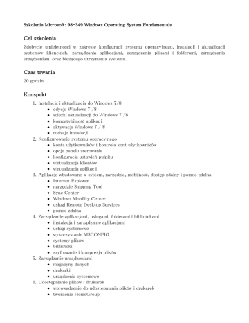 Szkolenie Microsoft: 98-349 Windows Operating System Fundamentals Cel szkolenia Zdobycie umiejętności w zakresie konfiguracji systemu operacyjnego, instalacji i aktualizacji systemów klienckich, zarządzania aplikacjami, zarządzania plikami i folderami, zarządzania urządzeniami oraz bieżącego utrzymania systemu. Czas trwania 20 godzin Konspekt 1. Instalacja i aktualizacja do Windows 7/8 edycje Windows 7 /8 ścieżki aktualizacji do Windows 7 /8 kompatybilność aplikacji aktywacja Windows 7 / 8 rodzaje instalacji 2. Konfigurowanie systemu operacyjnego konta użytkowników i kontrola kont użytkowników opcje panelu sterowania konfiguracja ustawień pulpitu wirtualizacja klientów wirtualizacja aplikacji 3. Aplikacje wbudowane w system, narzędzia, mobilność, dostęp zdalny i pomoc zdalna Internet Explorer narzędzie Snipping Tool Sync Center Windows Mobility Center usługi Remote Desktop Services pomoc zdalna 4. Zarządzanie aplikacjami, usługami, folderami i bibliotekami instalacja i zarządzanie aplikacjami usługi systemowe wykorzystanie MSCONFIG systemy plików biblioteki szyfrowanie i kompresja plików 5. Zarządzanie urządzeniami magazyny danych drukarki urządzenia systemowe 6. Udostępnianie plików i drukarek wprowadzenie do udostępniania plików i drukarek tworzenie HomeGroup tworzenie zasobów udostępnianych publicznie, prostych i zaawansowanych mapowanie urządzeń uprawnienia udostępnianie drukarek rozwiązywanie problemów z drukarkami 7. Utrzymanie, aktualizacja i ochrona Windows 7 / 8 wbudowane w system narzędzia do utrzymywania Windows 7 / 8 utrzymanie rejestru Windows aktualizacja systemu ochrona systemu 8. Kopie zapasowe i metody odzyskiwania wprowadzenie do tematyki kopii zapasowych tworzenie obrazu systemu tworzenie dysku naprawczego odtwarzanie systemu opcje startowe systemu Wymagania nie ma wymagań wstępnych dla szkolenia Certyfikaty Uczestnicy szkolenia mają możliwość przystąpienia do egzaminu certyfikacyjnego MTA 98-349 Windows Operating System Fundamentals CZAS TRWANIA: 20 godzin