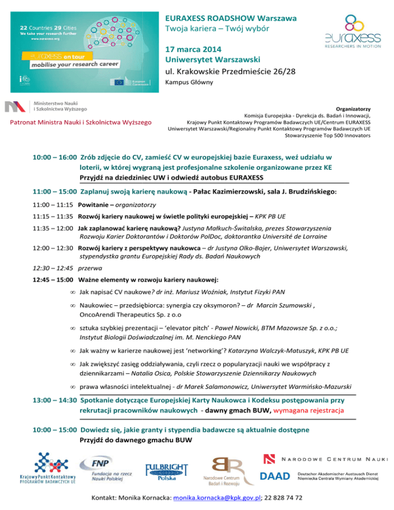 EURAXESS ROADSHOW Warszawa Twoja kariera – Twój wybór 17 marca 2014 Uniwersytet Warszawski ul. Krakowskie Przedmieście 26/28 Kampus Główny Patronat Ministra Nauki i Szkolnictwa Wyższego Organizatorzy Komisja Europejska - Dyrekcja ds. Badań i Innowacji, Krajowy Punkt Kontaktowy ktowy Programów Badawczych UE/Centrum UE/ EURAXESS Uniwersytet Warszawski/Regionalny Regionalny Punkt Kontaktowy Programów Badawczych UE Stowarzyszenie Top 500 Innovators 10:00 – 16:00 Zrób zdjęcie do CV,, zamieść CV w europejskiej bazie Euraxess, weź udziału w loterii, w której wygraną jest profesjonalne szkolenie organizowane przez KE Przyjdź na dziedziniec ziedziniec UW i odwiedź autobus EURAXESS 11:00 – 15:00 Zaplanuj swoją karierę naukową - Pałac Kazimierzowski, sala J. Brudzińskiego: 11:00 – 11:15 Powitanie – organizatorzy 11:15 – 11:35 Rozwój kariery naukowej w świetle polityki europejskiej – KPK PB UE 11:35 – 12:00 Jak zaplanować karierę naukową? naukową Justyna Małkuch-Świtalska, prezes Stowarzyszenia Rozwoju Karier Doktorantów i Doktorów PolDoc, doktorantka Université de Lorraine 12:00 – 12:30 Rozwój kariery z perspektywy naukowca – dr Justyna Olko-Bajer, Uniwersytet Warszawski, stypendystka grantu Europejskiej E Rady ds. Badań Naukowych 12:30 – 12:45 przerwa naukowej 12:45 – 15:00 Ważne elementyy w rozwoju kariery naukowej: • Jak ak napisać CV naukowe? naukowe dr inż. Mariusz Woźniak, Instytut Fizyki PAN • Naukowiec – przedsiębiorca: rzedsiębiorca: synergia czy oksymoron? – dr Marcin Szumowski , OncoArendi Therapeutics Sp. z o.o • sztuka szybkiej prezentacji – ‘elevator pitch’ - Paweł Nowicki, BTM Mazowsze Sp. z o.o.; Instytut tut Biologii Doświadczalnej im. M. Nenckiego PAN • Jak ak ważny w karierze naukowej jest ‘networking’? Katarzyna Walczyk--Matuszyk, KPK PB UE • Jak zwiększyć zasięg oddziaływania, czyli rzecz o popularyzacji nauki we współpracy z dziennikarzami – Natalia Osica, Osica, Polskie Stowarzyszenie Dziennikarzy Naukowych • prawa własności intelektualnej - dr Marek Salamonowicz, Uniwersytet Warmińsko-Mazurski Warmińsko 13:00 – 14:30 Spotkanie dotyczące Europejskiej Karty Naukowca i Kodeksu postępowania przy rekrutacji pracowników naukowych - dawny gmach BUW, wymagana rejestracja 10:00 – 15:00 Dowiedz się, jakie granty i stypendia badawcze są aktualnie dostępne Przyjdź do dawnego gmachu BUW Kontakt: Monika Kornacka: [email protected]; 22 828 74 72