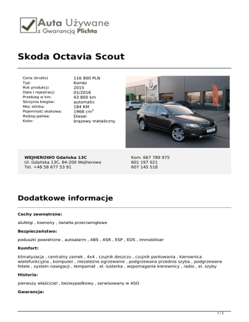 Skoda Octavia Scout Cena (brutto) Typ: Rok produkcji: Data I rejestracji: Przebieg w km: Skrzynia biegów: Moc silnika: Pojemność skokowa: Rodzaj paliwa: Kolor: 116 900 PLN Kombi 2015 01/2016 43 800 km automatic 184 KM 1968 cm3 Diesel brązowy metaliczny WEJHEROWO Gdańska 13C Ul. Gdańska 13C, 84-200 Wejherowo Tel. +48 58 677 53 91 Kom. 667 789 975 601 197 021 607 145 518 Dodatkowe informacje Cechy zewnętrzne: alufelgi , ksenony , światła przeciwmgłowe Bezpieczeństwo: poduszki powietrzne , autoalarm , ABS , ASR , ESP , EDS , immobiliser Komfort: klimatyzacja , centralny zamek , 4x4 , czujnik deszczu , czujnik parkowania , kierownica wielofunkcyjna , komputer , niezależne ogrzewanie , podgrzewana przednia szyba , podgrzewane fotele , system nawigacji , tempomat , el. lusterka , wspomaganie kierownicy , radio , el. szyby Historia: pierwszy właściciel , bezwypadkowy , serwisowany w ASO Gwarancja: 1/2 Gwarancja Fabryczna Gwarancja Szanowni Państwo, Pragniemy Państwa poinformować, iż firma Plichta – Autoryzowany Dealer Škoda Auto prowadzi skup oraz sprzedaż samochodów używanych wszystkich marek, oferując także samochody używane z gwarancją objęte programem „Auta używane z Gwarancją Plichta”. W ramach programu „Auta Używane z Gwarancją Plichta ” każdy Klient otrzymuje atrakcyjny pakiet zniżek pozwalający zoptymalizować koszty eksploatacji samochodu: -50% na serwis klimatyzacji -50% na ustawienie zbieżności -50% na kosmetykę auta -50% na ścieżkę diagnostyczną -25% na wymiany oleju -25% na zakup opon + 5zł na sezon za hotelowanie opon -15% na części i akcesoria Oferujemy również kompleksową obsługę w zakresie finansowania i ubezpieczenia: - kredyty już od 4,99% - leasingi i kredyty bez zaświadczeń - uproszczone procedury – decyzja już od 30 min. - atrakcyjne pakiety AC/OC/NW/ASS wiodących firm ubezpieczeniowych Możliwość pozostawienia dotychczas użytkowanego auta w rozliczeniu – BEZPŁATNA WYCENA!!! Zapraszamy wszystkich Klientów na jazdę próbną wybranym autem. Numer oferty: A885 Informacja nie stanowi oferty w rozumieniu art. 66 KC. Podane dane mają charakter wyłącznie informacyjny. 2/2 Powered by TCPDF (www.tcpdf.org)