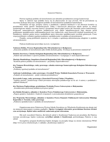Szanowni Państwo, Prawna regulacja podatku od nieruchomości jest aktualnie przedmiotem szeregu kontrowersji. Spory w zakresie tego podatku toczy się na płaszczyźnie de lege ferenda. Od lat prowadzone są ożywione dyskusje dotyczące zastąpienia podatku od nieruchomości podatkiem katastralnym. Niezależnie od tego, przepisy ustawy o podatkach i opłatach lokalnych w ich obecnym kształcie są przedmiotem wielu sporów interpretacyjnych. Jedną z kluczowych płaszczyzn takich sporów są relacje terminologiczne między rzeczoną ustawą a przepisami innych gałęzi prawa jak chociażby prawa budowlanego. Większość samorządowych organów podatkowych oraz sądów administracyjnych staje obecnie przed problemami opodatkowania telekomunikacyjnych sieci kablowych, stacji bazowych telefonii komórkowej etc. Dodatkowo, niektóre gminy toczą z podatnikami spory dotyczące opodatkowania wyrobisk górniczych. Coraz więcej problemów wzbudza regulacja podstawy opodatkowania w podatku od nieruchomości. Ponadto, szereg problemów pojawia się w związku z egzekucją administracyjną zaległości w podatku od nieruchomości. Podczas konferencji przewiduje się m.in. wystąpienia: Tadeusza Dobka, Prezesa Regionalnej Izby Obrachunkowej w Bydgoszczy „Znaczenie podatku od nieruchomości jako źródła dochodu gminy. Ewolucja na przestrzeni ostatnich lat” Daniela Jurewicza, Członka Kolegium Regionalnej Izby Obrachunkowej w Bydgoszczy „Nadzór nad uchwałami w sprawie podatku od nieruchomości i występujące w nich nieprawidłowości” Macieja Słomińskiego, Inspektora Kontroli Regionalnej Izby Obrachunkowej w Bydgoszczy "Kontrola poboru podatku od nieruchomości - przykłady nieprawidłowości" dra Tomasza Brzezickiego, radcy prawnego, członka etatowego Samorządowego Kolegium Odwoławczego w Toruniu, „Problemy egzekucji podatku od nieruchomości” Andrzeja Ladzińskiego, radcy prawnego z Grynhoff Woźny Maliński Kancelaria Prawna w Warszawie „Podatek od nieruchomości – punkt widzenia przedsiębiorcy” Krzysztofa Lange, radcy prawnego z Kancelarii Prawnej Chałas i Wspólnicy "Aspekty prawne i kontrowersje wokół powstania obowiązku podatkowego na tle art. 6 ustawy o podatkach i opłatach lokalnych" dra Mariusza Popławskiego, prodziekana Wydziału Prawa Uniwersytetu w Białymstoku „Kształtowanie preferencji podatkowych przez gminy” dra Rafała Dowgiera, adiunkta w Katedrze Prawa Podatkowego Uniwersytetu w Białymstoku, „Pojęcie gruntów, budynków i budowli związanych w prowadzeniem działalności gospodarczej” dra Wojciecha Morawskiego, adiunkta w Katedrze Prawa Finansów Publicznych Uniwersytetu Mikołaja Kopernika w Toruniu, radcy prawnego „Podstawa opodatkowania w podatku od nieruchomości”. Organizowana przez Państwową Wyższą Szkołę Zawodową we Włocławku Konferencja ma okazję stać się miejscem interesującej wymiany poglądów. Oprócz wystąpień referentów przewidziano bowiem również czas na dyskusje. Będzie także możliwość zadawania pytań referentom. Dla tych wszystkich Państwa, dla których udział w Konferencji Naukowej jest przydatny dla Państwa rozwoju zawodowego, będzie wydawany certyfikat udziału w Konferencji, potwierdzający Państwa w niej udział. Szczegółowy program Konferencji będzie dostępny na początku lutego na stronie internetowej PWSZ (http://www.pwsz.wloclawek.pl), w zakładce „Konferencje naukowe”. Organizator 87-800 Włocławek ul. 3-go Maja 17 tel.(054) 231 60 80 fax. (054) 231 43 52 e-mail: [email protected] www.pwsz.wloclawek.pl PAŃSTWOWA WYŻSZA SZKOŁA ZAWODOWA WE WŁOCŁAWKU PODATEK OD NIERUCHOMOŚCI – AKTUALNE PROBLEMY TEORII I PRAKTYKI 23 lutego 2010r. - Włocławek Organizator: Państwowa Wyższa Szkoła Zawodowa we Włocławku Instytut Nauk Społecznych i Informatyki Zakład Administracji ul. Mechaników 3 87-800 Włocławek Faks: (54) 231 43 52 Sekretarz konferencji: mgr Jacek Pakuła tel.: 603 692 778 e-mail: [email protected] Opłata konferencyjna: Opłatę konferencyjną w wysokości 150 zł należy uiścić do dnia 5 lutego 2010 r. na poniższy rachunek bankowy PWSZ we Włocławku: 72 1540 1069 2001 8720 6079 0001 Tytuł wpłaty ,,Konferencja - Podatek od nieruchomości 2010” W przypadku rezygnacji z udziału w Konferencji uiszczona opłata nie podlega zwrotowi. Kalendarz: do 5 lutego 2010 r. zgłoszenie udziału pocztą zwykłą, pocztą elektroniczną lub faksem oraz uiszczenie opłaty konferencyjnej początek lutego – publikacja na stronie http://www.pwsz.wloclawek.pl (zakładka „Konferencje naukowe”) szczegółowego harmonogramu Konferencji 23 lutego – konferencja – aula Państwowej Wyższej Szkoły Zawodowej we Włocławku, ul. Obrońców Wisły 1920 r. 21/25, Włocławek: - godz. 9.45 – rejestracja uczestników - godz. 10.00 – rozpoczęcie Konferencji