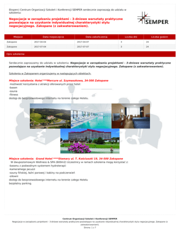 Eksperci Centrum Organizacji Szkoleń i Konferencji SEMPER serdecznie zapraszają do udziału w szkoleniu: Negocjacje w zarządzaniu projektami - 3-dniowe warsztaty praktyczne pozwalające na uzyskanie indywidualnej charakterystyki stylu negocjacyjnego. Zakopane (z zakwaterowaniem). Miejsce Data rozpoczęcia Data zakończenia Liczba dni Liczba godzin Zakopane 2017-04-04 2017-04-07 3 24 Zakopane 2017-07-04 2017-07-07 3 24 Opis szkolenia: Serdecznie zapraszamy do udziału w szkoleniu: Negocjacje w zarządzaniu projektami - 3-dniowe warsztaty praktyczne pozwalające na uzyskanie indywidualnej charakterystyki stylu negocjacyjnego. Zakopane (z zakwaterowaniem). Szkolenia w Zakopanem organizujemy w następujących obiektach: Miejsce szkolenia: Hotel ***Mercure ul. Szymaszkowa, 34-500 Zakopane możliwość korzystania z atrakcji oferowanych przez hotel: -basen -sauna -fitness dostęp do bezprzewodowego internetu na terenie całego Hotelu. Miejsce szkolenia: Grand Hotel ****Stamary ul. T. Kościuszki 19, 34-500 Zakopane W dwupoziomowym Wellness & SPA (600m2) Uczestnicy w ramach szkolenia mogą korzystać z: -basenu z podwodnym systemem hydroterapii -kameralnego jacuzzi -sauny fińskiej, łaźni parowej i kabiny na podczerwień -siłowni dostęp do bezprzewodowego internetu na terenie całego Hotelu bezpłatny parking. Centrum Organizacji Szkoleń i Konferencji SEMPER Negocjacje w zarządzaniu projektami - 3-dniowe warsztaty praktyczne pozwalające na uzyskanie indywidualnej charakterystyki stylu negocjacyjnego. Zakopane (z zakwaterowaniem). Strona: 1 z 7 *W szczególnych przypadkach Organizator zastrzega sobie prawo do zmiany hotelu, w którym odbędzie się szkolenie, na hotel o takim samym lub wyższym standardzie i nie stanowi to zmiany warunków umowy. FORMULARZ ZGŁOSZENIA DO POBRANIA Grupa docelowa: Szkolenie w szczególności kierowane jest do: ·obecnych i przyszłych kierowników projektów, ·uczestników zespołów realizujących projekty w organizacjach, ·menedżerów zaangażowanych w proces wsparcia i nadzoru kierownika projektu. ·przedstawicieli Biur Projektów. Szkolenie to jest propozycją dla osób zarówno realizujących projekty, jak również dla osób bez doświadczenia, które dopiero przygotowują się do zarządzania swoim pierwszym przedsięwzięciem. Cel szkolenia: Umiejętność negocjowania ma nieocenione znaczenie dla wszystkich kierowników projektu i liderów zmian. Negocjują oni nie tylko warunki umów z poszczególnymi dostawcami i kontrahentami, ale także przez cały cykl życia projektu muszą skutecznie negocjować z głównymi interesariuszami, klientami i członkami swoich zespołów tak, aby zrealizować wymagania i zakres projektu. Warsztat pomoże zrozumieć, jak analizować styl negocjowania, jak rozwiązywać pojawiające się konflikty i wykorzystywać je dla swoich celów oraz jak skutecznie prowadzić same negocjacje w zależności od etapu danego projektu. Naszą ambicją jest przedstawienie nie tylko i wyłącznie samego procesu negocjacyjnego, ale pokazanie na praktycznych przykładach biznesowych jakie taktyki negocjacyjne mogą być stosowane i jakie rodzą one konsekwencje. Uczestnicy uzyskają wiele cennych wskazówek i informacji zwrotnych od trenera, który na co dzień realizuje projekty i zarządza bardzo często sprzecznymi oczekiwaniami. Korzyści dla uczestników: Centrum Organizacji Szkoleń i Konferencji SEMPER Negocjacje w zarządzaniu projektami - 3-dniowe warsztaty praktyczne pozwalające na uzyskanie indywidualnej charakterystyki stylu negocjacyjnego. Zakopane (z zakwaterowaniem). Strona: 2 z 7 Uzyskanie przez uczestników podstawowych umiejętności negocjacyjnych w warunkach realizowanego projektu. Przygotowanie elastycznego stanowiska, bezpieczne otwarcie, identyfikacja impasu oraz wybór właściwej taktyki jego przełamania. Manipulacje negocjacyjne dla kierowników projektu i obrona przed chwytami manipulacyjnymi. Uzyskanie indywidualnej charakterystyki stylu negocjacyjnego. Zdobycie umiejętności radzenia sobie z manipulacją ze strony partnerów negocjacyjnych oraz skuteczne i etyczne wywieranie na nich wpływu. Metodologia: Zajęcia są prowadzone w formie interaktywnej, z wykorzystaniem następujących metod szkoleniowych: ·Warsztaty, prezentacje, praca zespołowa, konsultacje indywidualne, burza mózgów, case study, dyskusja nad osiągniętymi wynikami. ·Projekt warsztatów ma charakter autorski i został opracowany w oparciu o doświadczenia praktyczne trenera, wynikające ze współpracy z organizacjami przy prowadzeniu projektów, w ramach których wykorzystywano analizę biznesową. ·Uczestnicy mogą liczyć na praktyczny i przystępny komentarz w odniesieniu do prezentowanego materiału, również z perspektywy własnej organizacji i problemów. Trener: dr inż Martin Daliga Specjalizacja trenerska: Jest ekspertem w zakresie zarządzania projektami. Jako niestrudzony propagator przywództwa sytuacyjnego Kennetha Blancharda skutecznie zarządzał zespołami interdyscyplinarnymi. Na przestrzeni ostatnich kilkunastu lat pracował z zespołami realizującymi projekty o budżetach sięgających ponad 10 mln zł. Pełnił szereg funkcji i ról w największych polskich przedsiębiorstwach, najbardziej dumny jest z udziału swojego zespołu w projektach związanych z optymalizacją procesów biznesowych i zwiększaniem ich konkurencyjności. Posiada kilkuletnią praktykę trenerską w kreowaniu wartości biznesowych i zarządzania ograniczeniami. Akredytowany trener metodyki PRINCE2? (PRINCE2? Approved Trainer). Specjalizacja: zarządzanie projektami, wykorzystanie metodyk zarządzania projektami PCM, PMBoK, PRINCE2, Agile, SCRUM do optymalizacji działań biznesowych. Trener: Tomasz Kurek Specjalizacja trenerska: Przedsiębiorca, menadżer, trener biznesu i doradca z dziesięcioletnim stażem w zakresie zarządzania organizacjami i zespołami projektowymi. Członek Zarządu Agencji Rozwoju Innowacji SA, odpowied