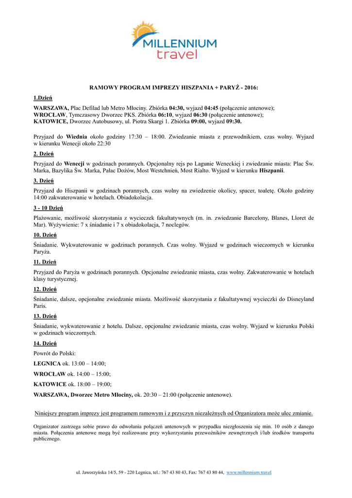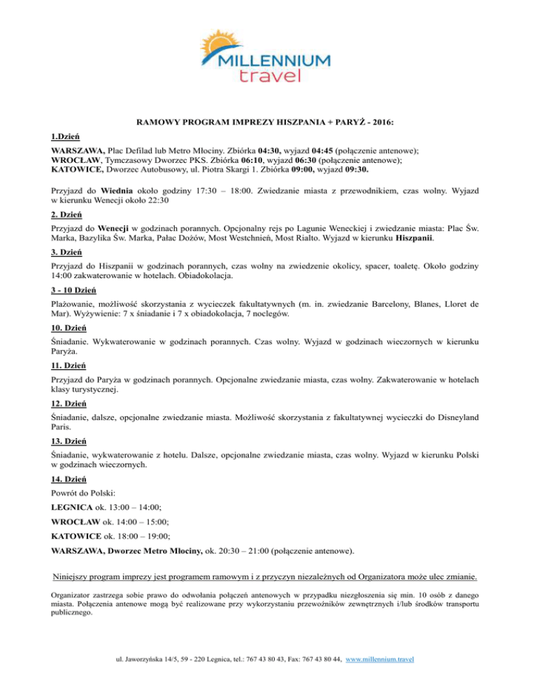 RAMOWY PROGRAM IMPREZY HISZPANIA + PARYŻ - 2016: 1.Dzień WARSZAWA, Plac Defilad lub Metro Młociny. Zbiórka 04:30, wyjazd 04:45 (połączenie antenowe); WROCŁAW, Tymczasowy Dworzec PKS. Zbiórka 06:10, wyjazd 06:30 (połączenie antenowe); KATOWICE, Dworzec Autobusowy, ul. Piotra Skargi 1. Zbiórka 09:00, wyjazd 09:30. Przyjazd do Wiednia około godziny 17:30 – 18:00. Zwiedzanie miasta z przewodnikiem, czas wolny. Wyjazd w kierunku Wenecji około 22:30 2. Dzień Przyjazd do Wenecji w godzinach porannych. Opcjonalny rejs po Lagunie Weneckiej i zwiedzanie miasta: Plac Św. Marka, Bazylika Św. Marka, Pałac Dożów, Most Westchnień, Most Rialto. Wyjazd w kierunku Hiszpanii. 3. Dzień Przyjazd do Hiszpanii w godzinach porannych, czas wolny na zwiedzenie okolicy, spacer, toaletę. Około godziny 14:00 zakwaterowanie w hotelach. Obiadokolacja. 3 - 10 Dzień Plażowanie, możliwość skorzystania z wycieczek fakultatywnych (m. in. zwiedzanie Barcelony, Blanes, Lloret de Mar). Wyżywienie: 7 x śniadanie i 7 x obiadokolacja, 7 noclegów. 10. Dzień Śniadanie. Wykwaterowanie w godzinach porannych. Czas wolny. Wyjazd w godzinach wieczornych w kierunku Paryża. 11. Dzień Przyjazd do Paryża w godzinach porannych. Opcjonalne zwiedzanie miasta, czas wolny. Zakwaterowanie w hotelach klasy turystycznej. 12. Dzień Śniadanie, dalsze, opcjonalne zwiedzanie miasta. Możliwość skorzystania z fakultatywnej wycieczki do Disneyland Paris. 13. Dzień Śniadanie, wykwaterowanie z hotelu. Dalsze, opcjonalne zwiedzanie miasta, czas wolny. Wyjazd w kierunku Polski w godzinach wieczornych. 14. Dzień Powrót do Polski: LEGNICA ok. 13:00 – 14:00; WROCŁAW ok. 14:00 – 15:00; KATOWICE ok. 18:00 – 19:00; WARSZAWA, Dworzec Metro Młociny, ok. 20:30 – 21:00 (połączenie antenowe). Niniejszy program imprezy jest programem ramowym i z przyczyn niezależnych od Organizatora może ulec zmianie. Organizator zastrzega sobie prawo do odwołania połączeń antenowych w przypadku niezgłoszenia się min. 10 osób z danego miasta. Połączenia antenowe mogą być realizowane przy wykorzystaniu przewoźników zewnętrznych i/lub środków transportu publicznego. ul. Jaworzyńska 14/5, 59 - 220 Legnica, tel.: 767 43 80 43, Fax: 767 43 80 44, www.millennium.travel
