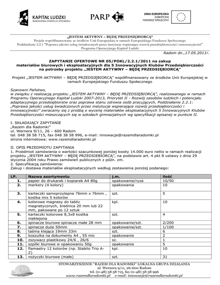 „JESTEM AKTYWNY – BĘDĘ PRZEDSIĘBIORCĄ” Projekt współfinansowany ze środków Unii Europejskiej w ramach Europejskiego Funduszu Społecznego Poddziałanie 2.2.1 "Poprawa jakości usług świadczonych przez instytucje wspierające rozwój przedsiębiorczości i innowacyjności" Programu Operacyjnego Kapitał Ludzki Radom dn.,17.05.2011r. ZAPYTANIE OFERTOWE NR 05/POKL/2.2.1/2011 na zakup materiałów biurowych i eksploatacyjnych dla 5 Innowacyjnych Klubów Przedsiębiorczości na potrzeby projektu „JESTEM AKTYWNY – BĘDĘ PRZEDSIĘBIORCĄ” Projekt „JESTEM AKTYWNY – BĘDĘ PRZEDSIĘBIORCĄ” współfinansowany ze środków Unii Europejskiej w ramach Europejskiego Funduszu Społecznego Szanowni Państwo, w związku z realizacją projektu „JESTEM AKTYWNY – BĘDĘ PRZEDSIĘBIORCĄ”, realizowanego w ramach Programu Operacyjnego Kapitał Ludzki 2007-2013, Priorytet II - Rozwój zasobów ludzkich i potencjału adaptacyjnego przedsiębiorstw oraz poprawa stanu zdrowia osób pracujących, Poddziałanie 2.2.1: „Poprawa jakości usług świadczonych przez instytucje wspierające rozwój przedsiębiorczości i innowacyjności” zwracamy się z prośbą o wycenę materiałów eksploatacyjnych 5 Innowacyjnych Klubów Przedsiębiorczości mieszczących się w szkołach gimnazjalnych wg specyfikacji opisanej w punkcie II. I. SKŁADAJĄCY ZAPYTANIE „Razem dla Radomki” ul. Wernera 9/11, 26 – 600 Radom tel. 048 38 58 715, fax 048 38 58 996, e-mail: [email protected] strona internetowa: www.razemdlaradomki.pl II. OPIS PRZEDMIOTU ZAPYTANIA 1. Przedmiot zamówienia o wartości szacunkowej poniżej kwoty 14.000 euro netto w ramach realizacji projektu „JESTEM AKTYWNY – BĘDĘ PRZEDSIEBIORCĄ”, na podstawie art. 4 pkt 8 ustawy z dnia 29 stycznia 2004 roku Prawo zamówień publicznych z późn. zm. 2. Specyfikacją zamówienia: Zakup i dostawa materiałów eksploatacyjnych według zestawienia poniżej podanego: LP. 1. 2. 3. 4. 5. 6. 7. 8. 9. 10. 11. 12. 13. Nazwa asortymentu papier do drukarek i kopiarek A4 80g markery (4 kolory) j.m. opakowanie/ryza opakowania ilość 10/50 10 karteczki samoprzylepne 76mm x 76mm , kostka mix 5 kolorów kolorowe magnesy do tablic magnetycznych, średnica 20 mm lub 22 mm, pakowane po 12 sztuk karteczki kolorowe 8,3x8 kostka nieklejona spinacze biurowe spinacze małe 28 mm spinacze duże 50mm taśma klejąca 19mm 33m koszulka na dokumenty A4 , 55 mic zszywacz plastikowy 24/6 , 26/6 szpilki biurowe w opakowaniu 50g flamastry 12 kolorów (np. Stabilo Trio AZ) nożyczki biurowe (małe) szt. 5 kpl. 10 szt. 4 opakowanie/szt. opakowanie/szt. szt. opakowanie sz. opakowanie kpl. 2/200 1/100 6 2 1 5 10 szt. 31 STOWARZYSZENIE "RAZEM DLA RADOMKI" LOKALNA GRUPA DZIAŁANIA ul. Wernera 9/11, 26-600 Radom tel. (0-48) 38 58 715, fax (0-48) 38 58 996 www.razemdlaradomki.pl e-mail: [email protected] „JESTEM AKTYWNY – BĘDĘ PRZEDSIĘBIORCĄ” Projekt współfinansowany ze środków Unii Europejskiej w ramach Europejskiego Funduszu Społecznego Poddziałanie 2.2.1 "Poprawa jakości usług świadczonych przez instytucje wspierające rozwój przedsiębiorczości i innowacyjności" Programu Operacyjnego Kapitał Ludzki 14. teczka z gumką A4 biała szt. 5 15. blok techniczny A4 szt. 29 16. blok techniczny A3 szt. 7 17. papier kolorowy ksero A4 80g opakowanie 10 18. segregator A4 75 mm z mechanizmem szt. 9 19. blok rysunkowy A-4 biały szt. 13 20. blok rysunkowy A-3 biały 11 21. brystol kolorowy A1(70x100) do wyboru szt. 50 różne kolory 22. brystol biały A1(70x100) do wyboru różne szt. 50 kolory 23. papier pakowy B1 szary opakowanie/szt. 1/100 24. farby plakatowe (6 kolorów) opakowanie 8 25. pinezki opakowanie 7 26. bibuła kolorowa zestaw/szt. 1/10 27. tablica korkowa 100 x 120, 8 mm szt. 5 3. Wartość zamówienia zostanie określona na podstawie przedstawionych ceny realizacji całego zamówienia. 4. Koszty dostawy pokrywa Wykonawca przedmiotu zapytania ofertowego. 5. Przedmiot zamówienia musi być fabrycznie nowy, kompletny, oryginalnie zapakowany. 6. Prosimy o przedstawienie oferty cenowej brutto z informacją o akceptacji niżej wymienionych warunków sprzedaży (wzór oferty stanowi załącznik nr 1): 7. Płatność przelewem w ciągu 14 dni od dnia otrzymania przedmiotu zamówienia potwierdzonego protokołem zdawczo odbiorczym i faktury VAT. 8. Dostawa do Zamawiającego wliczona w cenę. 9. Termin realizacji zamówienia: do 31.05.2011 r. III. TERMIN REALIZACJI ZAMÓWIENIA I PŁATNOŚĆ 1. Złożenie zamówienia na podstawie oferty nastąpi do 25.05.2011 r. Realizacja zamówienia powinna nastąpić do 31.05.2011 r. 2. Płatność za przedmiot zamówienia na podstawie wystawionej przez Oferenta faktury VAT zostanie dokonana po podpisaniu protokołu odbioru i przekazaniu przedmiotu zamówienia. Zamawiający nie przyjmuje możliwości zaliczkowania na poczet realizacji zamówienia. IV. KRYTERIA WYBORU OFERT I ICH ZNACZENIE: 1. Przy wyborze oferty zamawiający kierował się będzie następującym kryterium: cena – 100% 2. Zamawiający oceni i porówna jedynie oferty, które wpłyną w terminie i będą spełniały wymagania określone w zapytaniu. 3. Do oceny ofert będzie brana pod uwagę cena brutto. V. PRZYGOTOWANIE OFERT: 1. Na ofertę składają się: a) Oferta wykonawcy z formularzem cenowym - załącznik nr 1 b) Oświadczenie - załącznik nr 2 c) specyfikacja (parametry) proponowanego sprzętu (ewentualnie). 2. Formularz cenowy stanowi odzwierciedlenie wszelkich kosztów związanych z zamówieniem. 3. Zamawiający nie dopuszcza ponoszenia dodatkowych kosztów na etapie realizacji zamówienia. 4. Wykonawcy ponoszą wszelkie koszty związane z przygotowaniem i złożeniem oferty, niezależnie od STOWARZYSZENIE "RAZEM DLA RADOMKI" LOKALNA GRUPA DZIAŁANIA ul. Wernera 9/11, 26-600 Radom tel. (0-48) 38 58 715, fax (0-48) 38 58 996 www.razemdlaradomki.pl e-mail: [email protected] „JESTEM AKTYWNY – BĘDĘ PRZEDSIĘBIORCĄ” Projekt współ