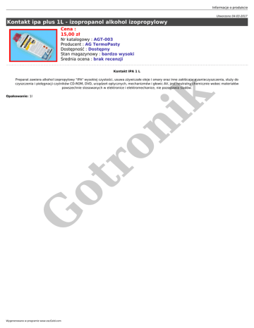 Informacje o produkcie Utworzono 04-03-2017 Kontakt ipa plus 1L - izopropanol alkohol izopropylowy Cena : 15,00 zł Nr katalogowy : AGT-003 Producent : AG TermoPasty Dostępność : Dostępny Stan magazynowy : bardzo wysoki Średnia ocena : brak recenzji Kontakt IPA 1 L on ik Preparat zawiera alkohol izopropylowy "IPA" wysokiej czystości, usuwa zżywiczałe oleje i smary oraz inne zakłócające zanieczyszczenia, służy do czyszczenia i pielęgnacji czytników CD-ROM, DVD, urządzeń optycznych, mechanizmów i głowic AV, jest neutralny chemicznie wobec materiałów powszechnie stosowanych w elektronice i elektromechanice, nie pozostawia śladów. G ot r Opakowanie: 1l Wygenerowano w programie www.oscGold.com on ik ot r G G ot r on ik Informacje o produkcie Wygenerowano w programie www.oscGold.com