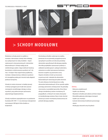 T E C H N O L O G I A P R O D U K C J I K R AT > SCHODY MODUŁOWE Modułowe schody proste to szybkie w Konstrukcję schodów wykonuje się szybko, montażu i demontażu schody, które składają ponieważ nie ma potrzeby przygotowywania się z połączonych ze sobą modułów - stopni specjalnych rysunków ani zlecania produkcji wykonanych z krat pomostowych i elementów elementów specyficznych dla danego projektu. balustradowych. Schody nadają się do Oto kilka przykładów zastosowań: podesty w wielokrotnego użytku i dają możliwość budowy zakładach produkcyjnych, wykopy budowlane, konstrukcji o zróżnicowanej wysokości od 1 do ustawione na sobie tymczasowe kontenery max. 16 stopni. Poza wspomnianą szybkością biurowo-socjalne czy przenośne sceny. montażu i elastycznością w doborze wysokości Stopnie schodów (z krat) są mocowane ich niewątpliwą zaletą jest również mała objętość za pomocą śrub i nakrętek do elementów podczas transportu. balustradowych stanowiących jeden element. To samo dotyczy również łączenia ze sobą Schody te można stosować w każdej sytuacji, elementów balustradowych. W ten sposób szybko w której wymagane jest trwałe lub czasowe powstają samonośne schody proste. Na potrzeby Zalety rozwiązanie umożliwiające dostęp na daną mocowania, na przykład spocznika, firma Staco - Brak prac projektowych wysokość, przy jednoczesnym zachowaniu oferuje standardowy zestaw montażowy. W - Szybki czas dostawy optymalnego bezpieczeństwa. przypadkach, w których nie można skorzystać - Wysokość schodów jest zależna od ilości stopni ze standardowego zestawu Staco może również - Niewielkie gabaryty ułatwiające transport Schody modułowe zaprojektowano na podstawie dostarczyć zestaw montażowy dostosowany do - Szybki czas montażu Eurokodu (EN 1991-1-1) ze zmiennym obciążeniem potrzeb danego projektu. - Łatwość demontażu/możliwość ponownego wynoszącym 500 kg/m2 dla schodów w użycia budynkach. - Atrakcyjny stosunek ceny do jakości C R E AT E A N D I N S P I R E T E C H N O L O G I A P R O D U K C J I K R AT S C H O DY M O D U ŁO W E Właściwości produktu w wersji standardowej: - Stopnie schodów ze stali S235 - Elementy balustradowe ze stali, grubość 3 mm - Możliwość połączenia maks. do 16 stopni - Wysokość stopnia 185 mm - Stopień schodów z krat wciskanych typu TR 3/30, oczko 33,33 x 33,33 mm - Szerokość biegu schodów 800 mm - Szerokość stopnia 240 mm - Stopnie schodów wyposażone w kątowniki przeciwpoślizgowe - Nachylenie schodów ok. 35° - Ocynkowane ogniowo zgodnie z EN-ISO 1461 - Dostarczane ze śrubami mocującymi M12 i M16 na potrzeby łączenia ze sobą elementów - Dostępna instrukcja montażu Opcjonalnie Wysokość schodów w mm Liczba schodów 1851 3702 5553 7404 9255 1.1106 1.2957 - Zestaw montażowy ze stali w dwóch osobnych częściach (bez śrub mocujących) - Stopnie schodów w wersji antypoślizgowej na płaskowniku nośnym i/lub poprzecznym - Dwuwarstwowa powłoka po ocynkowaniu: system Duplex - Szerokość biegu schodów 1000 mm lub 1200 mm - Dodatkowa bortnica za stopniem 1.4808 1.6659 1.85010 2.03511 2.22012 2.40513 2.59014 2.77515 2.96016 Chcą Państwo dowiedzieć się więcej? Chcą Państwo dowiedzieć się więcej o naszych opatentowanych schodach modułowych? Zachęcamy do umówienia się na spotkanie z jednym z naszych przedstawicieli handlowych. Udzieli on Państwu informacji na temat tego systemu oraz możliwości w zakresie technologii produkcji krat. P o d a d r e s e m w w w. s t a c o . e u z n a j d ą P a ń s t w o również specjalistę w Państwa okolic y! Niniejsza karta produktu została sporządzona z dochowaniem należytej staranności, jednak nie można rościć żadnych praw na podstawie jej treści. member of www.rotogroep.nl www.staco.eu STACO-PL-Productsheet-TR-2016 > CREATE AND INSPIRE