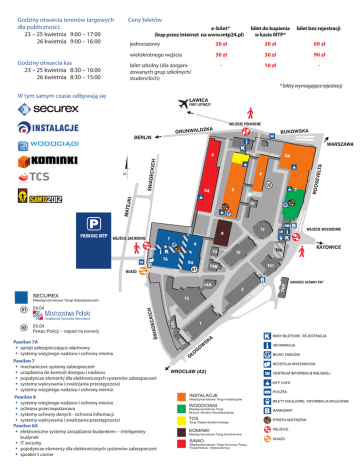 Godziny otwarcia terenów targowych dla publiczności: 23 – 25 kwietnia 9:00 – 17:00 26 kwietnia 9:00 – 16:00 Godziny otwarcia kas 23 – 25 kwietnia 8:30 – 16:00 26 kwietnia 8:30 – 15:00 Ceny biletów e-bilet* (kup przez internet na www.mtp24.pl) bilet do kupienia w kasie MTP* bilet bez rejestracji jednorazowy 20 zł 20 zł 60 zł wielokrotnego wejścia 30 zł 30 zł 90 zł - 10 zł - bilet szkolny (dla zorganizowanych grup szkolnych/ studenckich) * bilety wymagające rejestracji W tym samym czasie odbywają się MiÚdzynarodowe Targi SECUREX Międzynarodowe Targi Zabezpieczeń 24.04 25.04 Pokaz Policji − napad na konwój Pawilon 7A sprzęt zabezpieczająco-alarmowy systemy wizyjnego nadzoru i ochrony mienia Pawilon 7 mechaniczne systemy zabezpieczeń urządzenia do kontroli dostępu i nadzoru pojedyncze elementy dla elektronicznych systemów zabezpieczeń systemy wykrywania i zwalczania przestępczości systemy wizyjnego nadzoru i ochrony mienia Pawilon 8 systemy wizyjnego nadzoru i ochrony mienia ochrona przeciwpożarowa systemy ochrony danych - ochrona informacji systemy wykrywania i zwalczania przestępczości Pawilon 8A elektroniczne systemy zarządzania budynkiem – inteligentny budynek IT security pojedyncze elementy dla elektronicznych systemów zabezpieczeń speaker’s corner INSTALACJE Międzynarodowe Targi Instalacyjne WODOCIĄGI Międzynarodowe Targi Branży Wodno-Kanalizacyjnej TCS Targi Ciepła Systemowego KOMINKI Międzynarodowe Targi Kominkowe SAWO Międzynarodowe Targi Ochrony Pracy, Pożarnictwa i Ratownictwa