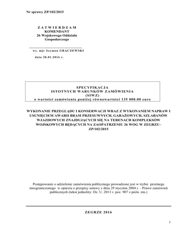 Nr sprawy ZP/102/2015 ZATWIERDZAM KOMENDANT 26 Wojskowego Oddziału Gospodarczego ……………………………………. w z. mj r Szy mo n G RĄ C ZE W SK I d nia 2 8 .0 1 .2 0 1 6 r. SPECYFIKACJA ISTOTNYCH WARUNKÓW ZAMÓWIENIA (SIWZ) o wartości zamówienia poniżej równow artości 135 000.00 euro WYKONANIE PRZEGLĄDU I KONSERWACJI WRAZ Z WYKONANIEM NAPRAW I USUNIĘCIEM AWARII BRAM PRZESUWNYCH, GARAŻOWYCH, SZLABANÓW WJAZDOWYCH ZNAJDUJĄCYCH SIĘ NA TERENACH KOMPLEKSÓW WOJSKOWYCH BĘDĄCYCH NA ZAOPATRZENIU 26 WOG W ZEGRZU– ZP/102/2015 Postępowanie o udzielenie zamówienia publicznego prowadzone jest w trybie przetargu nieograniczonego w oparciu o przepisy ustawy z dnia 29 stycznia 2004 r. - Prawo zamówień publicznych (tekst jednolity: Dz. U. 2013 r. poz. 907 z późn. zm.) ZEGRZE 201 6 1 Nr sprawy ZP/102/2015 ROZDZIAŁ I NAZWA ORAZ ADRES ZAMAWIAJĄCEGO Zamawiającym jest SKARB PAŃSTWA – 26 WOG Adres: ul. Juzistek 2, 05-131 Zegrze Numer telefonu: 48 261 883 782 Numer faksu: 48 261 883 868 Adres strony internetowej: www.26wog.wp.mil.pl Adres e-mail: [email protected] Godziny urzędowania: od poniedziałku do czwartku od 7 00 – 15 30 , w piątek od 7 00 – 13 00 . Godziny otwarcia Urzędu Pocztowego w Zegrzu: poniedziałek w godz. 14 00 – 20 00 wtorek i piątek w godz. 9 00 – 15 00 . środa i czwartek w godz. 12 00 – 18 00 ROZDZIAŁ II TRYB UDZIELENIA ZAMÓWIENIA 1. Postępowanie prowadzone jest w trybie przetargu nieograniczonego na podstawie art. 39-46 ustawy Prawo zamówień publicznych (tekst jednolity Dz. U. 2013 r. poz. 907 z późn. zm.), zwanej dalej ustawą Pzp, w związku z art. 10 ust. 1 ustawy Pzp, o wartości szacunkowej zamówienia poniżej 134 000 euro. 2. Do udzielenia zamówienia będącego przedmiotem niniejszego postępowania stosuje się przepisy ustawy Pzp oraz akty wykonawcze wydane na jej podstawie, a w sprawach nieuregulowanych ustawą przepisy Kodeksu cywilnego. 3. Postępowanie oznaczone jest numerem sprawy: ZP/102/2015. Wykonawcy we wszelkich kontaktach z Zamawiającym powinni powoływać się na ten znak. 4. Postępowanie zostało ogłoszone w Biuletynie Zamówień Publicznych w dniu 29.01.2016 r. pod nr 20334 - 2016, na tablicy informacyjnej w siedzibie Zamawiającego (Biuro Przepustek) oraz na stronie internetowej www.26wog.wp.mil.pl . ROZDZIAŁ III OPIS PRZEDMIOTU ZAMÓWIENIA 1. Przedmiotem zamówienia jest konserwacja i wykonanie napraw wraz z usunięciem awarii i utrzymaniem w ciągłym ruchu bram przesuwnych, garażowych, szlabanów wjazdowych znajdujących się na terenach kompleksów wojskowych administrowanych przez JW. 4809 w Zegrzu. 2. Zamawiający nie dopuszcza składania ofert częściowych 3. Wykonawca może złożyć tylko jedną ofertę. 4. Szczegółowy opis przedmiotu zamówienia zawiera załącznik nr 1 do projektu umowy. str. 2 Nr sprawy ZP/102/2015 5. W prowadzonym postępowaniu Zamawiający nie dopuszcza składania ofert wariantowych, tj. oferty przewidującej odmienny niż określony w niniejszej SIWZ sposób wykonania zamówienia. 6. Szczegółowe warunki realizacji zamówienia zawiera projekt umowy, stanowiący załącznik nr 6. 7. Oznaczenie wg Wspólnego Słownika Zamówień: 5080000-3. 8. Istnieje możliwość dokonania wizji lokalnej na terenie objętym przedmiotem zamówienia, celem uzyskania wszelkich dodatkowych informacji, które mogą być konieczne do przygotowania oferty, zawarcia umowy oraz wykonania zamówienia. Wszelkie pozyskane informacje Wykonawca zobowiązany jest do zachowania w tajemnicy niezależnie od wyniku przetargu (wyboru Wykonawcy) oraz ponosi z tego tytułu odpowiedzialność. Wszelkie koszty związane z dokonaniem wizji lokalnej ponosi Wykonawca na własne ryzyko. Osoba dokonująca wizji lokalnej powinna posiadać poświadczenie bezpieczeństwa lub upoważnienie do dostępu do informacji niejawnych o klauzuli minimum Zastrzeżone oraz aktualne zaświadczenie o przeszkoleniu. 9. Wykonawca w celu uzyskania bliższych danych w w/w sprawie lub przeprowadzenia wizji lokalnej powinien skontaktować się z: Kierownik SOI Białobrzegi –tel. 261-887-533 Kierownik SOI Kazuń –tel. 261-861-065 Kierownik SOI Przasnysz –tel. 261-371-114 Kierownik SOI Ostrów Mazowiecka –tel. 261-384-717 Kierownik SOI Rembertów –tel. 261-815-068 Kierownik SOI Wesoła –tel. 261-812-194 Kierownik SOI Zegrze –tel. 261-883-405 Rejon Grupy Zabezpieczenia Legionowo- tel. 261-866-480. ROZDZIAŁ IV TERMIN I MIEJSCE WYKONANIA ZAMÓWIENIA 1. Termin realizacji zamówienia: od podpisania umowy do 31.12.2017 r. 2. Miejsce wykonania zamówienia: Kompleks wojskowy 05-127 Białobrzegi ul. Osiedle wojskowe 93 Kompleks wojskowy 05-152 Kazuń Nowy, ul. Wojska Polskiego Kompleks wojskowy 05-180 Pomiechówek, ul. Wojska Polskiego Kompleks wojskowy 05-100 Nowy Dwór Mazowiecki, ul. Leśna Kompleks wojskowy Modlin Twierdza, ul. Obwodowa Kompleks wojskowy Modlin Twierdza, ul. Chrzanowskiego Kompleks wojskowy 07-310 Komorowo, ul. Bociańskiego 1 Kompleks wojskowy 06-300 Przasnysz, ul. Makowska Kompleks wojskowy Ciechanów, ul. Orylska 6,8 Kompleks wojskowy 04-470 Warszawa-Rembertów, ul. Marsa 110 Kompleks wojskowy 05-075 Warszawa-Wesoła, ul. Okuniewska 1 Kompleks wojskowy 05-131 Zegrze, ul. Juzistek 2 Kompleks wojskowy 05-130 Zegrze Południowe, ul. Warszawska 22 str. 3 Nr sprawy ZP/102/2015 Kompleks wojskowy 05-120 Legionowo 3. Szczegółowe zestawienie bram, szlabanów i ich lokalizacje zawiera załącznik nr 1 do projektu umowy. ROZDZIAŁ V OFERTY WSPÓLNE 1. Wykonawcy mogą wspólnie ubiegać się o udzielenie zamówienia. 2. Wykonawcy składający ofertę wspólną ustanawiają pełnomocnika do reprezentowania ich w postępowaniu o udzielenie zamówienia albo do reprezentowania ich w postępowaniu i zawarcia umowy w sprawie zamówienia publicznego. 3. Do oferty wspólnej Wykonawcy dołączają pełnomocnictwo w oryginale lub kopii poświadczonej za zgodność z oryginałem przez notariusza. 4. Pełnomocnik pozostaje