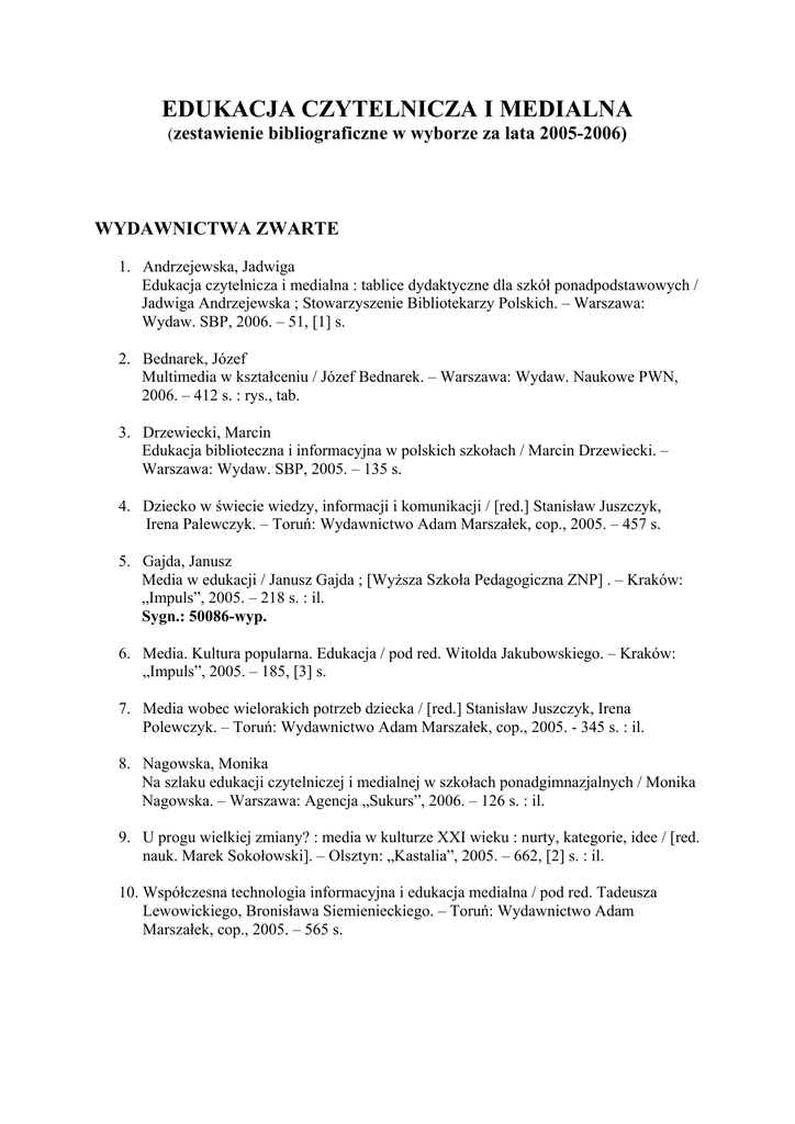 EDUKACJA CZYTELNICZA I MEDIALNA (zestawienie bibliograficzne w wyborze za lata 2005-2006) WYDAWNICTWA ZWARTE 1. Andrzejewska, Jadwiga Edukacja czytelnicza i medialna : tablice dydaktyczne dla szkół ponadpodstawowych / Jadwiga Andrzejewska ; Stowarzyszenie Bibliotekarzy Polskich. – Warszawa: Wydaw. SBP, 2006. – 51, [1] s. 2. Bednarek, Józef Multimedia w kształceniu / Józef Bednarek. – Warszawa: Wydaw. Naukowe PWN, 2006. – 412 s. : rys., tab. 3. Drzewiecki, Marcin Edukacja biblioteczna i informacyjna w polskich szkołach / Marcin Drzewiecki. – Warszawa: Wydaw. SBP, 2005. – 135 s. 4. Dziecko w świecie wiedzy, informacji i komunikacji / [red.] Stanisław Juszczyk, Irena Palewczyk. – Toruń: Wydawnictwo Adam Marszałek, cop., 2005. – 457 s. 5. Gajda, Janusz Media w edukacji / Janusz Gajda ; [Wyższa Szkoła Pedagogiczna ZNP] . – Kraków: „Impuls”, 2005. – 218 s. : il. Sygn.: 50086-wyp. 6. Media. Kultura popularna. Edukacja / pod red. Witolda Jakubowskiego. – Kraków: „Impuls”, 2005. – 185, [3] s. 7. Media wobec wielorakich potrzeb dziecka / [red.] Stanisław Juszczyk, Irena Polewczyk. – Toruń: Wydawnictwo Adam Marszałek, cop., 2005. - 345 s. : il. 8. Nagowska, Monika Na szlaku edukacji czytelniczej i medialnej w szkołach ponadgimnazjalnych / Monika Nagowska. – Warszawa: Agencja „Sukurs”, 2006. – 126 s. : il. 9. U progu wielkiej zmiany? : media w kulturze XXI wieku : nurty, kategorie, idee / [red. nauk. Marek Sokołowski]. – Olsztyn: „Kastalia”, 2005. – 662, [2] s. : il. 10. Współczesna technologia informacyjna i edukacja medialna / pod red. Tadeusza Lewowickiego, Bronisława Siemienieckiego. – Toruń: Wydawnictwo Adam Marszałek, cop., 2005. – 565 s. ARTYKUŁY Z CZASOPISM 1. Audiowizualne kształcenie uczniów : na przykładzie szkół budowlanych / Rafał Wawer // Wychowanie Techniczne w Szkole. – 2005, nr 1, s. 11-12 2. Będę studentem : program zajęć w szkole ponadgimnazjalnej / Bożena Kozieńska // Biblioteka w Szkole. – 2006, nr 1, s. 10 3. Biblioteka bliżej ucznia : program realizacji ścieżki „Edukacja czytelnicza i medialna” w gimnazjum / Ewa Małecka-Jóźwik // Biblioteka w Szkole. – 2005, nr 5, s. 3-9 4. Edukacja interaktywna / Tomasz Prauzner // Wychowanie Techniczne w Szkole. – 2005, nr 5, s. 42-44 5. Edukacja medialna szkolnictwa zawodowego : na przykładzie analizy cyklu filmów „Materiały, wyroby i technologie współczesnego budownictwa” / Rafał Wawer // Wychowanie Techniczne w Szkole. – 2005, nr 2, s. 14-16 6. Elektroniczne kwerendy, czyli o tym, jak pomagać maturzystom w przygotowaniach do ustnego egzaminu dojrzałości z języka polskiego / Wioletta Poturała // Biblioteka w Szkole. – 2005, nr 1, s. 8-11 7. Jestem użytkownikiem informacji : program dydaktyczno-wychowawczy biblioteki szkolnej wspierający proces samokształcenia ucznia / Władysława Kiernicka, Bożena Widła // Biblioteka w Szkole. – 2006, nr 1, s. 2-4 8. Książka ma swoją historię / Grażyna Chrząstowska // Poradnik Bibliotekarza. – 2006, nr 2, s. 37-40 9. Media – teatr dla mas : dziennikarze i politycy wspólnie powinni dbać o edukację pomagającą krzewieniu podstawowych wartości / Konrad Ciesiołkiewicz // Rzeczpospolita. – 2006, nr 58, s. A 10 10. Multicentra – lokalne centra kultury technologicznej / Joanna Tomczyńska // Edukacja Ustawiczna Dorosłych. – 2005, nr 4, s. 104-106 11. Myślę, więc czytam : scenariusz imprezy poświęconej czytaniu / Anna Zeler // Biblioteka w Szkole. – 2006, nr 9, s. 14 12. Polscy laureaci Literackiej Nagrody Nobla : projekt edukacyjny / Irena Zalewska // Poradnik Bibliotekarza. – 2005, nr 11, s. 36-39 13. Problematyka edukacji medialnej w kontekście wybranych zagadnień pedagogiki krytycznej / Agnieszka Ogonowska // Kwartalnik Pedagogiczny. – 2005, nr 1 , s. 79-94 14. Profil nauczania w szkołach ponadgimnazjalnych „Zarządzanie informacją” – propozycja rozwiązania dla nauczyciela bibliotekarza / Andrzej Kubrak // Poradnik Bibliotekarza . – 2005, nr 10, s. 27-28 15. Program edukacji czytelniczej i medialnej przeznaczony dla klas I-III / Beata Korus // Nauczanie Początkowe. – R. 29, nr 3 (2005/2006), s. 71-77 16. Przegląd literatury dotyczącej roli mediów w procesie rozwoju dziecka / Anna Klimaszewska // Nauczanie Początkowe. – R. 29, nr 3 (2005/2006), s. 99-105 17. Rola mediów w procesie kształtowania ról płciowych u dzieci / Elżbieta Anita Bajcar, Przemysław Bąbel // Nauczanie Początkowe. – R. 29, nr 3 (2005/2006), s. 23-31 18. Słynne zwroty i metafory filozoficzne : korelacja treści ścieżki filozoficznej oraz czytelniczej i medialnej w szkole ponadgimnazjalnej / Kamilla Dudek // Biblioteka w Szkole. – 2005, nr 5, s. 24-25 19. Tradycje świąt Bożego Narodzenia : projekt edukacyjny dla uczniów klasy V szkoły podstawowej / Joanna Jasińska, Agnieszka Piechnik // Biblioteka w Szkole. – 2006, nr 11, s. 11-12 20. Uczniowie gimnazjum powinni wydać gazetkę! : (z doświadczeń opiekuna zespołu redakcyjnego) / Małgorzata Hamada // Język Polski w Gimnazjum. – R. 7, nr 1 (2005/2006), s. 79-93 21. Współpraca międzynarodowa w zakresie edukacji medialnej / Małgorzata StawiakOsosińska // Nauczanie Początkowe. – R. 29, s. 3 (2005/2006), s. 14-22 22. Wydajemy szkolną gazetę, czyli jak pracuje zespół redakcyjny „Gimzetki” / Małgorzata Łopuszyńska-Ratyna // Biblioteka w Szkole. – 2005, nr 5, s. 18-21 23. Zabawa z katalogiem i nie tylko dla najmłodszych / Małgorzata Hamada // Biblioteka w Szkole . – 2005, nr 2, s. 9 SCENARIUSZE ZAJĘĆ 1. Czy umiesz korzystać z książki popularnonaukowej z indeksem? : sprawdzian dla uczniów klasy IV szkoły podstawowej / Bożena Ślusarska // Biblioteka w Szkole. – 2006, nr 11, s. 23 2. Grzesiak, Ewa Edukacja medialna : scenariusze zajęć / Ewa Grzesiak, Renata Janicka-Szyszko, Magdalena Steblecka. – Gdańsk: Gdańskie Wydawnictwo Psychologiczne, 2005. 