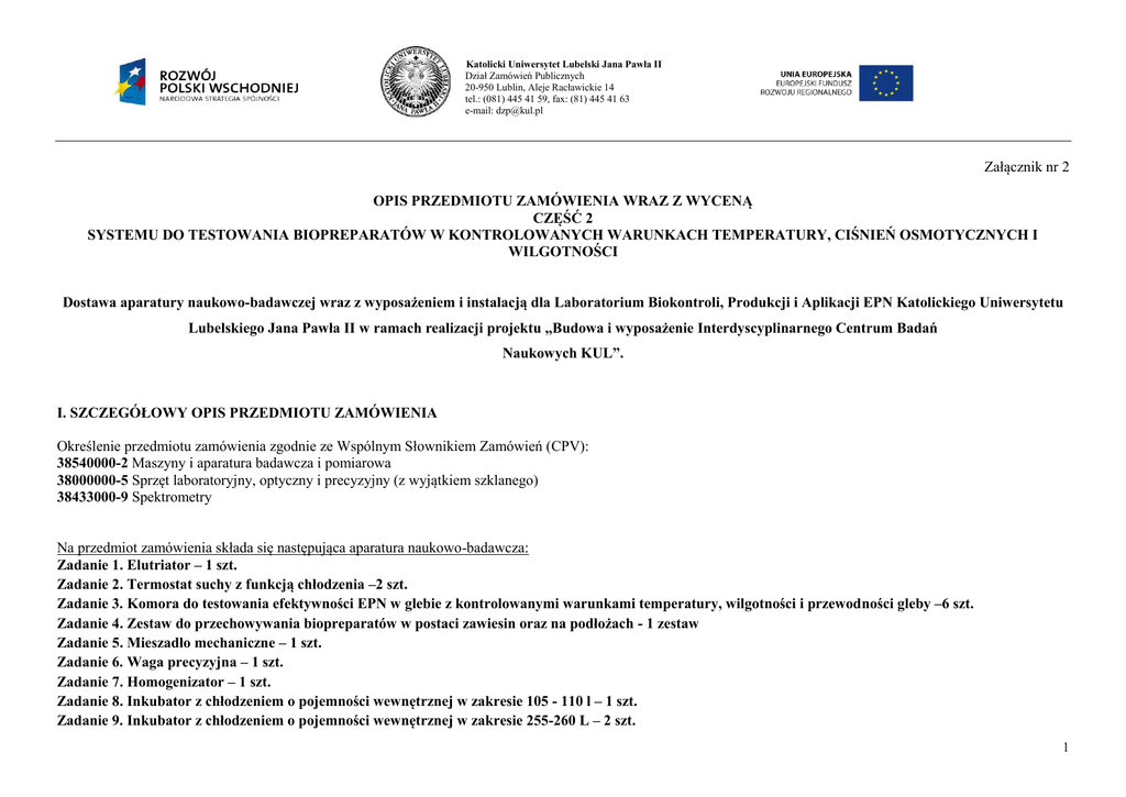 Katolicki Uniwersytet Lubelski Jana Pawła II Dział Zamówień Publicznych 20-950 Lublin, Aleje Racławickie 14 tel.: (081) 445 41 59, fax: (81) 445 41 63 e-mail: [email protected] Załącznik nr 2 OPIS PRZEDMIOTU ZAMÓWIENIA WRAZ Z WYCENĄ CZĘŚĆ 2 SYSTEMU DO TESTOWANIA BIOPREPARATÓW W KONTROLOWANYCH WARUNKACH TEMPERATURY, CIŚNIEŃ OSMOTYCZNYCH I WILGOTNOŚCI Dostawa aparatury naukowo-badawczej wraz z wyposażeniem i instalacją dla Laboratorium Biokontroli, Produkcji i Aplikacji EPN Katolickiego Uniwersytetu Lubelskiego Jana Pawła II w ramach realizacji projektu „Budowa i wyposażenie Interdyscyplinarnego Centrum Badań Naukowych KUL”. I. SZCZEGÓŁOWY OPIS PRZEDMIOTU ZAMÓWIENIA Określenie przedmiotu zamówienia zgodnie ze Wspólnym Słownikiem Zamówień (CPV): 38540000-2 Maszyny i aparatura badawcza i pomiarowa 38000000-5 Sprzęt laboratoryjny, optyczny i precyzyjny (z wyjątkiem szklanego) 38433000-9 Spektrometry Na przedmiot zamówienia składa się następująca aparatura naukowo-badawcza: Zadanie 1. Elutriator – 1 szt. Zadanie 2. Termostat suchy z funkcją chłodzenia –2 szt. Zadanie 3. Komora do testowania efektywności EPN w glebie z kontrolowanymi warunkami temperatury, wilgotności i przewodności gleby –6 szt. Zadanie 4. Zestaw do przechowywania biopreparatów w postaci zawiesin oraz na podłożach - 1 zestaw Zadanie 5. Mieszadło mechaniczne – 1 szt. Zadanie 6. Waga precyzyjna – 1 szt. Zadanie 7. Homogenizator – 1 szt. Zadanie 8. Inkubator z chłodzeniem o pojemności wewnętrznej w zakresie 105 - 110 l – 1 szt. Zadanie 9. Inkubator z chłodzeniem o pojemności wewnętrznej w zakresie 255-260 L – 2 szt. 1 Katolicki Uniwersytet Lubelski Jana Pawła II Dział Zamówień Publicznych 20-950 Lublin, Aleje Racławickie 14 tel.: (081) 445 41 59, fax: (81) 445 41 63 e-mail: [email protected] Zadanie 10. Zestaw palników do komory laminarnej – 1 szt. Zadanie 11. Spektrofotometru UV-VIS z możliwością pomiarów odbiciowych oraz w zewnętrznych zbiornikach– szt. 1 Zadanie 12. Aparat do mierzenia potencjału wodnego gleby w zakresie -0,1 MPa do -300 MPa – 1 szt. A. PARAMETRY TECHNICZNE I EKSPLOATACYJNE URZADZENIA ZADANIE NR 1. ELUTRIATOR – 1 SZT. Nazwa urządzenia: model, typ aparatu, nr katalogowy Producent: pełna nazwa, adres, strona www Kraj pochodzenia: Rok produkcji (wymagany: 2014/2015 r.) Lp. 1. 2. 3. 4. 5. 6. Parametr wymagany Parametr oferowany Aparat do separacji różnych stadiów rozwojowych i gatunków nicieni - Elutriator typ Oostenbrink Próbka ekstrahowanej gleby przynamniej w zakresie 100-500 ml Zakres przepływu wody ekstrahującej przynajmniej 200l/h Kontrola (pomiar i regulacja) przepływu wody (góra i dół) Elutriator wykonany z pleksiglau W zestawie: sito Ø200 mm z oczkiem 160 μm z odbieralnikiem, Statyw 2 Katolicki Uniwersytet Lubelski Jana Pawła II Dział Zamówień Publicznych 20-950 Lublin, Aleje Racławickie 14 tel.: (081) 445 41 59, fax: (81) 445 41 63 e-mail: [email protected] ZADANIE NR 2. TERMOSTAT SUCHY Z FUNKCJĄ CHŁODZENIA –2 SZT. Nazwa urządzenia: model, typ aparatu, nr katalogowy Producent: pełna nazwa, adres, strona www Kraj pochodzenia: Rok produkcji (wymagany: 2014/2015 r.) Lp. 1. 2. 3. 4. 5. 6. 7. 8. 9. 10. Parametr wymagany Parametr oferowany Termostat suchy z funkcją chłodzenia Zakres regulacji temperatury min. od 0°C do 100°C Czas grzania nie większy niż 20min (od 20 do 100°C) Czas chłodzenia nie większy niż 30min (od RT do -20°C) oraz nie większy niż 15min (od 100 do 20°C) Dokładność nastawy temp. 0,1°C Programowany czas pracy w zakresie od 1 min do 99 godz. Wyświetlacz LCD z podświetleniem, panel sterowania z klawiaturą membranową Zabezpieczenie przed przekroczeniem zadanej temp., sygnał dźwiękowy zakończenia programu Wymiary (gł. x szer. x wys.) 300 x 220 x 170 mm Zasilanie 230V ZADANIE NR 3. KOMORA DO TESTOWANIA EFEKTYWNOŚCI EPN W GLEBIE Z KONTROLOWANYMI WARUNKAMI TEMPERATURY, WILGOTNOŚCI I PRZEWODNOŚCI GLEBY – 6 SZT. 3 Katolicki Uniwersytet Lubelski Jana Pawła II Dział Zamówień Publicznych 20-950 Lublin, Aleje Racławickie 14 tel.: (081) 445 41 59, fax: (81) 445 41 63 e-mail: [email protected] Nazwa urządzenia: model, typ aparatu, nr katalogowy Producent: pełna nazwa, adres, strona www Kraj pochodzenia: Rok produkcji (wymagany: 2014/2015 r.) Lp. Parametr wymagany Parametr oferowany Boks hodowlany Wykonane z przezroczystego poliwęglanu o wymiarach (głębokość x wysokość x szerokość: 70x25x20cm - szt. 6 Boksy powinny być wyposażone w zamykane otwory wentylacyjne 1. zabezpieczone siatką, z płynna regulacją wielkości otworów wentylacyjnych o powierzchni przynajmniej 20% powierzchni pokrywy. Zestaw do nawilżania gleby. Przykrywany otwór inspekcyjny. Boksy powinny być zaopatrzone w odpowiednie uchwyty do przenoszenia Każdy boks wyposażony w regulator parametrów wewnętrznego środowiska z odłączalnym rejestratorem danych komunikującym się bezprzewodowo z 2. koncentratorem danych. Regulator jest łatwo demontowany i może być zamieniony przez inny egzemplarz o innej konfiguracji Regulator powinien spełniać następujące funkcje Regulacja temperatury podłoża w boksie metodą minimalizującą zmiany temperatury oraz lokalne znaczące skoki temperatury. Zakres regulacji : od 3. temp. otoczenia do 40°C Kontrola i regulacja wilgotności powietrza 30 ÷ 70% Kontrola i regulacja wilgotności podłoża 4 Katolicki Uniwersytet Lubelski Jana Pawła II Dział Zamówień Publicznych 20-950 Lublin, Aleje Racławickie 14 tel.: (081) 445 41 59, fax: (81) 445 41 63 e-mail: [email protected] 4. 5. 6. Rejestrator rejestruje parametry : Temperatury podłoża; w zakresie -30 ÷ 60°C z dokładnością przynajmniej 0,5 °C Wilgotności gleby Przewodności gleby Rejestrator wyposażony jest w awaryjne zasilanie niezależne od zasilania regulatora. W zestawie: - Pompa perystaltyczna - Butla autoklawowalna 10l - Zestaw węzy do nawilżania. - Koncentrat