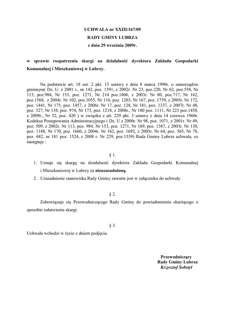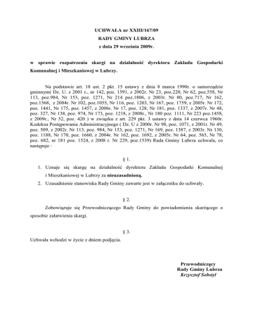UCHWAŁA nr XXIII/167/09 RADY GMINY LUBRZA z dnia 29 września 2009r. w sprawie rozpatrzenia skargi na działalność dyrektora Zakładu Gospodarki Komunalnej i Mieszkaniowej w Lubrzy. Na podstawie art. 18 ust. 2 pkt. 15 ustawy z dnia 8 marca 1990r. o samorządzie gminnym( Dz. U. z 2001 r., nr 142, poz. 1591, z 2002r. Nr 23, poz.220, Nr 62, poz.558, Nr 113, poz.984, Nr 153, poz. 1271, Nr 214 poz.1806, z 2003r. Nr 80, poz.717, Nr 162, poz.1568, z 2004r. Nr 102, poz.1055, Nr 116, poz. 1203, Nr 167, poz. 1759, z 2005r. Nr 172, poz. 1441, Nr 175, poz. 1457, z 2006r. Nr 17, poz. 128, Nr 181, poz. 1337, z 2007r. Nr 48, poz. 327, Nr 138, poz. 974, Nr 173, poz. 1218, z 2008r., Nr 180 poz. 1111, Nr 223 poz.1458, z 2009r., Nr 52, poz. 420 ) w związku z art. 229 pkt. 3 ustawy z dnia 14 czerwca 1960r. Kodeksu Postępowania Administracyjnego ( Dz. U z 2000r. Nr 98, poz. 1071, z 2001r. Nr 49, poz. 509, z 2002r. Nr 113, poz. 984, Nr 153, poz. 1271, Nr 169, poz. 1387, z 2003r. Nr 130, poz. 1188, Nr 170, poz. 1660, z 2004r. Nr 162, poz. 1692, z 2005r. Nr 64, poz. 565, Nr 78, poz. 682, nr 181 poz. 1524, z 2008 r. Nr 229, poz.1539) Rada Gminy Lubrza uchwala, co następuje : § 1. 1. Uznaje się skargę na działalność dyrektora Zakładu Gospodarki Komunalnej i Mieszkaniowej w Lubrzy za nieuzasadnioną. 2. Uzasadnienie stanowiska Rady Gminy zawarte jest w załączniku do uchwały. § 2. Zobowiązuje się Przewodniczącego Rady Gminy do powiadomienia skarŜącego o sposobie załatwienia skargi. § 3. Uchwała wchodzi w Ŝycie z dniem podjęcia. Przewodniczący Rady Gminy Lubrza Krzysztof Sobstyl Załącznik nr 1 do uchwały Nr XXIII/167/09 Rady Gminy Lubrza z dnia 29.09.09r. U Z A S AD N I E N I E Pismem z dnia 29 maja 2009r. do Rady Gminy przekazana została skarga złoŜona przez Pana Kamila Gąsior zam. w Lubrzy na dyr. Zakładu Gospodarki Komunalnej i Mieszkaniowej w Lubrzy. Komisja Rewizyjna Rady Gminy Lubrza na posiedzeniu w dniu 04 września br. analizowała zawarte w skardze zarzuty, tj : 1. brak prowadzonej ewidencji z realizacji wywozu śmieci na zlecenia indywidualne, 2. nieprawidłowa kalkulacja kosztów za usługę wywozu śmieci na miejskie wysypisko śmieci w Prudniku dot. ilości odpadów oraz liczby kilometrów. W celu zbadania zasadności w/w zarzutów przeprowadzono postępowanie wyjaśniające. Dyr. Zakładu Gospodarki Komunalnej i Mieszkaniowej poinformował, Ŝe skarŜący - Pan Kamil Gąsior nie był bezpośrednio osobą zlecającą usługę. Nie prowadził teŜ rozmów wyjaśniających (jak wskazuje w skardze) w sprawie nieprawidłowo naliczonej opłaty za usługę wywozu śmieci. Zamawiającym była P. Lilla Gąsior - Sekretarz Gminy, której udzielane były wszelkie wyjaśnienia odnośnie kalkulacji kosztów. Przedstawione w skardze fakty są nieprawdziwe. Badając zarzuty zwrócono uwagę, Ŝe Zakład Gospodarki Komunalnej i Mieszkaniowej prowadził wewnętrzny rejestr wywozu odpadów od zleceń indywidualnych, w którym wyszczególnione było nazwisko zleceniodawcy, data wywozu oraz rodzaj i ilość przyjętych odpadów przez Miejskie Wysypisko Śmieci w Prudniku – na podstawie zgłoszenia kierowcy. Potwierdzeniem przyjęcia odpadów przez miejskie wysypisko śmieci w Prudniku jest zbiorcza faktura za dany miesiąc, w której wykazany jest rodzaj odpadu ( segregowane, niesegregowane), tonaŜ oraz łączną kwota do zapłaty. Wysypisko śmieci nie wystawiało dodatkowych pokwitowań od kaŜdorazowego przyjęcia śmieci. Podczas prowadzonych przez dyr. Zakładu rozmów wyjaśniających odnośnie naliczonej opłaty, przygotowany został i przedstawiony skarŜącej szczegółowy wydruk z wysypiska śmieci za okres od 15.04.br. do 12.05.br. w którym podana była dokładna data, tonaŜ oraz godzina przyjęcia odpadów. Sugerowany w skardze przedłuŜający się okres udzielanych wyjaśnień spowodowany był urlopem pracownika – kierowcy, który wywoził odpady z tego zlecenia. Niestety kurs samochodu nie został od razu zgłoszony do Zakładu, dlatego teŜ wobec kierowcy wyciągnięte zostały konsekwencje porządkowe za niedopełnienie obowiązków. Od dnia 15.05 br. Zakład Gospodarki Komunalnej i Mieszkaniowej w Lubrzy do kaŜdej faktury za wywóz śmieci na zlecenia indywidualne dołącza dodatkowo tzw. kartę przekazania odpadów przez wysypisko śmieci, w której podany jest kod odpadu, tonaŜ, dzień, nazwisko kierowcy, nazwisko osoby zlecającej usługę, oraz potwierdzenie z wysypiska o przyjęciu odpadów. Nieprawdą, jest, Ŝe na fakturze za dwa zlecenia podana była identyczna waga, tj. dwa razy po 1 900 kg. Z przedstawionej kopii wynika, iŜ waga podana jest ogółem za zrealizowane dwa zlecenia w okresie 21.04.br. – 24.04.br.- tj. 3 800 kg. Po interwencji P. Sekretarz faktura została zmieniona, w której dwa zlecenia rozpisane zostały osobno, tj. 1 560 kg i 960 kg oraz zmniejszono liczbę kilometrów na wysypisko śmieci do Prudnika z 36 km na 26 km. NaleŜy zwrócić uwagę, iŜ cenę za śmieci ustala Miejskie Wysypisko Śmieci w Prudniku ( wg obowiązującej taryfy), inna jest cena za odpady segregowane i niesegregowane. Wynika z tego, Ŝe prowadzona przez Zakład działalność usługowa nie jest dochodowa. Natomiast jeŜeli chodzi o nieprawidłową kalkulację poniesionych kosztów transportu na wysypisko śmieci – zarzut jest nieuzasadniony, poniewaŜ kalkulacja obliczana jest na podstawie przebiegu kilometrów i stawki bazowej ( ustalonej na podstawie Zarządzenia Wójta Gminy Lubrza Nr 116/2007 z dn. 27.12.2007r. w sprawie ustalenia odpłatności za wynajem samochodu cięŜarowego STAR do wywozu odpadów oraz odśnieŜania ulic) za 1 km – 3 zł brutto, licząc od miejsca garaŜowania samochodu. W dniu zgłoszenia usługi, Zakład nie posiadał na stanie wolnego kontenera, a poniewaŜ zamawiającej zaleŜało na wykonaniu usługi jak najszybciej, do kosztów transportu doliczono równieŜ trasę do m. KrzyŜkowice po pusty kontener KP-7. Na prośbę 