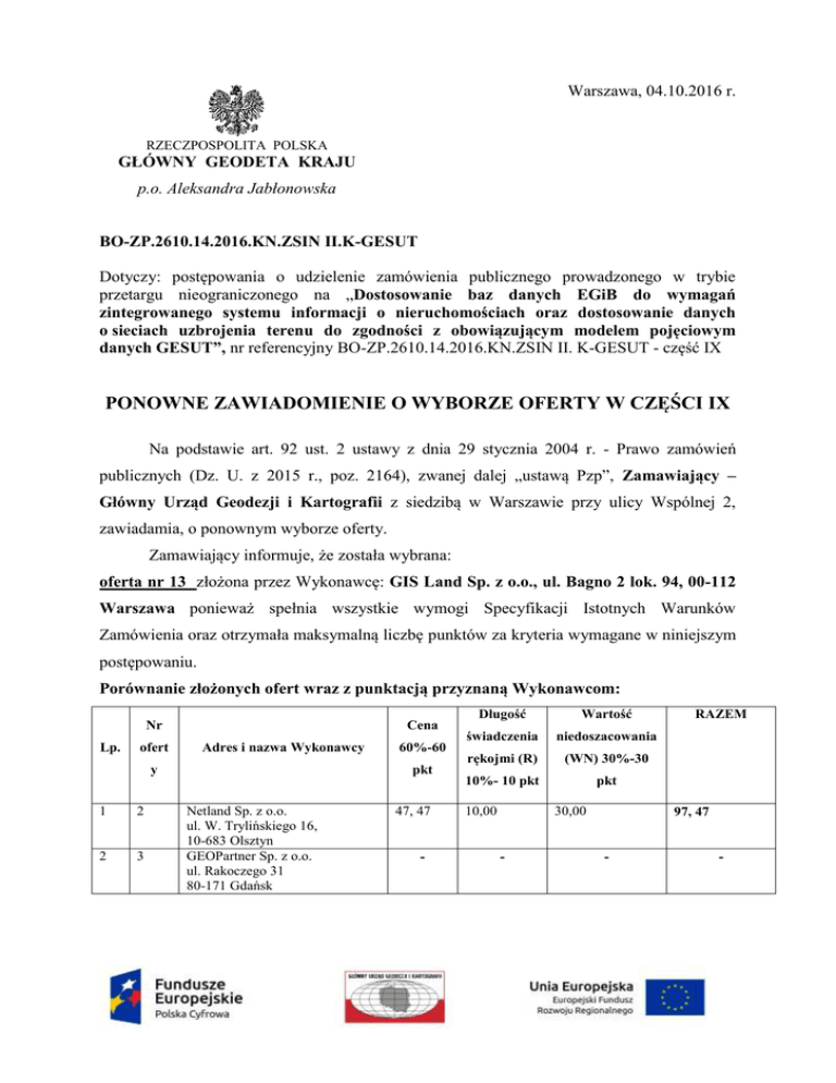 Warszawa, 04.10.2016 r. RZECZPOSPOLITA POLSKA GŁÓWNY GEODETA KRAJU p.o. Aleksandra Jabłonowska BO-ZP.2610.14.2016.KN.ZSIN II.K-GESUT Dotyczy: postępowania o udzielenie zamówienia publicznego prowadzonego w trybie przetargu nieograniczonego na „Dostosowanie baz danych EGiB do wymagań zintegrowanego systemu informacji o nieruchomościach oraz dostosowanie danych o sieciach uzbrojenia terenu do zgodności z obowiązującym modelem pojęciowym danych GESUT”, nr referencyjny BO-ZP.2610.14.2016.KN.ZSIN II. K-GESUT - część IX PONOWNE ZAWIADOMIENIE O WYBORZE OFERTY W CZĘŚCI IX Na podstawie art. 92 ust. 2 ustawy z dnia 29 stycznia 2004 r. - Prawo zamówień publicznych (Dz. U. z 2015 r., poz. 2164), zwanej dalej „ustawą Pzp”, Zamawiający – Główny Urząd Geodezji i Kartografii z siedzibą w Warszawie przy ulicy Wspólnej 2, zawiadamia, o ponownym wyborze oferty. Zamawiający informuje, że została wybrana: oferta nr 13 złożona przez Wykonawcę: GIS Land Sp. z o.o., ul. Bagno 2 lok. 94, 00-112 Warszawa ponieważ spełnia wszystkie wymogi Specyfikacji Istotnych Warunków Zamówienia oraz otrzymała maksymalną liczbę punktów za kryteria wymagane w niniejszym postępowaniu. Porównanie złożonych ofert wraz z punktacją przyznaną Wykonawcom: Nr Lp. ofert Cena Adres i nazwa Wykonawcy y 1 2 2 3 60%-60 pkt Netland Sp. z o.o. ul. W. Trylińskiego 16, 10-683 Olsztyn GEOPartner Sp. z o.o. ul. Rakoczego 31 80-171 Gdańsk 47, 47 - Długość Wartość świadczenia niedoszacowania rękojmi (R) (WN) 30%-30 10%- 10 pkt pkt 10,00 30,00 - RAZEM 97, 47 - - 3 5 4 13 5 14 6 16 Konsorcjum: 1.PMG Silesia Sp. z o.o., ul. Mikołowska 100a/502, 40-065 Katowice 2.Przedsiębiorstwo GeodezyjnoKartograficzne VERTICAL Sp. z o.o., ul. Stodolna 31, 44-240 Żory 3.UNIMAP s.c. J. Bryk, D. Malcharek, ul. Kossutha 11 40-844 Katowice GIS Land Sp. z o.o., ul. Bagno 2 lok. 94, 00-112 Warszawa 47,62 10,00 30,00 77, 62 60,00 10,00 30,00 100, 00 Zakład Usług Geodezyjnych i Kartograficznych „Pryzmat” – Zenon Kulesza ul. Solskiego 13 42-200 Częstochowa ALL-MAPS Aleksandra Rejowicz ul. Kościelna 8/14 30-034 Kraków 44,03 10,00 30,00 84, 03 - - - /.o. GŁÓWNY GEODETA KRAJU -/Aleksandra Jabłonowska Z up. Głównego Geodety Kraju -/Adrian Przepiórka -