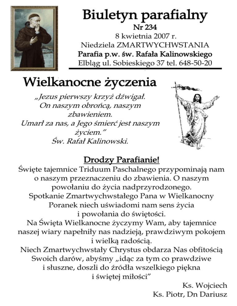 Biuletyn parafialny Nr 234 8 kwietnia 2007 r. Niedziela ZMARTWYCHWSTANIA Parafia p.w. św. Rafała Kalinowskiego Elbląg ul. Sobieskiego 37 tel. 648-50-20 „ Wielkanocne życzenia „Jezus pierwszy krzyż dźwigał. On naszym obrońcą, naszym zbawieniem. Umarł za nas, a Jego śmierć jest naszym życiem.” Św. Rafał Kalinowski. Drodzy Parafianie! Święte tajemnice Triduum Paschalnego przypominają nam o naszym przeznaczeniu do zbawienia. O naszym powołaniu do życia nadprzyrodzonego. Spotkanie Zmartwychwstałego Pana w Wielkanocny Poranek niech uświadomi nam sens życia i powołania do świętości. Na Święta Wielkanocne życzymy Wam, aby tajemnice naszej wiary napełniły nas nadzieją, prawdziwym pokojem i wielką radością. Niech Zmartwychwstały Chrystus obdarza Nas obfitością Swoich darów, abyśmy „idąc za tym co prawdziwe i słuszne, doszli do źródła wszelkiego piękna i świętej miłości” Ks. Wojciech Ks. Piotr, Dn Dariusz Ogłoszenia Parafialne Pragnę podziękować młodzieży i ks. Piotrowi oraz ks. Diakonowi Dariuszowi za przygotowanie Misterium Męki Pańskiej, a jednocześnie chcę zaprosić tych, którzy nie mieli możliwości uczestnictwa w tym wzruszającym wydarzeniu, dzisiaj o godz. 19.30. Przedstawienie rozgrywać się będzie przed kaplicą, na placu i w murach budującego się Kościoła. 2) Jutro Poniedziałek Wielkanocny II dzień Świąt. Porządek Mszy św. jak w niedzielę. Taca przeznaczona na Katolicki Uniwersytet Lubelski. 3) Poniedziałek Wielkanocny będzie ostatnim dniem praktyki ks. Diakona Dariusza Maruta w naszej parafii. Jego kilku miesięczna posługa wniosła dla nas wszystkich wiele dobra i miłości. Naszą wdzięczność okażmy poprzez złożenie ofiary do puszki, które będą wsparciem Jego pracy misyjnej na Madagaskarze. Życzymy Ks. Dariuszowi wszelkich łask i błogosławieństwa Bożego w dalszej pracy misyjnej i zapewniamy o stałej modlitwie. 4) W Oktawie Wielkanocnej zapraszamy do udziału w Nowennie do Miłosierdzia Bożego odmawianej po Mszy św. wieczornej przed Najświętszym Sakramentem. Tym nabożeństwem przygotowujemy się do Niedzieli Miłosierdzia Bożego, która przypada 15 kwietnia br. W tym dniu poświęcimy chorągiew upamiętniającą czas peregrynacji obrazu Bożego Miłosierdzia w naszej parafii. Jest również możliwość zapisu i kupna obrazu w cenie 65 zł. 5) Próby w kaplicy dla dzieci przygotowujących się do I Komunii Św. odbędą się 11.04 (środa) godz. 16.00 i 13.04 (piątek) godz. 16.00. OBECNOŚĆ OBOWIĄZKOWA. 6) W sobotę 14 kwietnia zmiana tajemnic Żywego Różańca. Zapraszamy na godz. 17.30. 7) Wszystkim osobom, które przyczyniły się do przygotowania ciemnicy i grobu, oraz do głębokiego przeżycia TRIDUUM PASCHALNEGO – składam serdeczne Bóg zapłać! 8) Trwają ostatnie zapisy na pielgrzymką parafialną w dniach 28 kwietnia do 2 maja br. Więcej informacji na tablicy ogłoszeń. 9) Przed Kaplicą można nabyć prasę katolicką. 10) Życzymy wszystkim parafianom i przybyłym gościom do naszej Wspólnoty radosnego Alleluja! Niech Zmartwychwstały Chrystus napełnia Wasze serca radością i pokojem. Szczęść Boże. 11) Od przyszłego tygodnia Wspólnota Odnowy w Duchu Świętym Kana Galilejska rozpoczyna Rekolekcje Ewangelizacyjne. Zapraszamy wszystkich tych , którzy chcą odkryć MIŁOŚĆ BOGA!!! 1) INTENCJE MSZALNE 8 kwietnia NIEDZIELA ZMARTWYCHWSTANIA J 20, 1-9 6.00 W intencji parafian Śp. Stanisława i Antoni KRAKOWSCY oraz zmarli dziadkowie i rodzeństwo z obojga 9.00 stron. Dziękczynna w 60 rocznicę ślubu Alicji i Cezarego z prośbą o dalszą opiekę i Boże 10.30 Błogosławieństwo dla całej rodziny 12.00 W intencji ochrzczonych dzieci, rodziców i chrzestnych 15.00 Śp. Sabina i Władysław WASILEWSCY 18.00 Śp. Mieczysław GADAJ w 22 r. śm. Śp. Antoni GADAJ 9 kwietnia PONIEDZIAŁEK OKTAWA WIELKANOCY Mt 28, 8-15 Śp. Lucjan, Bronisława (k), Stanisław z rodziny LASEK oraz Marianna i Feliks z 7.00 rodziny BAŁDYGA 9.00 Zmarłych z rodzin WALA i OSOWSKICH 10.30 Śp. Józef BUDKA w 7 miesiąc po śm. 10.30 Śp. Z rodziny DERESZEWSKICH i MARCHLEWSKICH oraz Łucja RYNKOWSKA Dziękczynna z okazji 30 lecia sakramentu małżeństwa z prośbą o Boże 12.00 błogosławieństwo i potrzebne łaski dla Marianny i Eugeniusza SKOWROŃSKICH Dziękczynna z okazji 30 lecia sakramentu małżeństwa z prośbą o Boże 15.00 błogosławieństwo i potrzebne łaski dla Hanny i Zdzisława BARAŃSKICH 18.00 Śp. Rudolf BREISA w 8 miesiąc po śm. 10 kwietnia WTOREK J 20, 11-18 8.00 Śp z rodziny MICHALAKÓW, SIKORÓW, Śp. Bronisław KIMEL 18.00 Śp. Janina WIERZBICKA w 6 miesiąc po śmierci O Boże błogosławieństwo i opiekę Matki Bożej dla Katarzyny w rocznicę chrztu św. 18.00 oraz powrót do Kościoła Katolickiego 11 kwietnia ŚRODA Łk 24, 13-35 8.00 Śp. Bronisława (k) SZAFRAN Antoni SZAFRAN oraz rodzice z obojga stron 18.00 W intencji czcicieli MBNP 12 kwietnia CZWARTEK Łk 24, 35-48 O Boże błogosławieństwo i dary Duch Św. dla Szymona i Krzysztofa w rocznicę 8.00 chrztu. 18.00 Śp. Jan PRZYBYŁEK w 12 r. śm. i zmarli z rodziny. 18.00 Śp. Marian RZEŹNIKIEWICZ w 10 miesiąc po śm. 13 kwietnia PIĄTEK J 21, 1-14 8.00 18.00 Śp. Stefan MALCZYK w 7 r. śm. oraz zmarli rodzice z obojga stron 18.00 Śp. Krzysztof BEDNARSKI 14 kwietnia SOBOTA Mk 16, 9-15 8.00 Śp. Piotr Ciesielski 18.00 Śp. Włóadysława BERKOWSKA w 1 r. śm. 20.00 O Boże miłosierdzie dla członków Żywego Różańca a dla zmarłych o łaskę nieba 15 kwietnia NIEDZIELA MIŁOSIERDZIA BOŻEGO J 20,19-31 7.00 Śp. Marianna BAŁDYGA Dziękczynna za otrzymane łaski i powrót do zdrowia Elżbiety z prośbą o Boże 9.00 błogosławieństwo dla rodziny 10.30 Śp. Leokadia MALCZYK oraz rodzice i bracia z rodziny MALCZYK Dziękczynna w 50 urodziny Zbigniewa z prośbą o dalszą opiekę i Boże 12.00 błogosławieństwo dla całej rodziny 15.00 ZA PARAFIAN Dziękczynna w 18 urodziny Mich