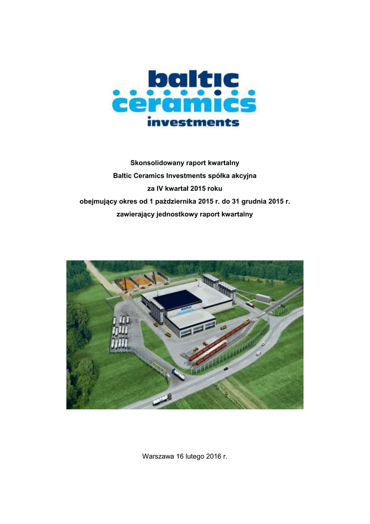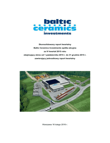 Skonsolidowany raport kwartalny Baltic Ceramics Investments spółka akcyjna za IV kwartał 2015 roku obejmujący okres od 1 października 2015 r. do 31 grudnia 2015 r. zawierający jednostkowy raport kwartalny Warszawa 16 lutego 2016 r. Pismo Prezesa Zarządu Spółki Dominującej Szanowni Akcjonariusze, w imieniu grupy kapitałowej Baltic Ceramics Investments S.A. przedstawiam Państwu skonsolidowany raport za IV kwartał 2015 r., obejmujący okres od 1 października 2015 r. do 31 grudnia 2015 r. wraz z danymi porównawczymi za okres okres od 1 października 2014 r. do 31 grudnia 2014 r. Grupę kapitałową tworzą Baltic Ceramics Investments S.A. jako spółka dominująca oraz spółki zależne: Baltic Ceramics S.A. i Res Immobiles sp. z o.o. (spółka zarządzająca nieruchomościami). Plany strategii rozwoju grupy kapitałowej Baltic Ceramics Investments S.A. są oczywiście związane z budową pierwszej w Unii Europejskiej fabryki proppantów ceramicznych i osiągnięciem w pierwszym etapie mocy produkcyjnych na poziomie 60 tys. ton rocznie, a docelowo 135 tys. ton rocznie. W minionym kwartale grupa opracowywała nowy harmonogram inwestycji budowy zakładu proppantów ceramicznych. Główna zmiana polega na przesunięciu daty zakończenia projektu na 30 września 2016 r. Przyczyną przesunięcia terminu uruchomienia zakładu była konieczność uwzględnienia w nowym harmonogramie zmian w infrastrukturze budowlanej i techniczno – technologicznej, wprowadzonych w trakcie realizacji projektu. W ramach prowadzonych przez Baltic Ceramics S.A. postępowań ofertowych dostawcy przedstawiali layout dostarczanych linii i urządzeń, który jest sporządzany w 2D. Dopiero wygenerowanie wszystkich elementów linii w programie przestrzennym DWG (3D), co było możliwe dopiero po zakończeniu wszystkich postępowań ofertowych, pozwoliło wykryć kolizje pomiędzy urządzeniami poszczególnych dostawców. Dotyczyło to w szczególności usytuowania systemu transportów, które kolidowało pomiędzy urządzeniami linii granulacji mechanicznej oraz linii selekcji granulatu. Wykrycie ww. kolizji i konieczność ich usunięcia na etapie projektowania spowodowało przesunięcie w czasie procesu produkcji niektórych urządzeń, a to z kolei wpłynęło na opóźnienia w realizacji całego projektu. Chciałbym również przypomnieć, iż doprowadzenie do pewności, że technologia produkcji będzie prawidłowa, wymagało testów w 6 krajach na dwóch kontynentach, powtarzanych dwukrotnie, co wymagało ponad 12 miesięcy i bezpośrednio wpłynęło na pewne opóźnienia, ale dało pewność i bezpieczeństwo zastosowanych rozwiązań. Nie jestem zadowolony z przesunięcia terminu oddania inwestycji do użytkowania, ale podkreślam, że istniały ku temu obiektywne przesłanki. Wszystkie wprowadzone modyfikacje służą podniesieniu efektywności linii produkcyjnej oraz polepszeniu właściwości proppantów ceramicznych, które będą produkowane przy jej wykorzystaniu. Zachęcam Państwa do szczegółowego zapoznania się niniejszym skonsolidowanym raportem grupy Baltic Ceramics Investments S.A. za IV kwartał 2015 roku. Dariusz Janus, Prezes Zarządu SPIS TREŚCI I. PODSTAWA SPORZĄDZENIA RAPORTU OKRESOWEGO ZA IV KWARTAŁ 2015 R. ............ 4 II. PODSTAWOWE INFORMACJE O SPÓŁCE ................................................................................ 4 III. SKONSOLIDOWANE SPRAWOZDANIE FINANSOWE GRUPY KAPITAŁOWEJ EMITENTA ...... 6 IV. JEDNOSTKOWE SPRAWOZDANIE FINANSOWE EMITENTA V. INFORMACJA O ZASADACH PRZYJĘTYCH PRZY SPORZĄDZANIU RAPORTU , W TYM O .................................................... 9 ZMIANIE STOSOWANYCH ZASAD RACHUNKOWOŚCI ........................................................................ 12 VI. ZWIĘZŁA CHARAKTERYSTYKA ISTOTNYCH DOKONAŃ LUB NIEPOWODZEŃ EMITENTA W OKRESIE , KTÓREGO DOTYCZY RAPORT, WRAZ Z OPISEM NAJWAŻNIEJSZYCH CZYNNIKÓW I ZDARZEŃ, W SZCZEGÓLNOŚCI O NIETYPOWYM CHARAKTERZE , MAJĄCYCH WPŁYW NA OSIĄGNIĘTE WYNIKI ............................................................................................................................. 12 PROGNOZ WYNIKÓW FINANSOWYCH ......................................... 12 VII. INFORMACJA NA TEMAT VIII. OPIS STANU REALIZACJI DZIAŁAŃ I INWESTYCJI EMITENTA ORAZ HARMONOGRAM ICH REALIZACJI ........................................................................................................................................... 13 IX. INFORMACJE NA TEMAT AKTYWNOŚCI JAKĄ W OKRESIE OBJĘTYM RAPORTEM EMITENT PODEJMOWAŁ W OBSZARZE ROZWOJU PROWADZONEJ DZIAŁALNOŚCI NASTAWIONE NA WPROWADZENIE ROZWIĄZAŃ INNOWACYJNYCH ............................................................................. 13 X. OPIS ORGANIZACJI GRUPY PODLEGAJĄCYCH KONSOLIDACJI XI. KAPITAŁOWEJ ZE WSKAZANIEM JEDNOSTEK ..................................................................................................... 14 STRUKTURA AKCJONARIATU ................................................................................................ 15 INFORMACJE DOTYCZĄCE LICZBY OSÓB ZATRUDNIONYCH W PRZELICZENIU NA PEŁNE ETATY .................................................................................................................................................. 16 XII. XIII. INFORMACJE NA TEMAT AKTUALNEJ SYTUACJI W BRANŻY .............................................. 16 XIV. OŚWIADCZENIE Z ARZĄDU SPÓŁKI DOMINUJĄCEJ ............................................................. 18 I. PODSTAWA SPORZĄDZENIA RAPORTU OKRESOWEGO ZA IV KWARTAŁ 2015 R. Raport kwartalny grupy kapitałowej Baltic Ceramics Investments S.A. został sporządzony zgodnie z wytycznymi Załącznika nr 3 do Regulaminu Alternatywnego Systemu Obrotu „Informacje bieżące i okresowe przekazywane w Alternatywnym Systemie Obrotu na rynku NewConnect”. Sprawozdania finansowe zawarte w raporcie zostały sporządzone zgodnie z ustawą z dnia 29 września 