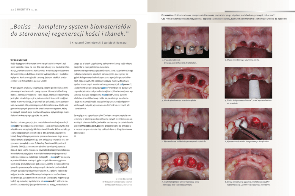 22 | IDENTITY 1_11 Przypadek 1: Krótkoterminowe zarządzanie kieszonką poekstrakcyjną z użyciem stożków kolagenowych collacone®. Cel: Przyśpieszenie pierwszej fazy gojenia, poprawa stabilizacji skrzepu, szybsze nabłonkowanie i zamknięcie wejścia do zębodołu. „Botiss – kompletny system biomateriałów do sterowanej regeneracji kości i tkanek.” | Krzysztof Chmielewski | Wojciech Ryncarz WPROWADZENIE Ilość dostępnych biomateriałów na rynku światowym i pol- czego po 2 latach uzyskujemy pełnowartościową kość własną skim wzrasta z roku na rok. Dla nas lekarzy jest to dobra infor- pacjenta w zastępstwie biomateriału. macja, ponieważ wzrost konkurencji mobilizuje producentów Sterowana regeneracja jest ściśle związana z użyciem różnego do tworzenia produktów o jeszcze wyższej jakości i ma także rodzaju materiałów opartych na kolagenie, począwszy od wpływ na konkurencyjność cenową. Jednym z takich produ- gąbek kolagenowych skończywszy na specjalistycznych bło- centów jest firma Botiss Dental GmbH. nach zaporowych. Do naszej dyspozycji mamy w tej chwili 1_Sytuacja wyjściowa. Siekacze zakwalifkowano do ekstrakcji. 2_Widok zębodołów po usunięciu zębów. 3_Widok zębodołów po usunięciu zębów. 4_Stożek kolagenowy collacone® przed wprowadzeniem do zębodołu. 5_Wprowadzanie stożka kolagenowego do zębodołu. 6_Wprowadzanie stożka kolagenowego do zębodołu. 7_Stożki kolagenowe szybko nasiąkają krwią i pomagają przy stabilizacji skrzepu. 8_Obraz kliniczny w 2 tygodnie po ekstrakcji: szybkie nabłonkowanie i zamknięcie wejścia do zębodołów. oprócz klasycznych membran kolagenowych jak collprotect®, W poniższym artykule, chcemy się z Wami podzielić naszymi także membranę osierdziową Jason® membrane o bardzo wy- pierwszymi wrażeniami z pracy system biomateriałów firmy trzymałej strukturze i przedłużonej funkcji barierowej oraz wy- Botiss. Zakres przypadków i ilość zdjęć, które przedstawiamy jątkową matrycę kolagenową mucoderm®, która swoimi jest tylko niewielką częścią dokumentacji fotograficznej jed- właściwościami i budową zbliża się do złotego standardu nakże mamy nadzieję, że pozwoli on pokazać zakres zastoso- i daje realną możliwość zastąpienia przeszczepów łącznot- wań i wskazań dla poszczególnych biomateriałów. Ujęła nas kankowych i użycia jej zarówno do technik klasycznych jak gama dostępnych produktów oraz kompletny system, który i tunelowych. w naszych oczach daje możliwość wyboru optymalnego materiału w konkretnym przypadku leczenia. Ze względu na ograniczoną ilość miejsca w tym artykule nie Bardzo ciekawą pozycją jest materiał o minimalnej resorbcji wań tych biomateriałów, jednakże zachęcamy do odwiedzania jesteśmy w stanie przedstawić wielu innych technik i zastosocerabone® pochodzenia wołowego, i jako jedyny na rynku nie- strony www.botiss.com.pl gdzie prezentowane są przypadki mieckim ma akceptację Ministerstwa Zdrowia, które uznało go w rozszerzonym zakresie i są uaktualniane o długoterminowe 100% bezpiecznym jeśli chodzi o BSE (choroba szalonych obserwacje. krów). Przy bliższym poznaniu procesu tworzenia tego mate- ■ riału odkrywa się tejemnicę z tym związaną - materiał jest wygrzewany powyżej 1200o C. Według Światowej Organizacji Zdrowia (WHO) zastosowanie obróbki termicznej powyżej 800o C daje 100% gwarancję czystości biologicznej materiału. Inne ciekawe pozycje to materiał do sterowanej regeneracji kości pochodzenia ludzkiego (allograft) – maxgraft® dostępny w postaci bloków kostnych gąbczastych i korowo–gąbczastych oraz granulatu kości gąbczastej. Jest to ciekawa alternatywa dla przeszczepów autogennych. Materiał pochodzi od żywych dawców i pozyskiwany jest m.in. z główki kości udowej pacjentów zakwalifikowanych do przeszczepów stawu biodrowego. Uzupełnieniem linii GBR (sterowana regeneracja kości) są materiały syntetyczne jak maxresorb®, których stopień i czas resorbcji jest podzielony na 2 etapy, w rezultacie (z lewej do prawej) Dr Krzysztof Chmielewski, Gdańsk Dr Wojciech Ryncarz, Warszawa Przypadek 2: Pokrycie recesji korzeni z wykorzystaniem matrycy kolagenowej mucoderm® zastępującej przeszczep tkanek miękkich. Przypadek 3: Długoterminowe zarządzanie kieszonką poekstrakcyjną materiałem syntetycznym maxresorb® inject. Cel: Pokrycie recesji, pogrubienie profilu tkankek miękkich, poszerzenie strefy dziąsła nieruchomego i skeratynizowanego. Cel: Wypełnienie zębodołu, zachowanie szerokości wyrostka, przebudowa materiału w 100% w kość własną pacjenta. 1_Sytuacja wyjściowa – widoczne recesje i bardzo wąska strefa dziąsła nieruchomego. 2_Odkręcenie korony tymczasowej na implancie Ankylos C/X. 1_Widok po usunięciu zęba trzonowego w żuchwie. Zachowane są wszystkie ściany zębodołu. 2_Implantacja natychmiastowa. Ankylos A11 został wprowadzony w przegrodę międzykorzeniową. 3_Oczyszczenie powierzchni zębów pastą gruboziarnistą. 4_Kondycjonowanie powierzhni korzeni Doxycyliną zmieszaną z solą fizlologiczną (2 minuty). 3_Ankylos został wprowadzony 1mm poniżej ścian kostnych zębodołu. 4_Wprowadzanie materiału maxresorb® inject. Szybkie nasączanie materiału krwią. 5_Rozszczepienie płata. Okostna pozostaje nienaruszona. 6_Wprowadzanie i stabilizacja matrycy mucoderm® szwami resorbowalnymi. 5_Widoczna platforma implantu i materiał wprowadzony w zębodół. 6_Gojenie otwarte implantu po założeniu śruby gojącej. Uszczelnienie brzegów szwem materacowym 7_Szczelne szycie z przesunięciem dokoronowym płata i stabilizacja szwami 5-0 8_Obraz 3 miesiące po zabiegu. Widoczne pogrubienie dziąsła i poszerzenie strefy skeratynizowanej. 7_Gojenie po 3 miesiącach od implantacji. 8_Po zdjęciu śruby widać wygojone tkanki miękkie i zachowaną szerokość wyrostka. Przypadek 4: Podniesienie dna zatoki szczękowej z jednoczesną re