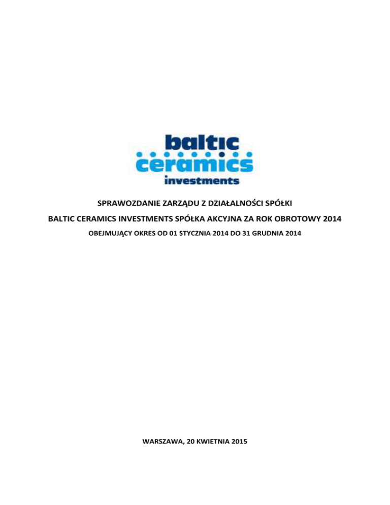 SPRAWOZDANIE ZARZĄDU Z DZIAŁALNOŚCI SPÓŁKI BALTIC CERAMICS INVESTMENTS SPÓŁKA AKCYJNA ZA ROK OBROTOWY 2014 OBEJMUJĄCY OKRES OD 01 STYCZNIA 2014 DO 31 GRUDNIA 2014 WARSZAWA, 20 KWIETNIA 2015 Baltic Ceramics Investments spółka akcyjna Sprawozdanie Zarządu z działalności Spółki za 2014 rok SPIS TREŚCI I. INFORMACJE OGÓLNE O SPÓŁCE ................................................................................................3 II. STRUKTURA ORGANIZACYJNA .....................................................................................................7 III. ZATRUDNIENIE .............................................................................................................................7 IV. ZDARZENIA ISTOTNIE WPŁYWAJĄCE NA DZIAŁALNOŚĆ SPÓŁKI, JAKIE NASTĄPIŁY W ROKU OBROTOWYM, A TAKŻE PO JEGO ZAKOŃCZENIU, DO DNIA ZATWIERDZENIA SPRAWOZDANIA FINANSOWEGO ................................................................................................7 V. PRZEWIDYWANY ROZWÓJ SPÓŁKI ........................................................................................... 13 VI. WAŻNIEJSZE OSIĄGNIĘCIA W DZIEDZINIE BADAŃ I ROZWOJU ................................................ 14 VII. AKTUALNA I PRZEWIDYWANA SYTUACJA FINANSOWA ........................................................... 14 VIII. INFORMACJE O NABYCIU AKCJI WŁASNYCH, A W SZCZEGÓLNOŚCI CELU ICH NABYCIA, LICZBIE I WARTOŚCI NOMINALNEJ, ZE WSKAZANIEM, JAKĄ CZĘŚĆ KAPITAŁU ZAKŁADOWEGO REPREZENTUJĄ, CENIE NABYCIA ORAZ CENIE SPRZEDAŻY TYCH UDZIAŁÓW (AKCJI) W PRZYPADKU ICH ZBYCIA ........................................................................................... 16 IX. POSIADANE PRZEZ SPÓŁKĘ ODDZIAŁY ...................................................................................... 16 X. INFORMACJE O INSTRUMENTACH FINANSOWYCH W ZAKRESIE RYZYKA: ZMIANY CEN, KREDYTOWEGO, ISTOTNYCH ZAKŁÓCEŃ ORAZ UTRATY PŁYNNOŚCI FINANSOWEJ, NA JAKIE NARAŻONA JEST JEDNOSTKA ................................................................................................... 16 XI. INFORMACJE O INSTRUMENTACH FINANSOWYCH W ZAKRESIE PRZYJĘTYCH PRZEZ JEDNOSTKĘ CELACH I METODACH ZARZĄDZANIA RYZYKIEM FINANSOWYM, ŁĄCZNIE Z METODAMI ZABEZPIECZENIA ISTOTNYCH RODZAJÓW PLANOWANYCH TRANSAKCJI, DLA KTÓRYCH STOSOWANA JEST RACHUNKOWOŚĆ ZABEZPIECZEŃ .............................................. 16 XII. INFORMACJE O STOSOWANIU ZASAD ŁADU KORPORACYJNEGO W PRZYPADKU JEDNOSTEK, KTÓRE ZOSTAŁY DOPUSZCZONE DO OBROTU NA JEDNYM Z RYNKÓW REGULOWANYCH EUROPEJSKIEGO OBSZARU GOSPODARCZEGO ........................................................................ 17 2 Baltic Ceramics Investments spółka akcyjna Sprawozdanie Zarządu z działalności Spółki za 2014 rok Sprawozdanie z działalności Spółki Baltic Ceramics Investments spółka akcyjna („Spółka”, „Emitent”, „BCI”) z siedzibą w Warszawie obejmuje rok obrotowy 2014 rozpoczynający się 01 stycznia 2014 roku i kończący się 31 grudnia 2014 roku. Zgodnie z §19 Statutu Spółki rokiem obrotowym Spółki jest rok kalendarzowy. I. 1. INFORMACJE OGÓLNE O SPÓŁCE Dane identyfikacyjne Firma spółki brzmi: Baltic Ceramics Investments spółka akcyjna Siedziba Spółki: Warszawa Adres Spółki: ul. Piękna 11/17, 00-547 Warszawa Telefon: (22) 629 07 18 Fax: (22) 203 46 24 E-mail: [email protected] Adres internetowy: www.balticceramicsinvestments.com NIP: 5252482136 Regon: 142449320 Forma prawna: Spółka została wpisana 06 sierpnia 2010 roku do rejestru przedsiębiorców prowadzonego przez Sąd Rejonowy dla m.st. Warszawy w Warszawie, XII Wydział Gospodarczy Krajowego Rejestru Sądowego pod numerem KRS 0000362454. Spółka została zawiązana na czas nieoznaczony. Kapitał zakładowy Spółki: Kapitał zakładowy Spółki na dzień 31 grudnia 2014 roku wynosił 4 518 926,60 zł i dzielił się na 45 189 266 akcji zwykłych na okaziciela, o wartości nominalnej 0,10 zł każda. Kapitał zakładowy został pokryty w całości. 3 Baltic Ceramics Investments spółka akcyjna Sprawozdanie Zarządu z działalności Spółki za 2014 rok 2. Struktura własnościowa Na dzień przekazania niniejszego raportu struktura własnościowa w Spółce kształtowała się następująco: Akcjonariat Spółki na dzień 20 kwietnia 2015 roku Akcjonariusz Liczba akcji Udział w kapitale zakładowym Udział w liczbie głosów na WZ IndygoTech Minerals S.A. 21 525 902 47,63% 47,63% LZMO S.A. 15 000 000 33,19% 33,19% Pozostali 8 663 364 19,18% 19,18% 45 189 266 100,00% 100,00% RAZEM Źródło: Dane własne Spółki Akcjonariat Spółki na dzień 20 kwietnia 2014 roku 19,18 % 47,63 % 33,19 % IndygoTech Minerals S.A. LZMO S.A. Pozostali Źródło: Dane Zarządu Spółki 4 Baltic Ceramics Investments spółka akcyjna Sprawozdanie Zarządu z działalności Spółki za 2014 rok Na dzień 31.12. 2014 roku struktura własnościowa w Spółce kształtowała się następująco: Akcjonariat Spółki na dzień 31 grudnia 2014 roku Akcjonariusz Liczba akcji Udział w kapitale zakładowym Udział w liczbie głosów na WZ IndygoTech Minerals S.A. 21 525 902 47,63% 47,63% LZMO S.A. 15 000 000 33,19% 33,19% Pozostali 8 663 364 19,18% 19,18% 45 189 266 100,00% 100,00% RAZEM Źródło: Dane własne Spółki Akcjonariat Spółki na dzień 31 grudnia 2014 roku 19,18 % 47,63 % 33,19 % IndygoTech Minerals S.A. LZMO S.A. Pozostali Źródło: Dane własne Spółki 5 Baltic Ceramics Investments spółka akcyjna Sprawozdanie Zarządu z działalności Spółki za 2014 rok 3. Zarząd: Organy spółki Dariusz Janus – Prezes Zarządu (od 05.06.2014 ) Piotr Woźniak – Prezes Zarządu (do 05.06.2014) W dniu 20 stycznia 2014 roku w związku z upływem kadencji Prezesa Zarządu, Rada Nadzorcza Spółki podjęła uchwałę o powołaniu Pana Piotra Woźniaka na Prezesa Zarządu na kolejną trzyletnią kadencję. Rada Nadzorcza Emitenta dnia 05 czerwca 2014 roku, odwołała z 