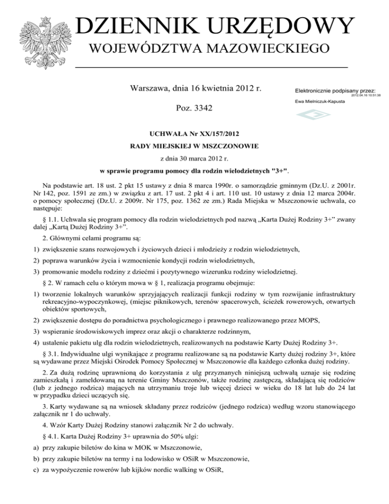 DZIENNIK URZĘDOWY WOJEWÓDZTWA MAZOWIECKIEGO Warszawa, dnia 16 kwietnia 2012 r. Elektronicznie podpisany przez: 2012.04.16 10:51:38 Ewa Mielniczuk-Kapusta Poz. 3342 UCHWAŁA Nr XX/157/2012 Public key: RADY MIEJSKIEJ W MSZCZONOWIE Data: 2012-04-16 z dnia 30 marca 2012 r. w sprawie programu pomocy dla rodzin wielodzietnych "3+". Na podstawie art. 18 ust. 2 pkt 15 ustawy z dnia 8 marca 1990r. o samorządzie gminnym (Dz.U. z 2001r. Nr 142, poz. 1591 ze zm.) w związku z art. 17 ust. 2 pkt 4 i art. 110 ust. 10 ustawy z dnia 12 marca 2004r. o pomocy społecznej (Dz.U. z 2009r. Nr 175, poz. 1362 ze zm.) Rada Miejska w Mszczonowie uchwala, co następuje: § 1.1. Uchwala się program pomocy dla rodzin wielodzietnych pod nazwą „Karta Dużej Rodziny 3+” zwany dalej „Kartą Dużej Rodziny 3+”. 2. Głównymi celami programu są: 1) zwiększenie szans rozwojowych i życiowych dzieci i młodzieży z rodzin wielodzietnych, 2) poprawa warunków życia i wzmocnienie kondycji rodzin wielodzietnych, 3) promowanie modelu rodziny z dziećmi i pozytywnego wizerunku rodziny wielodzietnej. § 2. W ramach celu o którym mowa w § 1, realizacja programu obejmuje: 1) tworzenie lokalnych warunków sprzyjających realizacji funkcji rodziny w tym rozwijanie infrastruktury rekreacyjno-wypoczynkowej, (miejsc piknikowych, terenów spacerowych, ścieżek rowerowych, otwartych obiektów sportowych, 2) zwiększenie dostępu do poradnictwa psychologicznego i prawnego realizowanego przez MOPS, 3) wspieranie środowiskowych imprez oraz akcji o charakterze rodzinnym, 4) ustalenie pakietu ulg dla rodzin wielodzietnych, realizowanych na podstawie Karty Dużej Rodziny 3+. § 3.1. Indywidualne ulgi wynikające z programu realizowane są na podstawie Karty dużej rodziny 3+, które są wydawane przez Miejski Ośrodek Pomocy Społecznej w Mszczonowie dla każdego członka dużej rodziny. 2. Za dużą rodzinę uprawnioną do korzystania z ulg przyznanych niniejszą uchwałą uznaje się rodzinę zamieszkałą i zameldowaną na terenie Gminy Mszczonów, także rodzinę zastępczą, składającą się rodziców (lub z jednego rodzica) mających na utrzymaniu troje lub więcej dzieci w wieku do 18 lat lub do 24 lat w przypadku dzieci uczących się. 3. Karty wydawane są na wniosek składany przez rodziców (jednego rodzica) według wzoru stanowiącego załącznik nr 1 do uchwały. 4. Wzór Karty Dużej Rodziny stanowi załącznik Nr 2 do uchwały. § 4.1. Karta Dużej Rodziny 3+ uprawnia do 50% ulgi: a) przy zakupie biletów do kina w MOK w Mszczonowie, b) przy zakupie biletów na termy i na lodowisko w OSiR w Mszczonowie, c) za wypożyczenie rowerów lub kijków nordic walking w OSiR, Dziennik Urzędowy Województwa Mazowieckiego –2– Poz. 3342 d) przy wejściu na halę sportową oraz na boiska OSiR-u, e) w opłatach za zajęcia dla dzieci i młodzieży realizowane przez jednostki gminne, f) w opłatach za korzystanie przez dzieci ze świadczeń udzielanych przez przedszkole publiczne poza czasem przeznaczonym na bezpłatne nauczanie. 2. Karta Dużej Rodziny 3+ uprawnia do dopłat do kosztów wyjazdów na zielone szkoły w wysokości 50%. 3. Świadczenia, o których mowa w ust. 2 realizowane są przez Miejski Ośrodek Pomocy Społecznej w Mszczonowie na pisemny wniosek rodzica dziecka, poświadczony przez nauczyciela organizującego wyjazd. § 5. Okres ważności Karty Dużej Rodziny 3+ w granicach od 1 roku do 3 lat ustala MOPS uwzględniając wiek dzieci. § 6. Środki na realizację programu zabezpieczone są w budżecie Gminy Mszczonów. § 7.1. Koordynację realizacji programu powierza się MOPS. 2. Zobowiązuje się MOPS oraz gminne jednostki organizacyjne stosujące ulgi wynikające z programu do przedstawiania Radzie Miejskiej rocznych informacji o realizacji programu w terminie do 30 marca roku następnego. § 8. Wykonanie uchwały powierza się Burmistrzowi Mszczonowa. § 9. Uchwała wchodzi w życie 14 dni od dnia ogłoszenia w Dzienniku Urzędowym Województwa Mazowieckiego. Przewodniczący Rady Miejskiej: Łukasz Koperski Dziennik Urzędowy Województwa Mazowieckiego –3– Poz. 3342 Załącznik Nr 1 do Uchwały Nr XX/157/2012 Rady Miejskiej w Mszczonowie z dnia 30 marca 2012r. ……………………………………………. (imię i nazwisko) …………………………………………….. (adres) …………………………………………..… …………………………………………….. (seria i numer dowodu osobistego) Miejski Ośrodek Pomocy Społecznej ul. Grójecka 45 96-320 Mszczonów WNIOSEK o wydanie Karty DUŻEJ RODZINY Wnoszę o wydanie Kart DUŻEJ RODZINY 3+ uprawniających członków mojej rodziny do korzystania z uprawnień określonych w Programie pomocy dla rodzin wielodzietnych . Oświadczam, że moja rodzina składa się z następujących osób wspólnie zamieszkałych pod wyżej wskazanym adresem: 1. …………………………………………………………………………… (imię, nazwisko, data urodzenia Wnioskodawcy) 2. …………………………………………………………………………… (imię, nazwisko, data urodzenia, stopień pokrewieństwa) 3. …………………………………………………………………………… (imię, nazwisko, data urodzenia, stopień pokrewieństwa) 4. …………………………………………………………………………… (imię, nazwisko, data urodzenia, stopień pokrewieństwa) 5. …………………………………………………………………………… (imię, nazwisko, data urodzenia, stopień pokrewieństwa) 6. …………………………………………………………………………… (imię, nazwisko, data urodzenia, stopień pokrewieństwa) 7. …………………………………………………………………………… (imię, nazwisko, data urodzenia, stopień pokrewieństwa) 8. ………………………………………