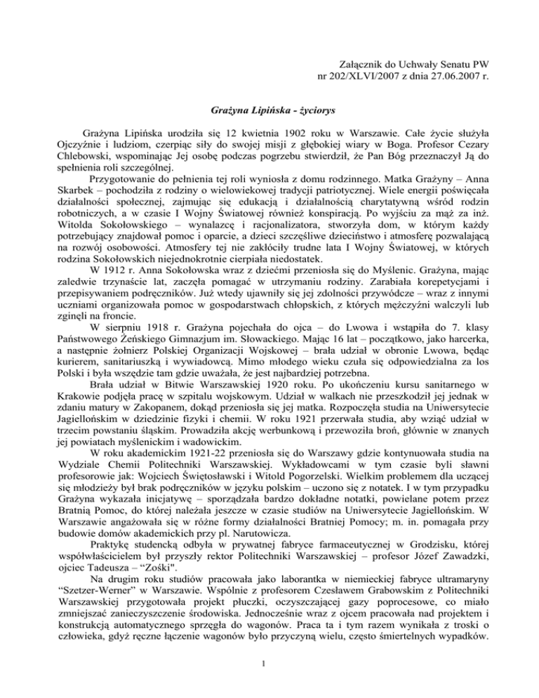 Załącznik do Uchwały Senatu PW nr 202/XLVI/2007 z dnia 27.06.2007 r. Grażyna Lipińska - życiorys Grażyna Lipińska urodziła się 12 kwietnia 1902 roku w Warszawie. Całe życie służyła Ojczyźnie i ludziom, czerpiąc siły do swojej misji z głębokiej wiary w Boga. Profesor Cezary Chlebowski, wspominając Jej osobę podczas pogrzebu stwierdził, że Pan Bóg przeznaczył Ją do spełnienia roli szczególnej. Przygotowanie do pełnienia tej roli wyniosła z domu rodzinnego. Matka Grażyny – Anna Skarbek – pochodziła z rodziny o wielowiekowej tradycji patriotycznej. Wiele energii poświęcała działalności społecznej, zajmując się edukacją i działalnością charytatywną wśród rodzin robotniczych, a w czasie I Wojny Światowej również konspiracją. Po wyjściu za mąż za inż. Witolda Sokołowskiego – wynalazcę i racjonalizatora, stworzyła dom, w którym każdy potrzebujący znajdował pomoc i oparcie, a dzieci szczęśliwe dzieciństwo i atmosferę pozwalającą na rozwój osobowości. Atmosfery tej nie zakłóciły trudne lata I Wojny Światowej, w których rodzina Sokołowskich niejednokrotnie cierpiała niedostatek. W 1912 r. Anna Sokołowska wraz z dziećmi przeniosła się do Myślenic. Grażyna, mając zaledwie trzynaście lat, zaczęła pomagać w utrzymaniu rodziny. Zarabiała korepetycjami i przepisywaniem podręczników. Już wtedy ujawniły się jej zdolności przywódcze – wraz z innymi uczniami organizowała pomoc w gospodarstwach chłopskich, z których mężczyźni walczyli lub zginęli na froncie. W sierpniu 1918 r. Grażyna pojechała do ojca – do Lwowa i wstąpiła do 7. klasy Państwowego Żeńskiego Gimnazjum im. Słowackiego. Mając 16 lat – początkowo, jako harcerka, a następnie żołnierz Polskiej Organizacji Wojskowej – brała udział w obronie Lwowa, będąc kurierem, sanitariuszką i wywiadowcą. Mimo młodego wieku czuła się odpowiedzialna za los Polski i była wszędzie tam gdzie uważała, że jest najbardziej potrzebna. Brała udział w Bitwie Warszawskiej 1920 roku. Po ukończeniu kursu sanitarnego w Krakowie podjęła pracę w szpitalu wojskowym. Udział w walkach nie przeszkodził jej jednak w zdaniu matury w Zakopanem, dokąd przeniosła się jej matka. Rozpoczęła studia na Uniwersytecie Jagiellońskim w dziedzinie fizyki i chemii. W roku 1921 przerwała studia, aby wziąć udział w trzecim powstaniu śląskim. Prowadziła akcję werbunkową i przewoziła broń, głównie w znanych jej powiatach myślenickim i wadowickim. W roku akademickim 1921-22 przeniosła się do Warszawy gdzie kontynuowała studia na Wydziale Chemii Politechniki Warszawskiej. Wykładowcami w tym czasie byli sławni profesorowie jak: Wojciech Świętosławski i Witold Pogorzelski. Wielkim problemem dla uczącej się młodzieży był brak podręczników w języku polskim – uczono się z notatek. I w tym przypadku Grażyna wykazała inicjatywę – sporządzała bardzo dokładne notatki, powielane potem przez Bratnią Pomoc, do której należała jeszcze w czasie studiów na Uniwersytecie Jagiellońskim. W Warszawie angażowała się w różne formy działalności Bratniej Pomocy; m. in. pomagała przy budowie domów akademickich przy pl. Narutowicza. Praktykę studencką odbyła w prywatnej fabryce farmaceutycznej w Grodzisku, której współwłaścicielem był przyszły rektor Politechniki Warszawskiej – profesor Józef Zawadzki, ojciec Tadeusza – “Zośki". Na drugim roku studiów pracowała jako laborantka w niemieckiej fabryce ultramaryny “Szetzer-Werner” w Warszawie. Wspólnie z profesorem Czesławem Grabowskim z Politechniki Warszawskiej przygotowała projekt płuczki, oczyszczającej gazy poprocesowe, co miało zmniejszać zanieczyszczenie środowiska. Jednocześnie wraz z ojcem pracowała nad projektem i konstrukcją automatycznego sprzęgła do wagonów. Praca ta i tym razem wynikała z troski o człowieka, gdyż ręczne łączenie wagonów było przyczyną wielu, często śmiertelnych wypadków. 1 W czasie studiów pracowała również w Królewskiej Hucie na Górnym Śląsku, będąc tam jedyną kobietą, posiadającą wykształcenie techniczne. W roku 1928 ukończyła, jako jedna z pierwszych kobiet, studia w Katedrze Maszynoznawstwa Chemicznego na Wydziale Chemicznym Politechniki Warszawskiej. W tym również roku Grażyna zawarła związek małżeński z kolegą ze studiów Edmundem Lipińskim. Małżeństwo to, prawdopodobnie wskutek niezgodności poglądów, w niedługim czasie rozpadło się. Grażyna podjęła studia w Instytucie Pedagogicznym na Uniwersytecie Warszawskim, które ukończyła po dwóch latach. Równolegle uczyła w gimnazjach im. Stefana Batorego, im. Marii Curie-Skłodowskiej, w Państwowej Żeńskiej Szkole Przemysłowo – Handlowej. Bardzo szybko zwróciła na siebie uwagę, jako utalentowany pedagog o wielkich zdolnościach organizatorskich. W początkach lat trzydziestych brała udział w pracach komisji przy Ministerstwie Wyznań Religijnych i Oświecenia Publicznego przygotowującej zmiany systemu szkolnictwa i programów nauczania. Jednocześnie przygotowywała pracę doktorską. W roku 1935 otrzymała propozycję objęcia funkcji dyrektora zespołu szkół zawodowych w Grodnie. Przepojona ideą Józefa Piłsudskiego, podtrzymywania polskości na ziemiach wschodnich, podjęła tę pracę, jako nowe, ważne wyzwanie. W Grodnie bardzo szybko pozyskała grono przyjaciół, którzy wspólnie z nią organizowali szkolnictwo i prowadzili działalność społeczną z zakresu kultury. Z Jej inicjatywy otwierano szkoły, których celem było wychowanie młodzieży w duchu patriotyzmu, dobrze wykształconej i odpowiedzialnej. Ponadto, zakładała i rozbudowywała internaty w celu ułatwienia nauki biednej młodzieży wiejskiej. Wciągała w tę działalność organizacje społeczne i wykorzystywała kontakty osobiste ze swoimi nauczycielami, m.in. z ówczesnym ministrem MWRiOP – profesorem Wo