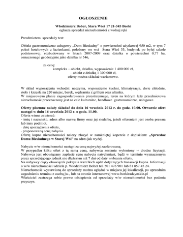 OGŁOSZENIE Włodzimierz Bober, Stara Wieś 17 21-345 Borki ogłasza sprzedaż nieruchomości z wolnej ręki Przedmiotem sprzedaży test: Obiekt gastronomiczno-usługowy „Dom Biesiadny” o powierzchni użytkowej 950 m2, w tym 7 pokoi hotelowych z łazienkami, położony we wsi Stara Wieś 33, budynek po byłej szkole podstawowej, rozbudowany w latach 2007-2009 oraz działka o powierzchni 0,77 ha, oznaczonego geodezyjnie jako działka nr 546, za cenę: kompleks – obiekt, działka, wyposażenie 1 400 000 zł, – obiekt z działką 1 300 000 zł, oferty można składać wariantowo. W skład wyposażenia wchodzi: naczynia, wyposażenie kuchni, klimatyzacja, dwie chłodnie, stoły i krzesła na 220 miejsc, barek, wędzarnia z grillem oraz altanka. W miejscowym planie zagospodarowania przestrzennego, teren na którym leży przedmiotowa nieruchomość przeznaczony jest na cele kulturalne, handlowe gastronomiczne, usługowe. Oferty pisemne należy składać do dnia 16 września 2012 r. do godz. 10.00. Otwarcie ofert nastąpi w dniu 16 września 2012 r. o godz. 11.00. Oferta winna zawierać: - imię i nazwisko, adres albo nazwę firmy oraz jej siedzibę, jeżeli oferentem jest osoba prawna lub inny podmiot, - datę sporządzenia oferty, - proponowaną cenę nabycia. Ofertę kupna nieruchomości należy złożyć w zamkniętej kopercie z dopiskiem: „Sprzedaż Domu Biesiadnego w Starej Wsi” na adres jak wyżej. Nabycie w/w nieruchomości nastąpi za cenę najwyżej zaoferowaną. W przypadku kilku ofert z tą samą ceną, nabywca zostanie wyłoniony w drodze licytacji. Nabywca jest obowiązany zapłacić cenę nabycia natychmiast, bądź w terminie wyznaczonym przez sprzedającego jednak nie dłuższym niż 7 dni od daty wybrania oferty. Na nabywcy ciąży obowiązek pokrycia wszelkich opłat dotyczących transakcji kupna. Informacji o w/w nieruchomości udziela p. Włodzimierz Bober tel. 501 476 901 lub 81 857 45 24. Nieruchomość wystawioną do sprzedaży można oglądać w miejscu jej lokalizacji, po uprzednim uzgodnieniu terminu z osobą jw., lub na stronie internetowej www.borkiradzynskie.pl Właściciel zastrzega sobie prawo odstąpienia od sprzedaży w/w nieruchomości bez podania przyczyn.