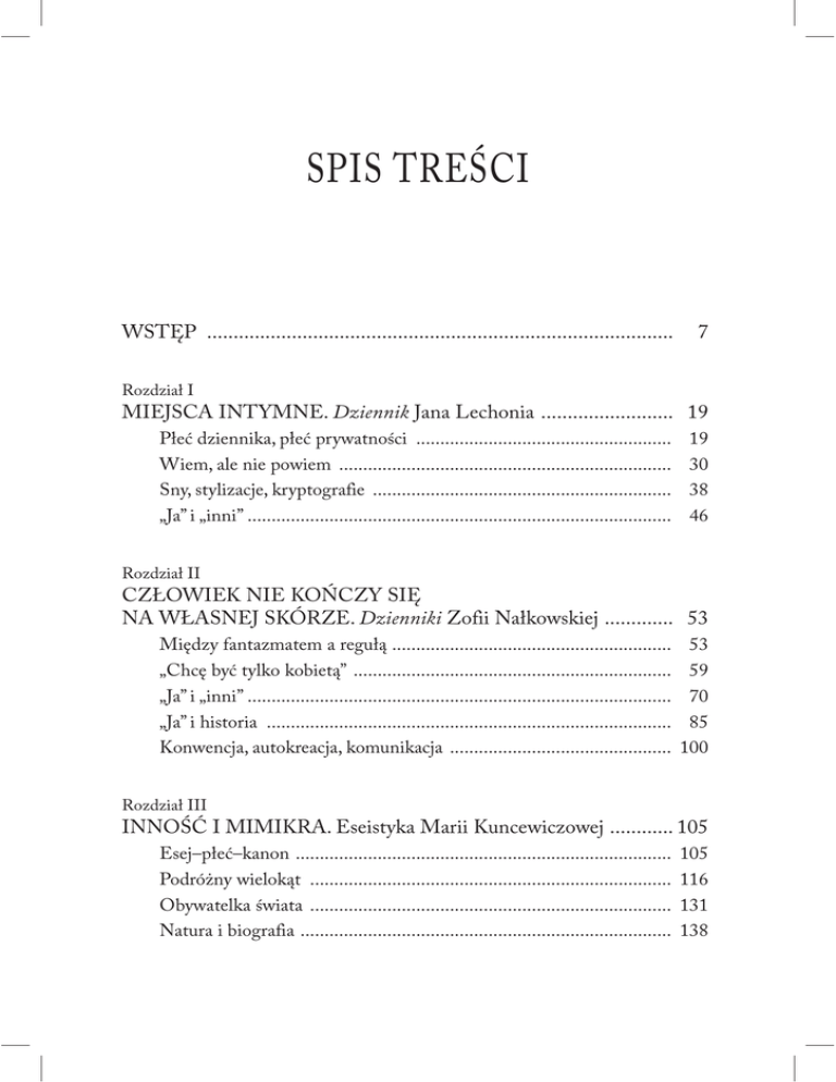 SPIS TREŚCI WSTĘP ........................................................................................ 7 Rozdział I MIEJSCA INTYMNE. Dziennik Jana Lechonia ......................... 19 Płeć dziennika, płeć prywatności ..................................................... Wiem, ale nie powiem ..................................................................... Sny, stylizacje, kryptografie .............................................................. „Ja” i „inni” ........................................................................................ 19 30 38 46 Rozdział II CZŁOWIEK NIE KOŃCZY SIĘ NA WŁASNEJ SKÓRZE. Dzienniki Zofii Nałkowskiej ............. 53 Między fantazmatem a regułą .......................................................... „Chcę być tylko kobietą” .................................................................. „Ja” i „inni” ........................................................................................ „Ja” i historia .................................................................................... Konwencja, autokreacja, komunikacja .............................................. 53 59 70 85 100 Rozdział III INNOŚĆ I MIMIKRA. Eseistyka Marii Kuncewiczowej ............ 105 Esej–płeć–kanon .............................................................................. Podróżny wielokąt ........................................................................... Obywatelka świata ........................................................................... Natura i biografia ............................................................................. 105 116 131 138 6 SPIS TREŚCI Rozdział IV W BRZUCHU WIELORYBA. Od Berdyczowa do Lafitów Jerzego Stempowskiego ....................... 145 Esej jako autobiografia ..................................................................... Brat Szekspira .................................................................................. Tradycja i nostalgia .......................................................................... Pisanie (o) historii ............................................................................ Europejczyk ..................................................................................... 145 152 162 173 182 ZAMIAST ZAKOŃCZENIA „Ja” czyli „ty”, „inny” czyli kto? ....................................................... 189 Bibliografia .................................................................................... 197 Indeks osób .................................................................................... 207