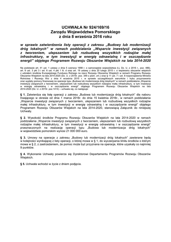 UCHWAŁA Nr 924/169/16 Zarządu Województwa Pomorskiego z dnia 8 września 2016 roku w sprawie zatwierdzenia listy operacji z zakresu „Budowy lub modernizacji dróg lokalnych” w ramach poddziałania „Wsparcie inwestycji związanych z tworzeniem, ulepszaniem lub rozbudową wszystkich rodzajów małej infrastruktury, w tym inwestycji w energię odnawialną i w oszczędzanie energii” objętego Programem Rozwoju Obszarów Wiejskich na lata 2014-2020 Na podstawie art. 41 ust. 1 ustawy z dnia 5 czerwca 1998 r. o samorządzie województwa (t.j. Dz. U. z 2016 r., poz. 486), art. 6 ust. 3 pkt 3 i art. 6 ust. 4 pkt 1 lit. d oraz art. 19 ustawy z dnia 20 lutego 2015 r. o wspieraniu obszarów wiejskich z udziałem środków Europejskiego Funduszu Rolnego na rzecz Rozwoju Obszarów Wiejskich w ramach Programu Rozwoju Obszarów Wiejskich na lata 2014-2020 (Dz. U. z 2015r. poz. 349 z późn. zm.) oraz § 11 ust. 7 i ust. 8 rozporządzenia Ministra Rolnictwa i Rozwoju Wsi z dnia 4 września 2015 r. w sprawie szczegółowych warunków i trybu przyznawania oraz wypłaty pomocy finansowej na operacje typu „Budowa lub modernizacja dróg lokalnych” w ramach poddziałania „Wsparcie inwestycji związanych z tworzeniem, ulepszaniem lub rozbudową wszystkich rodzajów małej infrastruktury, w tym inwestycji w energię odnawialną i w oszczędzanie energii” objętego Programem Rozwoju Obszarów Wiejskich na lata 2014-2020 (Dz. U. z 2015r. poz.1414) – uchwala się, co następuje: § 1. Zatwierdza się listę operacji z zakresu „Budowa lub modernizacja dróg lokalnych” dla naboru trwającego w okresie od dnia 1 marca 2016r. do dnia 15 kwietnia 2016r., w ramach poddziałania „Wsparcie inwestycji związanych z tworzeniem, ulepszaniem lub rozbudową wszystkich rodzajów małej infrastruktury, w tym inwestycji w energię odnawialną i w oszczędzanie energii” objętego Programem Rozwoju Obszarów Wiejskich na lata 2014-2020, stanowiącą Załącznik do niniejszej Uchwały. § 2. Wysokość środków Programu Rozwoju Obszarów Wiejskich na lata 2014-2020 w ramach poddziałania „Wsparcie inwestycji związanych z tworzeniem, ulepszaniem lub rozbudową wszystkich rodzajów małej infrastruktury, w tym inwestycji w energię odnawialną i w oszczędzanie energii” przeznaczonych na realizację operacji typu „Budowa lub modernizacja dróg lokalnych” w województwie pomorskim wynosi 21 000 000 euro. § 3. Umowy na operacje z zakresu „Budowy lub modernizacji dróg lokalnych” zawierane będą w kolejności wynikającej z listy operacji, o której mowa w § 1, do wyczerpania limitu środków o którym mowa w § 2, z zastrzeżeniem, że pomoc może być przyznana na operacje, które uzyskały co najmniej 9 punktów. § 4. Wykonanie Uchwały powierza się Dyrektorowi Departamentu Programów Rozwoju Obszarów Wiejskich. § 5. Uchwała wchodzi w życie z dniem podjęcia. UZASADNIENIE Stosownie do treści art. 6 ust. 3 pkt 3 ustawy z dnia 20 lutego 2015 r. o wspieraniu obszarów wiejskich z udziałem środków Europejskiego Funduszu Rolnego na rzecz Rozwoju Obszarów Wiejskich w ramach Programu Rozwoju Obszarów Wiejskich na lata 2014-2020 (Dz. U. z 2015r. poz. 349 z późn. zm.), Samorząd Województwa wykonuje zadania Instytucji Zarządzającej w zakresie wdrażania (m.in.) poddziałania „Wsparcie inwestycji związanych z tworzeniem, ulepszaniem lub rozbudową wszystkich rodzajów małej infrastruktury, w tym inwestycji w energię odnawialną i w oszczędzanie energii”, objętego działaniem – „Podstawowe usługi i odnowa wsi na obszarach wiejskich” w ramach Programem Rozwoju Obszarów Wiejskich na lata 2014-2020. Uchwałą Nr 77/110/16 z dnia 26 stycznia 2016r., Zarząd Województwa podjął decyzję o ogłoszeniu naboru wniosków o przyznanie pomocy dotyczących operacji typu „Budowa lub modernizacja dróg lokalnych” w ramach poddziałania „Wsparcie inwestycji związanych z tworzeniem, ulepszaniem lub rozbudową wszystkich rodzajów małej infrastruktury, w tym inwestycji w energię odnawialną i w oszczędzanie energii” objętego Programem Rozwoju Obszarów Wiejskich na lata 2014-2020, ustalając termin składania wniosków od dnia 1 marca 2016r. do dnia 15 kwietnia 2016r. W wymaganym terminie złożono 186 wniosków. Dwóch wnioskodawców zrezygnowało z realizacji operacji, dziewięciu odmówiono przyznania pomocy na podstawie § 10 ust. 3 cyt. Rozporządzenia. Zgodnie z § 11 ust. 7 i ust. 8 cyt. Rozporządzenia - po dokonaniu oceny wniosków właściwy organ samorządu województwa zatwierdza listę operacji, sporządzoną w kolejności uzyskanych przez nie punktów, zawierającą określenie wnioskodawcy oraz tytuł operacji. Mając na uwadze zasadę domniemania kompetencji na rzecz Zarządu Województwa, ten właśnie organ jest uprawniony do zatwierdzania listy operacji. Zgodnie z zapisami § 11 ust. 9 cyt. Rozporządzenia pomoc może być przyznana na operacje, które uzyskały co najmniej 9 punktów. W związku z powyższym wnioskodawcy operacji, dla których ww. warunek nie został spełniony, zostaną poinformowani o odmowie przyznania pomocy. Po zatwierdzeniu przez Zarząd Województwa Pomorskiego listy operacji zawierane będą umowy w kolejności wynikającej z pozycji na ww. liście do wyczerpania środków dostępnych dla województwa pomorskiego na realizację operacji typu „Budowa lub modernizacja dróg lokalnych” w ramach poddziałania „Wsparcie inwestycji związanych z tworzeniem, ulepszaniem lub rozbudową wszystkich rodzajów małej infrastruktury, w tym inwestycji w energię odnawialną i w oszczędzanie energii. Zgodnie z zapisami Załącznika do Rozporządzenia Ministra Rolnictwa i Rozwoju Wsi z dnia 12 października 2015r. w sprawie wysokości limitów środków dostępnych w poszczególnych województwach lub latach określonych działań lub poddziałań Programu Rozwoju Obszarów Wiejskich na lata 2014-2020 (Dz. U. z 2015r., poz. 1755) limi