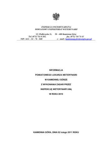 INSPEKCJA WETERYNARYJNA POWIATOWY INSPEKTORAT WETERYNARII Ul. Wałbrzyska 2c, Tel. (075) 743 0 264, NIP : 614 – 14 – 76 – 848 58 – 400 Kamienna Góra fax. (075) 744 74 43 e – mail : [email protected] INFORMACJA POWIATOWEGO LEKARZA WETERYNARII W KAMIENNEJ GÓRZE Z WYKONANIA ZADAŃ PRZEZ INSPEKCJĘ WETERYNARYJNĄ W ROKU 2010 KAMIENNA GÓRA, DNIA 02 lutego 2011 ROKU Zadania Inspekcji Weterynaryjnej: Inspekcja realizuje zadania z zakresu ochrony zdrowia zwierząt oraz bezpieczeństwa produktów pochodzenia zwierzęcego w celu zapewnienia ochrony zdrowia publicznego. Inspekcja wykonuje swoje zadania w szczególności przez: 1) zwalczanie chorób zakaźnych zwierząt, w tym chorób odzwierzęcych; 1a) badania kontrolne zakażeń zwierząt; 2) monitorowanie chorób odzwierzęcych i odzwierzęcych czynników chorobotwórczych oraz związanej z nimi oporności na środki przeciwdrobnoustrojowe u zwierząt, w produktach pochodzenia zwierzęcego i środkach żywienia zwierząt; 3) badanie zwierząt rzeźnych oraz produktów pochodzenia zwierzęcego; 4) przeprowadzanie kontroli weterynaryjnej w handlu i wywozie zwierząt oraz produktów w rozumieniu przepisów o kontroli weterynaryjnej w handlu; 5) sprawowanie nadzoru nad: a) bezpieczeństwem produktów pochodzenia zwierzęcego, w tym nad wymaganiami weterynaryjnymi przy ich produkcji, umieszczaniu na rynku oraz sprzedaży bezpośredniej, b) wprowadzaniem na rynek zwierząt i ubocznych produktów pochodzenia zwierzęcego, c) wytwarzaniem, obrotem i stosowaniem środków żywienia zwierząt, d) zdrowiem zwierząt przeznaczonych do rozrodu oraz jakością zdrowotną materiału biologicznego, jaj wylęgowych drobiu i produktów akwakultury, e) stosowaniem pasz leczniczych, f) przestrzeganiem przepisów o ochronie zwierząt, g) przestrzeganiem zasad identyfikacji i rejestracji zwierząt oraz przemieszczaniem zwierząt, h) przestrzeganiem wymagań weterynaryjnych w gospodarstwach utrzymujących zwierzęta gospodarskie, 5a) kontrolę spełnienia wymogów wzajemnej zgodności ( cross compliance), 6) prowadzenie monitorowania substancji niedozwolonych, pozostałości chemicznych, biologicznych, produktów leczniczych i skażeń promieniotwórczych u zwierząt, w ich wydzielinach i wydalinach, w tkankach lub narządach zwierząt, w produktach pochodzenia zwierzęcego, w wodzie przeznaczonej do pojenia zwierząt oraz środkach żywienia zwierząt; 7) prowadzenie wymiany informacji w ramach systemów wymiany informacji, o których mowa w przepisach Unii Europejskiej; 8) przyjmowanie informacji o niebezpiecznych produktach żywnościowych oraz środkach żywienia zwierząt od organów Państwowej Inspekcji Ochrony Roślin i Nasiennictwa, Inspekcji Jakości Handlowej Artykułów Rolno-Spożywczych, w zakresie kompetencji tych inspekcji, oraz od organów Inspekcji Handlowej o niebezpiecznych produktach żywnościowych pochodzenia zwierzęcego oraz ocena ryzyka i stopnia zagrożenia spowodowanego niebezpiecznym produktem żywnościowym lub środkiem żywienia zwierząt, a następnie przekazywanie tych informacji do kierującego siecią systemu RASFF, o którym mowa w art. 40b ustawy z dnia 11 maja 2001 r. o warunkach zdrowotnych żywności i żywienia (Dz. U. z 2005 r. Nr 31, poz. 265 i Nr 178, poz. 1480). 2 I. W sferze działań dotyczących nadzoru nad higieną pozysku, produkcji, magazynowania żywności zwierzęcego pochodzenia oraz transportu mleka realizowane były poniższe zadania : 1. Nadzór bieżący nad warunkami produkcji i magazynowania żywności zwierzęcego pochodzenia, z uwzględnieniem warunków pozysku mleka do przetwórstwa. 2. Udział w krajowym monitoringu zawartości substancji niedozwolonych, pozostałości chemicznych, biologicznych, produktów leczniczych i skażeń promieniotwórczych u zwierząt i w produktach pochodzenia zwierzęcego. 3. Kontrola pracy lekarzy weterynarii wyznaczonych do badania zwierząt rzeźnych i mięsa. Ad. 1. W roku 2010 działania w zakresie nadzoru bieżącego nad warunkami produkcji i magazynowania żywności zwierzęcego pochodzenia prowadzone były w 7 podmiotach zajmujących się przetwórstwem żywności. W obiektach tych przeprowadzono w ciągu roku 20 kontroli i wizytacji. W roku 2010 kontrole przeprowadzane w zakładach przetwórczych ukierunkowane były na sprawdzanie przestrzegania w nich zasad higieny na wszystkich etapach produkcji, wpływu prowadzonych prac remontowych i modernizacyjnych na bezpieczeństwo produkowanej żywności. Kontrole Inspekcji były prowadzone zgodnie z ujednoliconymi ogólnopolskimi regułami zawartymi w instrukcji Głównego Lekarza Weterynarii. W ramach prowadzonego nadzoru zostały pobrane również próbki urzędowe środków spożywczych zwierzęcego pochodzenia, to jest : próbki ryb w kierunku obecności Listeria monocytogenes oraz próbki twarogu w kierunku obecności E. Coli. W powiecie kamiennogórskim funkcjonują trzy kategorie podmiotów : 1. Zatwierdzone do handlu - 4 2. Prowadzące działalność marginalną, lokalną, ograniczoną - 3 3. Zakwalifikowane do sprzedaży bezpośredniej – 21 (1 podmiot sprzedaży ryb, 20 podmiotów sprzedaży miodu) Wojewódzki Lekarz Weterynarii przeprowadził kontrolę weryfikującą prawidłowość kwalifikowania podmiotów do poszczególnych kategorii i nie kwestionował rozstrzygnięć Powiatowego Lekarza Weterynarii w Kamiennej Górze. W powiecie kamiennogórskim funkcjonuje 99 puktów pozysku mleka, w których przeprowadzono 11 kontroli. Wydano 5 decyzji zakazujących wprowadzania mleka surowego do skupu ze względu na niezgodne z przepisami parametry mikrobiologiczne surowca, 6 decyzji o wpisie podmiotów sprzedaży bezpośredniej do rejestru PLW oraz 2 decyzje zatwierdzające projekty technologiczne zakładów. Na terenie powiatu funkcjonują również 2 podmioty zajmujące się skupem dziczyzny, które także zostały skontrolowane. 3 Ad. 2. W okresie sprawozdawczym realizując program monitorowania żywnoś