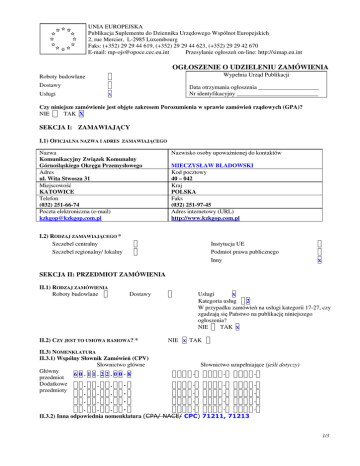 UNIA EUROPEJSKA Publikacja Suplementu do Dziennika Urz dowego Wspólnot Europejskich 2, rue Mercier, L-2985 Luxembourg Faks: (+352) 29 29 44 619, (+352) 29 29 44 623, (+352) 29 29 42 670 E-mail: [email protected] Przesyłanie ogłosze on-line: http://simap.eu.int OGŁOSZENIE O UDZIELENIU ZAMÓWIENIA Roboty budowlane x Dostawy x Usługi x Wypełnia Urz d Publikacji Data otrzymania ogłoszenia ____________________ Nr identyfikacyjny ___________________________ Czy niniejsze zamówienie jest obj te zakresem Porozumienia w sprawie zamówie rz dowych (GPA)? NIE X TAK X SEKCJA I: ZAMAWIAJ CY I.1) OFICJALNA NAZWA I ADRES ZAMAWIAJ CEGO Nazwa Komunikacyjny Zwi zek Komunalny Górno l skiego Okr gu Przemysłowego Adres ul. Wita Stwosza 31 Miejscowo KATOWICE Telefon (032) 251-66-74 Poczta elektroniczna (e-mail) [email protected] I.2) RODZAJ ZAMAWIAJ CEGO * Szczebel centralny Szczebel regionalny/ lokalny Nazwisko osoby upowa nionej do kontaktów MIECZYSŁAW BLADOWSKI Kod pocztowy 40 – 042 Kraj POLSKA Faks (032) 251-97-45 Adres internetowy (URL) http://www.kzkgop.com.pl x x Instytucja UE Podmiot prawa publicznego Inny x x x SEKCJA II: PRZEDMIOT ZAMÓWIENIA II.1) RODZAJ ZAMÓWIENIA Roboty budowlane x Dostawy II.2) CZY JEST TO UMOWA RAMOWA? * II.3) NOMENKLATURA II.3.1) Wspólny Słownik Zamówie (CPV) Słownictwo główne Główny 60.11.22.00-8 przedmiot Dodatkowe 6 0 . 1 1 . 2 2 . 0 0 - 8 przedmioty 60.11.22.00-8 60.11.22.00-8 60.11.22.00-8 II.3.2) Inna odpowiednia nomenklatura Usługi x Kategoria usług x 2 W przypadku zamówie na usługi kategorii 17-27, czy zgadzaj si Pa stwo na publikacj niniejszego ogłoszenia? NIE x TAK x x NIE x TAK x Słownictwo uzupełniaj ce (je li dotyczy) x x x x -x x x x x -x x x x x -x x x x x x x x x x x x x x -x x -x x -x x -x x x x x x x x x x x x x x -x x -x x -x x -x x x x x x x x x x x x x x -x x -x x -x x -x 1/3 II.4) NAZWA NADANA ZAMÓWIENIU PRZEZ ZAMAWIAJ CEGO * Wykonywanie usług autobusowego transportu publicznego na linii komunikacji autobusowej nr S-3 II.5) KRÓTKI OPIS Przedmiotem zamówienia jest wykonywanie usług autobusowego transportu publicznego na linii komunikacji autobusowej nr S-3 w Katowicach relacji: Piotra Skargi – Centrum Handlowe 3 Stawy. Linia kursuje zgodnie z rozkładem jazdy i obsługiwana jest dwoma autobusami o pojemno ci od 86 do 115 miejsc. II.6) SZACUNKOWA WARTO 840.850,00 CAŁKOWITA (bez VAT) SEKCJA IV: PROCEDURA IV.1) RODZAJ PROCEDURY Otwarta X Przyspieszona ograniczona X Ograniczona X Przyspieszona negocjacyjna X Negocjacyjna z uprzednim ogłoszeniem X Negocjacyjna bez uprzedniego ogłoszenia X IV.1.1) Uzasadnienie wyboru procedury negocjacyjnej bez uprzedniego ogłoszenia: patrz Zał cznik IV.2) KRYTERIA OCENY OFERT Najni sza cena X lub oferta najbardziej korzystna ekonomicznie pod wzgl dem X __________________________________ ______________________________________ __________________________________ ______________________________________ SEKCJA V: UDZIELENIE ZAMÓWIENIA V.1) UDZIELENIE I WARTO ZAMÓWIENIA V.1.1) Nazwa i adres dostawcy, wykonawcy lub usługodawcy, któremu udzielono zamówienia ZAMÓWIENIE Nr 18 Nazwa Nazwisko osoby upowa nionej do kontaktów Adres Miejscowo Chorzów Telefon Kod pocztowy 41-506 Kraj Polska Faks Poczta elektroniczna (e-mail) [email protected] Adres internetowy (URL) http://www.pkm-bytom-sa.com.pl/ Usługi Przewozowe Henryk Polak ul. Wieniawskiego18 (032) 246-17-52 Henryk Polak (032) 246-17-52 V.1.2) Informacja o warto ci zamówienia lub o najta szej i najdro szej ofercie branej pod uwag (bez VAT) Cena 840 850,00 zł lub: najta sza oferta / najdro sza oferta Waluta PLN V.2) PODWYKONAWSTWO V.2.1) Czy przewidywane jest powierzenie wykonania zamówienia podwykonawcom? NIE X TAK X Je li tak, okre li przewidywan warto lub cz zamówienia, która zostanie powierzona podwykonawcom Warto (bez VAT): ________________________ Waluta: ______________ Cz : _____________ % Nie jest znana X .............................. (Wykorzysta powy sz sekcj formularza tyle razy, ile jest to konieczne) ............................. 2/3 SEKCJA VI: INNE INFORMACJE VI.1) CZY PUBLIKACJA OGLOSZENIA JEST NIEOBOWI NIE X TAK X ZKOWA? VI.2) NUMER REFERENCYJNY NADANY SPRAWIE PRZEZ ZAMAWIAJ CEGO * ZP/PO/8/DZ/19/06 VI.3) DATA UDZIELENIA ZAMÓWIENIA 2 7 / 0 4 / 2 0 0 6 (dd/mm/rrrr) VI.4) LICZBA OTRZYMANYCH OFERT 332 VI.5) CZY ZAMÓWIENIE BYŁO OGŁOSZONE W DZIENNIKU URZ NIE X DOWYM UE? TAK X Je li tak, poda odesłanie do ogłoszenia Numer ogłoszenia w 2 0 0 6 /S 2 2 9–0 3 2 1 3 4 z1 1/0 2/2 0 0 6 spisie Dz. Urz. UE VI.6) CZY ZAMÓWIENIE DOTYCZY PROJEKTU/ PROGRAMU FINANSOWANEGO ZE (dd/mm/rrrr) RODKÓW UE? * NIE X TAK X Je li tak, wskaza projekt/ program oraz wszelkie pomocne odniesienia ___________________________ ____________________________________________________________________________________ ____________________________________________________________________________________ VI.7) INNE INFORMACJE (o ile dotyczy) ____________________________________________________________________________________ ____________________________________________________________________________________ ____________________________________________________________________________________ ____________________________________________________________________________________ ____________________________________________________________________________________ ____________________________________________________________________________________ VI.8) DATA WYSŁANIA OGŁOSZENIA 1 0 / 0 5 / 2 0 0 6 (dd/mm/rrrr) 3/3