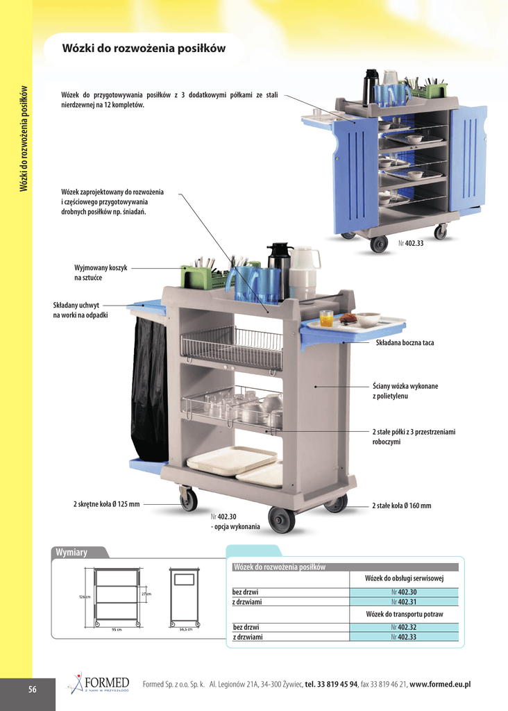 Wózki do rozwożenia posiłków Wózki do rozwożenia posiłków Wózek do przygotowywania posiłków z 3 dodatkowymi półkami ze stali nierdzewnej na 12 kompletów. Wózek zaprojektowany do rozwożenia i częściowego przygotowywania drobnych posiłków np. śniadań. Nr 402.33 Wyjmowany koszyk na sztućce Składany uchwyt na worki na odpadki Składana boczna taca Ściany wózka wykonane z polietylenu 2 stałe półki z 3 przestrzeniami roboczymi 2 skrętne koła Ø 125 mm 2 stałe koła Ø 160 mm Nr 402.30 - opcja wykonania Wymiary Wózek do rozwożenia posiłków Wózek do obsługi serwisowej 56 bez drzwi z drzwiami Nr 402.30 Nr 402.31 Wózek do transportu potraw bez drzwi z drzwiami Nr 402.32 Nr 402.33 Formed Sp. z o.o. Sp. k. Al. Legionów 21A, 34-300 Żywiec, tel. 33 819 45 94, fax 33 819 46 21, www.formed.eu.pl Wózki do rozwożenia posiłków Wózki do rozwożenia posiłków Kosz 25l w opcji Zabezpieczenie przed wypadaniem tac i kontenerów gastronomicznych Nr 402.36 - opcja wykonania Uchwyt na blacie z każdej strony Blat o grubości 15/10 – tłumiący dźwięki Panele boczne i drzwi z tworzywa sztucznego Koła Ø 125 mm Elementy konstrukcyjne wózka ze stali nierdzewnej Nr 402.37 - opcja wykonania Podłoga wózka ze stali nierdzewnej Wózek do rozwożenia posiłków Wymiary 2 przedziałowy z 4 drzwiami Nr 402.36 3 przedziałowy z 6 drzwiami Nr 402.37 Opcje Nr 402.36 Nr 402.37 2 przedziały: dla 12 tac 530 x 325 lub 24 tac 265 x 325 i kontenery gastronomiczne z poliwęglanu do powieszenia na górnym poziomie 3 przedziały: dla 18 tac 530 x 325 lub 36 tac 265 x 325 i kontenery gastronomiczne z poliwęglanu do powieszenia na środkowym poziomie Miejsce pomiędzy dwoma poziomami 9,8 cm Gastronomiczne pojemniki z poliwęglanu Wymiary 530 x 325 mm - H150 mm 530 x 325 mm - H 100 mm Nr 495.66 Nr 495.67 Poręcz ze stali nierdzewnej Wózek Nr 402.36 Wózek Nr 402.37 Nr 495.73 Nr 495.74 OPCJE Kosz 25 l z uchwytem ze stali nierdzewnej Dopłata za 2 koła z blokadą Nr 495.65 Nr 495.68 Formed Sp. z o.o. Sp. k. Al. Legionów 21A, 34-300 Żywiec, tel. 33 819 45 94, fax 33 819 46 21, www.formed.eu.pl 57