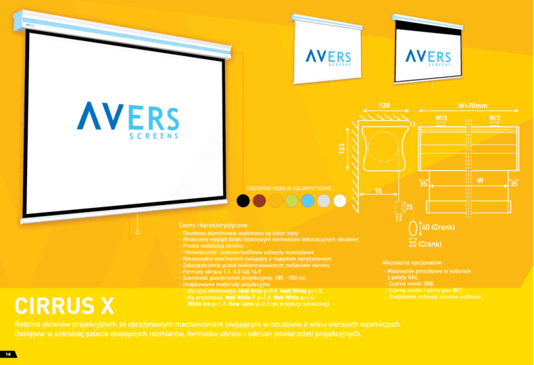 DOSTĘPNE WERSJE KOLORYSTYCZNE : Cechy charakterystyczne: - Obudowa aluminiowa malowana na kolor biały - Atrakcyjny wygląd dzięki kolorowym elementom dekoracyjnym obudowy - Prosta instalacja ekranu - “Niewidzialne” ścienne/sufitowe uchwyty montażowe - Niezawodny mechanizm zwijający z napędem sprężynowym - Zabezpieczenie przed niekontrolowanym zwijaniem ekranu - Formaty obrazu 1:1, 4:3 lub 16:9 - Szerokość powierzchni projekcyjnej: 180 - 300 cm - Dedykowane materiały projekcyjne: - dla kina domowego: Matt Grey g=0,8, Matt White g=1,0, - dla prezentacji: Matt White P g=1,0, Matt White g=1,0, White Ice g=1,2, New Coral g=3,2 (do projekcji wstecznej) Akcesoria opcjonalne: - Malowanie proszkowe w kolorach z palety RAL - Czarne ramki (BB) - Czarne ramki i górny pas (BT) - Dodatkowe uchwyty ścienno sufitowe Rodzina ekranów projekcyjnych ze sprężynowym mechanizmem zwijającym w obudowie o wielu wersjach wzorniczych. Dostępne w szerokiej palecie dostępnych rozmiarów, formatów obrazu i odmian powierzchni projekcyjnych. 16 Rodzina ekranów projekcyjnych z ręcznym mechanizmem zwijającym dostępnych szerokiej palecie rozmiarów, formatów obrazu i odmian powierzchni projekcyjnych. DOSTĘPNE WERSJE KOLORYSTYCZNE : Cechy charakterystyczne: - Obudowa aluminiowa malowana proszkowo na kolor biały - Prosta instalacja ekranu - “Niewidzialne ” ścienne/sufitowe uchwyty montażowe - Niezawodny mechanizm zwijający napędzany korbą - Odłączana, składana korba o długości 160 cm - Formaty obrazu 1:1, 4:3 lub 16:9 - Szerokość powierzchni projekcyjnej: 180 - 300 cm - Dedykowane materiały projekcyjne: - dla kina domowego: Matt Grey g=0,8, Matt White g=1,0 - dla prezentacji: Matt White P g=1,0, Matt White g=1,0 White Ice g=1,2, New Coral g=3,2 (do projekcji wstecznej) Akcesoria opcjonalne: E K R A N Y M A N UA L N E - Malowanie proszkowe w kolorach z palety RAL - Czarne ramki (BB) - Czarne ramki i górny pas (BT) - Dodatkowe uchwyty ścienno sufitowe Jako opcja 17