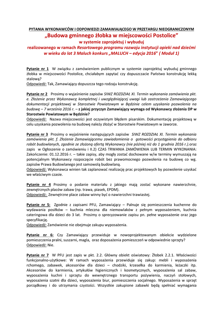 PYTANIA WYKONAWCÓW I ODPOWIEDZI ZAMAWIAJĄCEGO W PRZETARGU NIEOGRANICZONYM „Budowa gminnego żłobka w miejscowości Postolice” w systemie zaprojektuj i wybuduj realizowanego w ramach Resortowego programu rozwoju instytucji opieki nad dziećmi w wieku do lat 3 Maluch konkurs „MALUCH – edycja 2016” ( Moduł 1) Pytanie nr 1 W związku z zamówieniem publicznym w systemie zaprojektuj wybuduj gminnego żłobka w miejscowości Postolice, chciałabym zapytać czy dopuszczacie Państwo konstrukcję lekką stalową? Odpowiedź: Tak, Zamawiający dopuszcza tego rodzaju konstrukcję. Pytanie nr 2 Prosimy o wyjaśnienie zapisów SIWZ ROZDZIAŁ XI. Termin wykonania zamówienia pkt. e. Złożenie przez Wykonawcę kompletnej i uwzględniającej uwagi lub zastrzeżenia Zamawiającego dokumentacji projektowej w Starostwie Powiatowym w Będzinie celem uzyskania pozwolenia na budowę – 7 września 2016 r. – z jakiej przyczyn Zamawiający wymaga od Wykonawcy złożenia DP w Starostwie Powiatowym w Będzinie? Odpowiedź: Nazwa miejscowości jest oczywistym błędem pisarskim. Dokumentację projektową w celu uzyskania pozwolenia na budowę należy złożyć w Starostwie Powiatowym w Jaworze. Pytanie nr 3 Prosimy o wyjaśnienie następujących zapisów SIWZ ROZDZIAŁ XI. Termin wykonania zamówienia pkt. f. Złożenie Zamawiającemu zawiadomienia o gotowości przystąpienia do odbioru robót budowlanych, zgodnie ze złożoną ofertą Wykonawcy (nie później niż do 1 grudnia 2016 r.).oraz zapis w Ogłoszenie o zamówieniu i II.2) CZAS TRWANIA ZAMÓWIENIA LUB TERMIN WYKONANIA: Zakończenie: 01.12.2016 r. – takie zapisy, aby mogły zostać dochowane w/w terminy wymuszają na potencjalnym Wykonawcy rozpoczęcie robót bez prawomocnego pozwolenia na budowę co wg. zapisów Prawa Budowlanego jest samowolą budowlaną. Odpowiedź: Wykonawca winien tak zaplanować realizację prac projektowych by pozwolenie uzyskać we właściwym czasie. Pytanie nr 4 Prosimy o podanie materiału z jakiego mają zostać wykonane nawierzchnie, zewnętrznych placów zabaw (np. trawa, piasek, EPDM). Odpowiedź: Zewnętrzne place zabaw winny być o nawierzchni trawiastej. Pytanie nr 5: Zgodnie z zapisami PFU, Zamawiający – Palnuje się pomieszczenia kuchenne do wydawania posiłków – kuchnia mleczna dla niemowlaków z pełnym wyposażeniem, kuchnia cateringowa dla dzieci do 3 lat. Prosimy o sprecyzowanie zapisu pn. pełne wyposażenie oraz jego specyfikację. Odpowiedź: Zamówienie nie obejmuje zakupu wyposażenia. Pytanie nr 6: Czy Zamawiający przewiduje w nowoprojektowanym obiekcie wydzielone pomieszczenia pralni, suszarni, magla, oraz doposażenia pomieszczeń w odpowiednie sprzęty? Odpowiedź: Nie. Pytanie nr 7 W PFU jest zapis w pkt. 2.2. Główny obiekt oświatowy: Żłobek 2.2.1. Właściwości funkcjonalno-użytkowe: W ramach wyposażenia przewiduje się zakup: mebli i wyposażenia rchomego, zabawek, akcesoriów dla dzieci – chodziki, krzesełka do karmienia, leżaczki itp. Akcesoriów do karmienia, artykułów higienicznych i kosmetycznych, wyposażenia sal zabaw, wyposażenia kuchni i sprzętu do wewnętrznego transportu pożywienia, naczyń stołowych, wyposażenia szatni dla dzieci, wyposażenia biur, pomieszczenia socjalnego. Wyposażenia w sprzęt porządkowy i do utrzymania czystości. Wszystkie zakupione zabawki będą spełniać wymagania bezpieczeństwa i higieny oraz będą posiadać wszystkie niezbędne certyfikaty, a także oznakowanie CE. Meble będą dostosowane do wymagań ergonomicznych osób z nich korzystających. Czy zakup ww. wyposażenia należy ująć w cenie ryczałtowej? Odpowiedź: Nie, zamówienie nie obejmuje zakupu wyposażenia. Pytanie nr 8 Jeśli w ramach ceny ryczałtowej Wykonawca ma ująć również wyposażenie wymienione w PFU pkt 2.2. Główny obiekt oświatowy: Żłobek 2.2.1. Właściwości funkcjonalno-użytkowe: W ramach wyposażenia przewiduje się zakup – prosimy o przedstawienie szczegółowej specyfikacji. Odpowiedź: W związku z odpowiedzią do pyt. nr 7 – pytanie jest bezprzedmiotowe. Pytanie nr 9 Czy opracowanie instrukcji HACCP Zamawiający przewiduje sporządzić we własnym zakresie? Odpowiedź: Tak.