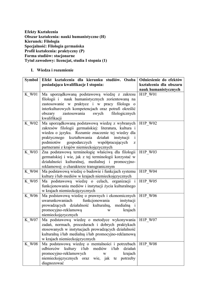 Efekty Kształcenia Obszar kształcenia: nauki humanistyczne (H) Kierunek: Filologia Specjalność: Filologia germańska Profil kształcenia: praktyczny (P) Forma studiów: stacjonarne Tytuł zawodowy: licencjat, studia I stopnia (1) I. Wiedza i rozumienie Symbol Efekt kształcenia dla kierunku studiów. Osoba Odniesienie do efektów posiadająca kwalifikacje I stopnia: kształcenia dla obszaru nauk humanistycznych K_W01 Ma uporządkowaną podstawową wiedzę z zakresu H1P_W01 filologii i nauk humanistycznych zorientowaną na zastosowanie w praktyce i w pracy filologa o interkulturowych kompetencjach oraz potrafi określić obszary zastosowania swych filologicznych kwalifikacji K_W02 Ma uporządkowaną podstawową wiedzę z wybranych H1P_W02 zakresów filologii germańskiej: literatura, kultura i wiedza o języku. Rozumie znaczenie tej wiedzy dla praktycznego kształtowania działań instytucji i podmiotów gospodarczych współpracujących z partnerami z krajów niemieckojęzycznych K_W03 Zna podstawową terminologię właściwą dla filologii H1P_W03 germańskiej i wie, jak z tej terminologii korzystać w działalności kulturalnej, medialnej i promocyjnoreklamowej o charakterze transgranicznym K_W04 Ma podstawową wiedzę o budowie i funkcjach systemu H1P_W04 kultury i/lub mediów w krajach niemieckojęzycznych K_W05 Ma podstawową wiedzę o celach, organizacji i H1P_W05 funkcjonowaniu mediów i instytucji życia kulturalnego w krajach niemieckojęzycznych K_W06 Ma podstawową wiedzę o prawnych i ekonomicznych H1P_W06 uwarunkowaniach funkcjonowania instytucji prowadzących działalność kulturalną, medialną i promocyjno-reklamową w krajach niemieckojęzycznych K_W07 Ma podstawową wiedzę o metodyce wykonywania H1P_W07 zadań, normach, procedurach i dobrych praktykach stosowanych w instytucjach prowadzących działalność kulturalną i/lub medialną i/lub promocyjno-reklamową w krajach niemieckojęzycznych K_W08 Ma podstawową wiedzę o mentalności i potrzebach H1P_W08 odbiorców kultury i/lub mediów i/lub działań promocyjno-reklamowych w krajach niemieckojęzycznych oraz wie, jak te potrzeby diagnozować K_W09 Ma podstawową wiedzę o bezpieczeństwie i higienie H1P_W09 pracy w instytucjach związanych z kulturą i mediami w krajach niemieckojęzycznych K_W10 Zna i rozumie podstawowe pojęcia i zasady z zakresu H1P_W10 ochrony własności przemysłowej i prawa autorskiego w Polsce oraz w Niemczech II. Umiejętności Symbol Efekt kształcenia dla kierunku studiów. Osoba Odniesienie do efektów posiadająca kwalifikacje I stopnia: kształcenia dla obszaru nauk humanistycznych K_ U01 Potrafi wyszukiwać, analizować, oceniać, H1P_U01 selekcjonować i użytkować informacje w języku niemieckim przy użyciu różnych źródeł i sposobów, jak np. słowniki, leksykony, prasa, internet, literatura fachowa, zgodnie z potrzebami wynikającymi z zastosowania języka w budowaniu i rozwijaniu współpracy transgranicznej w sferze kultury i/lub edukacji i/lub ekonomii K_U02 Umie samodzielnie zdobywać wiedzę i rozwijać H1P_U02 umiejętności związane ze stosowaniem języka niemieckiego w kulturze i/lub mediach i/lub ekonomii, a zwłaszcza w działaniach związanych ze współpracą z partnerami z krajów niemieckojęzycznych K_ U03 Samodzielnie planuje i realizuje typowe zadania H1P_U03 wymagające znajomości języka niemieckiego i kompetencji interkulturowej w transgranicznej działalności kulturalnej i/lub promocyjno-reklamowej i/lub gospodarczej K_ U04 Posiada podstawowe umiejętności organizacyjne H1P _U04 pozwalające na planowanie i realizację zadań związanych z kompetencją interkulturową w transgranicznej działalności kulturalnej i/lub medialnej i/lub promocyjno-reklamowej i/lub gospodarczej K_ U05 Posiada podstawowe umiejętności merytoryczne i H1P_U05 językowe pozwalające analizować i rozpoznawać potrzeby odbiorców kultury i/lub mediów i/lub działań promocyjno-reklamowych w kontrastywnej perspektywie polsko-niemieckiej K_ U06 Posiada podstawowe umiejętności merytoryczne i H1P_U06 językowe pozwalające ocenić jakość usług w ramach współpracy transgranicznej w sferze kultury i/lub mediów i/lub reklamy K_ U07 Potrafi w podstawowym zakresie rozumieć i stosować H1P_U07 sformułowane w języku niemieckim i polskim przepisy prawa odnoszące się do transgranicznej działalności kulturalnej i/lub medialnej i/lub promocyjnoreklamowej, i/lub prawa autorskiego oraz własności K_ U08 K_ U09 K_ U10 K_ U11 K_ U12 K_ U13 K_ U14 intelektualnej Potrafi sporządzić w języku niemieckim wniosek o przyznanie środków na realizację projektu profesjonalnego związanego z wybraną sferą działalności kulturalnej i/lub medialnej i/lub promocyjno-reklamowej Potrafi ocenić przydatność różnorodnych metod, procedur, dobrych praktyk do realizacji zadań i rozwiązywania problemów wymagających kompetencji interkulturowej w transgranicznej działalności kulturalnej i/lub medialnej i/lub promocyjnoreklamowej Posiada umiejętność merytorycznego argumentowania w języku niemieckim i rodzimym z wykorzystaniem poglądów innych autorów oraz formułowania wniosków na bazie kompetencji interkulturowych Potrafi porozumiewać się z wykorzystaniem różnych kanałów i technik komunikacyjnych ze specjalistami w zakresie filologii germańskiej w języku niemieckim i języku polskim, a jednocześnie potrafi wykorzystywać kompetencje interkulturowe Posiada umiejętność przygotowania typowych prac pisemnych w języku rodzimym i niemieckim dotyczących zagadnień szczegółowych z zakresu filologii germańskiej i dyscyplin pokrewnych, z wykorzystaniem podstawowych ujęć teoretycznych, a w szczególności perspektywy komparatystycznej Posiada umiejętność przygotowania wystąpień ustnych, w języku rodzimym i w języku niemieckim dotyczących germanistycznych zagadnień szczegółowych oraz dyscyplin pokrewnych, z wykorzystaniem podstawowych ujęć teoretyczn