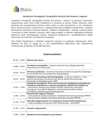 Inicjatywa Awangarda. Europejskie korzyści dla biznesu i regionu „Inicjatywa Awangarda. Europejskie korzyści dla biznesu i regionu” to pierwsze wydarzenie organizowane przez Dom Polski Południowej w Brukseli na terenie Polski. Głównym celem spotkania jest przedstawienie korzyści, które niesie za sobą uczestnictwo w ww. inicjatywie. Nowe formy promocji, uczestnictwo w międzynarodowych projektach pilotażowych, wymiana doświadczeń, informacji i promocji dobrych – śląskich i małopolskich – praktyk z zakresu badań i innowacji, to tylko niektóre z korzyści, jakie mogą osiągnąć w układzie regionalnym instytuty badawcze, parki technologiczne, klastry, organizacje gospodarcze i przedsiębiorstwa dzięki aktywnemu uczestnictwu w Inicjatywie Awangarda. Dom Polski Południowej w Brukseli serdecznie zaprasza na spotkanie informacyjne, które odbędzie się dnia 23 lutego br. w auli multimedialnej Regionalnej Izby Gospodarczej w Katowicach, ul. Opolska 15, 40-084 Katowice. Program spotkania : 09:30 – 10:00 Rejestracja i kawa 10:00 – 10:05 Powitanie uczestników – Tadeusz Donocik, Prezes Regionalnej Izby Gospodarczej w Katowicach 10:05 – 10:15 Otwarcie spotkania – Kazimierz Karolczak, Członek Zarządu Woj. Śląskiego i list od Marka Sowy, Marszałka Woj. Małopolskiego 10:15 – 10:30 10:30 – 11:00 11:00 – 11:20 Polityka Przemysłowa Unii Europejskiej – Francisco Caballero – Sanz, Główny Ekonomista, Dyrekcja Generalna ds. Rynku Wewnętrznego, Przemysłu, Przedsiębiorczości i MŚP Inicjatywa Awangarda. Nowy wzrost poprzez inteligentną specjalizację. Inicjatywy Pilotażowe w ramach Awangardy. Możliwości współpracy – Jan Larosse, Doradca przy Rządze Flandrii, Sekretariat Inicjatywy Awangarda i Carl Albert Hjelmborn, Szef Przedstawicielstwa Skåne w Brukseli, Członek Grupy Koordynującej VI Korzyści dla regionu i biznesu – Anna Jedynak, Zastępca Dyrektora, Wydział Rozwoju Regionalnego UMWŚL - Dawid Puszko, Zastępca Dyrektora, Kancelaria Zarządu UMWM 11:20 – 11:30 Rola Biur Regionalnych w IA. Inicjatywa Domu Polski Południowej - Andrzej Szteliga, Koordynator DPP, Pełnomocnik – Szef BRWŚ 11:30 – 11:50 Pytania i odpowiedzi 12:00 – 13:00 Spotkanie networkingowe przy lunchu