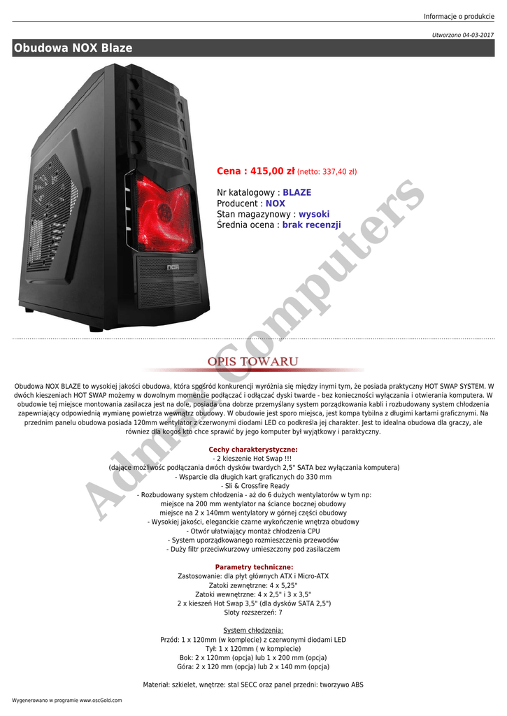 Informacje o produkcie Utworzono 04-03-2017 Obudowa NOX Blaze C om pu te r Nr katalogowy : BLAZE Producent : NOX Stan magazynowy : wysoki Średnia ocena : brak recenzji s Cena : 415,00 zł (netto: 337,40 zł) m ax Obudowa NOX BLAZE to wysokiej jakości obudowa, która spośród konkurencji wyróżnia się między inymi tym, że posiada praktyczny HOT SWAP SYSTEM. W dwóch kieszeniach HOT SWAP możemy w dowolnym momencie podłączać i odłączać dyski twarde - bez konieczności wyłączania i otwierania komputera. W obudowie tej miejsce montowania zasilacza jest na dole, posiada ona dobrze przemyślany system porządkowania kabli i rozbudowany system chłodzenia zapewniający odpowiednią wymianę powietrza wewnątrz obudowy. W obudowie jest sporo miejsca, jest kompa tybilna z długimi kartami graficznymi. Na przednim panelu obudowa posiada 120mm wentylator z czerwonymi diodami LED co podkreśla jej charakter. Jest to idealna obudowa dla graczy, ale równiez dla kogoś kto chce sprawić by jego komputer był wyjątkowy i paraktyczny. Ad Cechy charakterystyczne: - 2 kieszenie Hot Swap !!! (dające możliwośc podłączania dwóch dysków twardych 2,5" SATA bez wyłączania komputera) - Wsparcie dla długich kart graficznych do 330 mm - Sli & Crossfire Ready - Rozbudowany system chłodzenia - aż do 6 dużych wentylatorów w tym np: miejsce na 200 mm wentylator na ściance bocznej obudowy miejsce na 2 x 140mm wentylatory w górnej części obudowy - Wysokiej jakości, eleganckie czarne wykończenie wnętrza obudowy - Otwór ułatwiający montaż chłodzenia CPU - System uporządkowanego rozmieszczenia przewodów - Duży filtr przeciwkurzowy umieszczony pod zasilaczem Parametry techniczne: Zastosowanie: dla płyt głównych ATX i Micro-ATX Zatoki zewnętrzne: 4 x 5,25" Zatoki wewnętrzne: 4 x 2,5" i 3 x 3,5" 2 x kieszeń Hot Swap 3,5" (dla dysków SATA 2,5") Sloty rozszerzeń: 7 System chłodzenia: Przód: 1 x 120mm (w komplecie) z czerwonymi diodami LED Tył: 1 x 120mm ( w komplecie) Bok: 2 x 120mm (opcja) lub 1 x 200 mm (opcja) Góra: 2 x 120 mm (opcja) lub 2 x 140 mm (opcja) Materiał: szkielet, wnętrze: stal SECC oraz panel przedni: tworzywo ABS Wygenerowano w programie www.oscGold.com Porty na przednim panelu: 2 x USB 2.0; 1 x e-SATA; 1 x HDAudio Wymiary: 200(W) x 490 (H) x 500 (D)mm Gwarancja: 24 m-ce kod1018 Ad m ax C om pu te r s Strona producenta / recenzje tego produktu