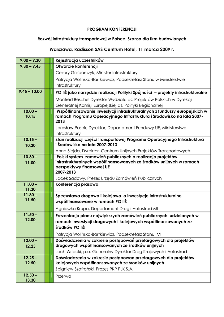 PROGRAM KONFERENCJI Rozwój infrastruktury transportowej w Polsce. Szansa dla firm budowlanych Warszawa, Radisson SAS Centrum Hotel, 11 marca 2009 r. 9.00 – 9.30 9.30 – 9.45 Rejestracja uczestników Otwarcie konferencji Cezary Grabarczyk, Minister Infrastruktury Patrycja Wolińska-Bartkiewicz, Podsekretarz Stanu w Ministerstwie Infrastruktury 9.45 – 10.00 10.00 – 10.15 10.15 – 10.30 10.30 – 11.00 11.00 – 11.30 11.30 – 11.50 PO IiŚ jako narzędzie realizacji Polityki Spójności – projekty infrastrukturalne Manfred Beschel Dyrektor Wydziału ds. Projektów Polskich w Dyrekcji Generalnej Komisji Europejskiej ds. Polityki Regionalnej Współfinansowanie inwestycji infrastrukturalnych z funduszy europejskich w ramach Programu Operacyjnego Infrastruktura i Środowisko na lata 20072013 Jarosław Pasek, Dyrektor, Departament Funduszy UE, Ministerstwo Infrastruktury Stan realizacji części transportowej Programu Operacyjnego Infrastruktura i Środowisko na lata 2007-2013 Anna Siejda, Dyrektor, Centrum Unijnych Projektów Transportowych Polski system zamówień publicznych a realizacja projektów infrastrukturalnych współfinansowanych ze środków unijnych w ramach perspektywy finansowej UE 2007-2013 Jacek Sadowy, Prezes Urzędu Zamówień Publicznych Konferencja prasowa Specustawa drogowa i kolejowa a inwestycje infrastrukturalne współfinansowane w ramach PO IiŚ Agnieszka Krupa, Departament Dróg i Autostrad MI 11.50 – 12.00 12.00 – 12.25 12.25 – 12.50 12.50 – 13.30 Prezentacja planu największych zamówień publicznych udzielanych w ramach inwestycji drogowych i kolejowych współfinansowanych ze środków PO IiŚ Patrycja Wolińska-Bartkiewicz, Podsekretarz Stanu, MI Doświadczenia w zakresie postępowań przetargowych dla projektów drogowych współfinansowanych ze środków unijnych Lech Witecki, p.o. Generalny Dyrektor Dróg Krajowych i Autostrad Doświadczenia w zakresie postępowań przetargowych dla projektów kolejowych współfinansowanych ze środków unijnych Zbigniew Szafrański, Prezes PKP PLK S.A. Przerwa 13.30 – 14.50 PANEL DYSKUSYJNY – MODEROWANY 13.30 – 14.50 Polska krajem otwartym na inwestorów – system zachęt inwestycyjnych w realizowaniu projektów infrastrukturalnych współfinansowanych ze środków UE 14.50 – 15.00 Podsumowanie i zakończenie konferencji Patrycja Wolińska-Bartkiewicz, Podsekretarz Stanu, Ministerstwo Infrastruktury