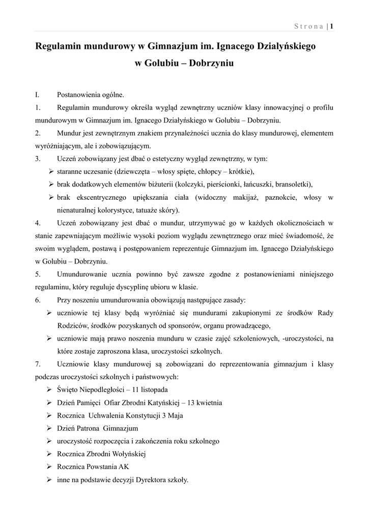 Regulamin mundurowy w Gimnazjum im. Ignacego Dzialyńskiego w