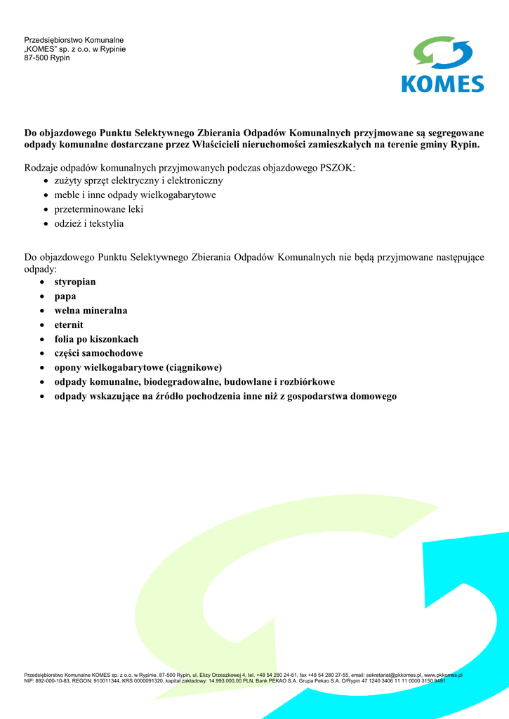 Przedsiębiorstwo Komunalne „KOMES” sp. z o.o. w Rypinie 87-500 Rypin Do objazdowego Punktu Selektywnego Zbierania Odpadów Komunalnych przyjmowane są segregowane odpady komunalne dostarczane przez Właścicieli nieruchomości zamieszkałych na terenie gminy Rypin. Rodzaje odpadów komunalnych przyjmowanych podczas objazdowego PSZOK: zużyty sprzęt elektryczny i elektroniczny meble i inne odpady wielkogabarytowe przeterminowane leki odzież i tekstylia Do objazdowego Punktu Selektywnego Zbierania Odpadów Komunalnych nie będą przyjmowane następujące odpady: styropian papa wełna mineralna eternit folia po kiszonkach części samochodowe opony wielkogabarytowe (ciągnikowe) odpady komunalne, biodegradowalne, budowlane i rozbiórkowe odpady wskazujące na źródło pochodzenia inne niż z gospodarstwa domowego Przedsiębiorstwo Komunalne KOMES sp. z o.o. w Rypinie, 87-500 Rypin, ul. Elizy Orzeszkowej 4, tel. +48 54 280 24-61, fax +48 54 280 27-55, email: [email protected], www.pkkomes.pl NIP: 892-000-10-83, REGON: 910011344, KRS 0000091320, kapitał zakładowy: 14.993.000,00 PLN, Bank PEKAO S.A. Grupa Pekao S.A. O/Rypin 47 1240 3406 11 11 0000 3150 9491 ZBIÓRKA ODPADÓW NA TERENIE GM. RYPIN PAŹDZIERNIK 2016 Data Nazwisko i imię sołtysa Sołectwo Miejscowości Więckowski Radosław Cetki Cetki Na boisku, naprzeciwko sklepu Polanowska Małgorzata Starorypin Rządowy Starorypin Rządowy Przy szkole Świerczyńska Anna Starorypin Prywatny Iwany 29 Paczkowska Barbara Rypałki Prywatne Rypałki Prywatne Przy sklepie Sarnowski Jarosław Stawiska Stawiska 47 Na posesji sołtysa, Kopaczewska Renata Kowalki Kowalki Park naprzeciwko gimnazjum, Chmielewski Piotr Sikory Sikory Środek wsi przystanek szkolny, Kolasińska Joanna Balin Balin Boisko przy placu zabaw, Podgórska Jadwiga Borzymin Borzymin Przy świetlicy wiejskiej, Jankowski Jarosław Czyżewo Czyżewo Jankowska Marzena Rusinowo Szalkowski Adam Głowińsk Pankowski Jan Marianki Marianki 38 Podole Podole 18 Sadłowo: Rumunki,Nowe Sadłowo Linne Linne 28 Godziszewy Godziszewy Przy remizie OSP, Jasin Jasin 5 Na posesji sołtysa, Stępowo Stępowo Kwiatkowo Kwiatkowo Na placu po koszach na śmieci – dzwonach przy dawnym sklepie Puszcza RządowaMiejska Puszcza Rządowa Przy nieruchomosci PKP - dawny dworzec, Paliński Józef Dębiany Dębiany Cieciórski Tomasz Zakrocz Zakrocz Rozpierski Marek Dylewo Dylewo 12 Gadomski Jan Wiśniewski Stefan Duchewicz Sławomir Raszkowska Hanna Rogórz Barbara Dytrych Jan Rogórz Barbara Daniszewski Henryk 2016-09-28 środa 2016-09-29 czwartek Rusinowo 97 Ławy 10 Głowińsk 2016-10-03 poniedziałek 2016-10-04 wtorek 2016-10-06 czwartek Na posesji sołtysa, Plac betonowy przy byłej szkole, godz:12- 16 Iwona Piotrowska Rusinowo Miejsce zbiórki odpadów Świetlica wiejska Naprzeciwko P.Zabłockiej Ławy -Na posesji P. Jana Mey Na boisku, Na posesji sołtysa, Na posesji sołtysa, Przy remizie OSP, Naprzeciwko posesji sołtysa, Na placu po byłej poczcie. Przy świetlicy wiejskiej, Przy remizie OSP, Na posesji sołtysa,