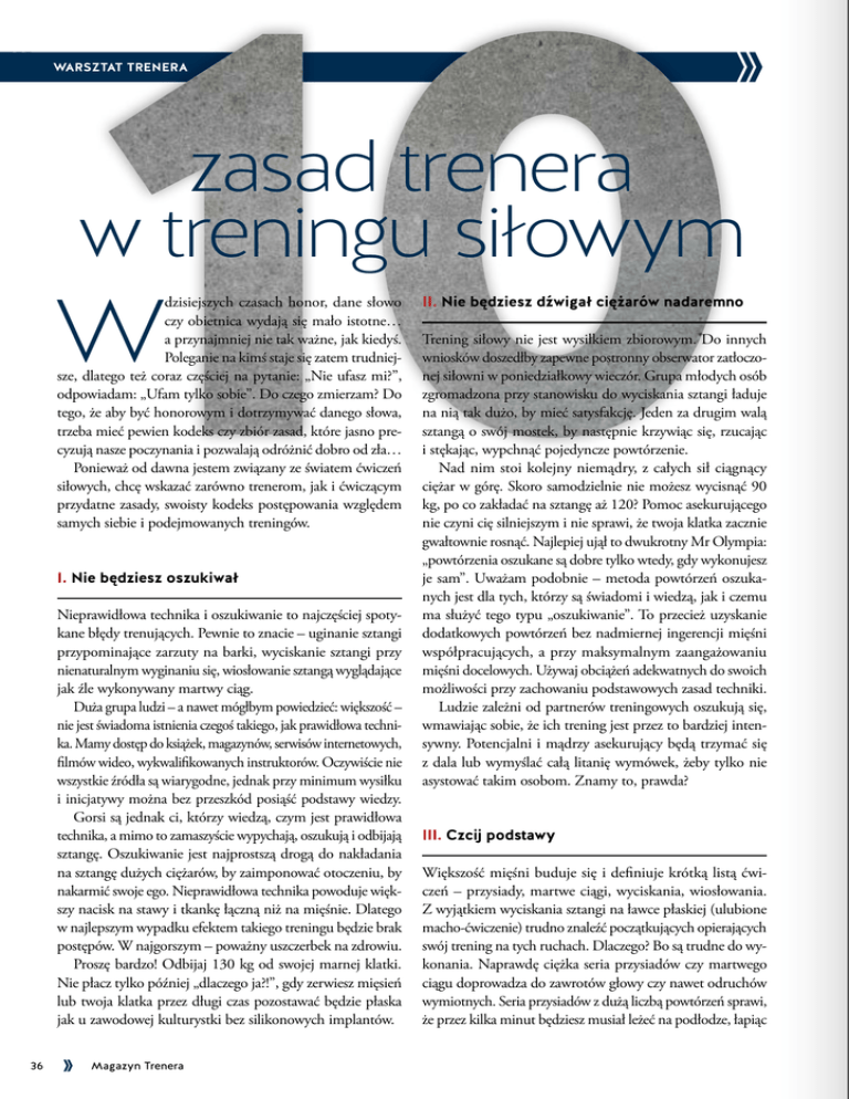 WARSZTAT TRENERA zasad trenera w treningu siłowym W dzisiejszych czasach honor, dane słowo czy obietnica wydają się mało istotne… a przynajmniej nie tak ważne, jak kiedyś. Poleganie na kimś staje się zatem trudniejsze, dlatego też coraz częściej na pytanie: „Nie ufasz mi?”, odpowiadam: „Ufam tylko sobie”. Do czego zmierzam? Do tego, że aby być honorowym i dotrzymywać danego słowa, trzeba mieć pewien kodeks czy zbiór zasad, które jasno precyzują nasze poczynania i pozwalają odróżnić dobro od zła… Ponieważ od dawna jestem związany ze światem ćwiczeń siłowych, chcę wskazać zarówno trenerom, jak i ćwiczącym przydatne zasady, swoisty kodeks postępowania względem samych siebie i podejmowanych treningów. I. Nie będziesz oszukiwał Nieprawidłowa technika i oszukiwanie to najczęściej spotykane błędy trenujących. Pewnie to znacie – uginanie sztangi przypominające zarzuty na barki, wyciskanie sztangi przy nienaturalnym wyginaniu się, wiosłowanie sztangą wyglądające jak źle wykonywany martwy ciąg. Duża grupa ludzi – a nawet mógłbym powiedzieć: większość – nie jest świadoma istnienia czegoś takiego, jak prawidłowa technika. Mamy dostęp do książek, magazynów, serwisów internetowych, filmów wideo, wykwalifikowanych instruktorów. Oczywiście nie wszystkie źródła są wiarygodne, jednak przy minimum wysiłku i inicjatywy można bez przeszkód posiąść podstawy wiedzy. Gorsi są jednak ci, którzy wiedzą, czym jest prawidłowa technika, a mimo to zamaszyście wypychają, oszukują i odbijają sztangę. Oszukiwanie jest najprostszą drogą do nakładania na sztangę dużych ciężarów, by zaimponować otoczeniu, by nakarmić swoje ego. Nieprawidłowa technika powoduje większy nacisk na stawy i tkankę łączną niż na mięśnie. Dlatego w najlepszym wypadku efektem takiego treningu będzie brak postępów. W najgorszym – poważny uszczerbek na zdrowiu. Proszę bardzo! Odbijaj 130 kg od swojej marnej klatki. Nie płacz tylko później „dlaczego ja?!”, gdy zerwiesz mięsień lub twoja klatka przez długi czas pozostawać będzie płaska jak u zawodowej kulturystki bez silikonowych implantów. 36 Magazyn Trenera II. Nie będziesz dźwigał ciężarów nadaremno Trening siłowy nie jest wysiłkiem zbiorowym. Do innych wniosków doszedłby zapewne postronny obserwator zatłoczonej siłowni w poniedziałkowy wieczór. Grupa młodych osób zgromadzona przy stanowisku do wyciskania sztangi ładuje na nią tak dużo, by mieć satysfakcję. Jeden za drugim walą sztangą o swój mostek, by następnie krzywiąc się, rzucając i stękając, wypchnąć pojedyncze powtórzenie. Nad nim stoi kolejny niemądry, z całych sił ciągnący ciężar w górę. Skoro samodzielnie nie możesz wycisnąć 90 kg, po co zakładać na sztangę aż 120? Pomoc asekurującego nie czyni cię silniejszym i nie sprawi, że twoja klatka zacznie gwałtownie rosnąć. Najlepiej ujął to dwukrotny Mr Olympia: „powtórzenia oszukane są dobre tylko wtedy, gdy wykonujesz je sam”. Uważam podobnie – metoda powtórzeń oszukanych jest dla tych, którzy są świadomi i wiedzą, jak i czemu ma służyć tego typu „oszukiwanie”. To przecież uzyskanie dodatkowych powtórzeń bez nadmiernej ingerencji mięśni współpracujących, a przy maksymalnym zaangażowaniu mięśni docelowych. Używaj obciążeń adekwatnych do swoich możliwości przy zachowaniu podstawowych zasad techniki. Ludzie zależni od partnerów treningowych oszukują się, wmawiając sobie, że ich trening jest przez to bardziej intensywny. Potencjalni i mądrzy asekurujący będą trzymać się z dala lub wymyślać całą litanię wymówek, żeby tylko nie asystować takim osobom. Znamy to, prawda? III. Czcij podstawy Większość mięśni buduje się i definiuje krótką listą ćwiczeń – przysiady, martwe ciągi, wyciskania, wiosłowania. Z wyjątkiem wyciskania sztangi na ławce płaskiej (ulubione macho-ćwiczenie) trudno znaleźć początkujących opierających swój trening na tych ruchach. Dlaczego? Bo są trudne do wykonania. Naprawdę ciężka seria przysiadów czy martwego ciągu doprowadza do zawrotów głowy czy nawet odruchów wymiotnych. Seria przysiadów z dużą liczbą powtórzeń sprawi, że przez kilka minut będziesz musiał leżeć na podłodze, łapiąc WARSZTAT TRENERA oddech, zanim rozważysz możliwość wstania, nie mówiąc o przystąpieniu do następnej serii. Komu potrzebna taka męczarnia, skoro łatwiej usiąść w ładnej i wygodnej maszynie do wypychania i cieszyć się łatwymi powtórzeniami. Ach, wypychania na maszynie – żadnej upierdliwej sztangi wrzynającej się w kaptury i zostawiającej czerwone odciski na plecach. To samo z butterfly’em. Po co męczyć się z nieporęcznymi hantlami, kiedy można wygodnie usiąść na maszynie i oglądać w lustrze pracującą klatkę. Dość ironii. Jeżeli chcesz stać się większy i silniejszy – bądź smuklejsza i bardziej wyrzeźbiona – rób to, co robiły przed tobą całe pokolenia kulturystów i fitnessek. Skup się na wolnych ciężarach. Wyspecjalizowane maszyny przydadzą się tylko w początkowej fazie treningu osobom, które wcześniej nie miały styczności z tego typu ćwiczeniami. nie przekraczał godziny naraz. Nawet dzisiaj 130-kilogramowi zawodowcy nie walczą z ciężarami dłużej niż 90 minut. V. Nie będziesz tkwił w tym samym Znałem kiedyś gościa, który zawsze przychodził na siłownię w poniedziałki, środy i piątki. Było to w czasie, gdy jeszcze byłem tam instruktorem. Szybko zauważyłem, że zawsze robił to samo – te same ćwiczenia, ciężary, serie i powtórzenia. Zadziwiałem moich klientów, „przewidując”, co ten gość zrobi. „Teraz pójdzie na wyciskanie sztangi w skosie. Rozgrzeje się 10 powtórzeniami 60 kg, potem 95 kg 8 razy, a następnie pierwsza seria zaraz po tym, jak będzie kogoś błagał, żeby go asekurować”. Ro