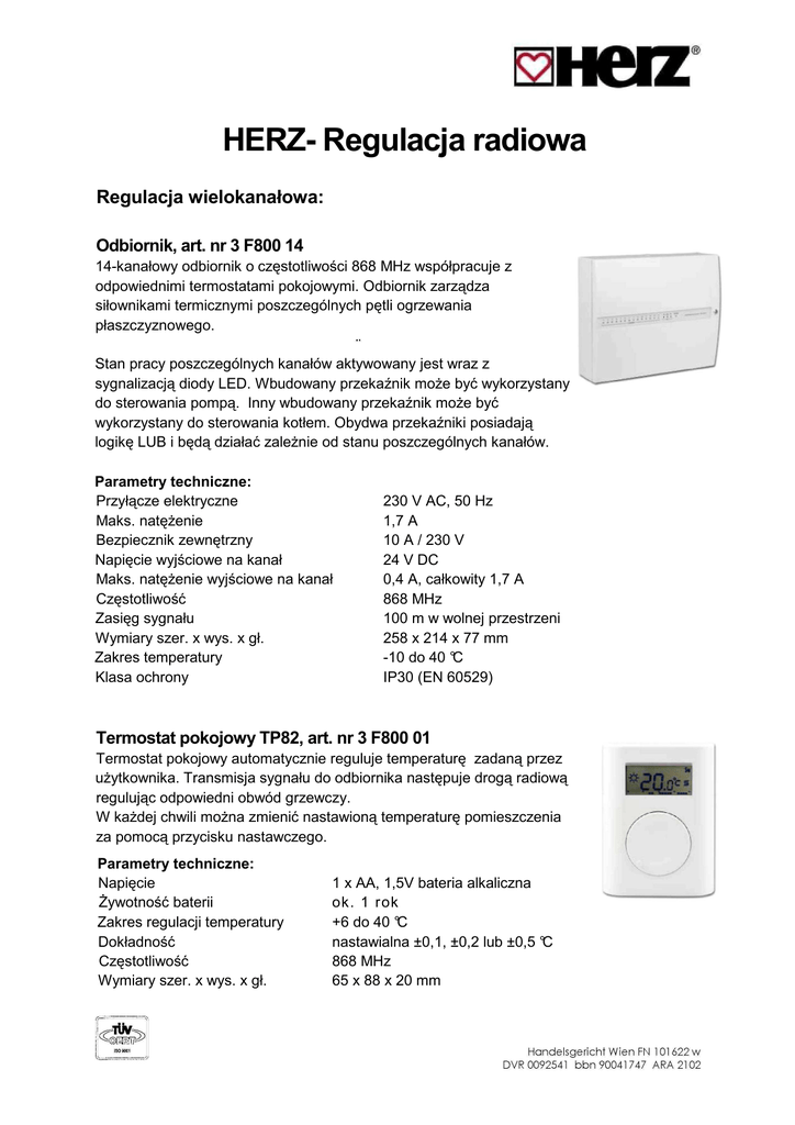 HERZ- Regulacja radiowa Regulacja wielokanałowa: Odbiornik, art. nr 3 F800 14 14-kanałowy odbiornik o częstotliwości 868 MHz współpracuje z odpowiednimi termostatami pokojowymi. Odbiornik zarządza siłownikami termicznymi poszczególnych pętli ogrzewania płaszczyznowego. Stan pracy poszczególnych kanałów aktywowany jest wraz z sygnalizacją diody LED. Wbudowany przekaźnik może być wykorzystany do sterowania pompą. Inny wbudowany przekaźnik może być wykorzystany do sterowania kotłem. Obydwa przekaźniki posiadają logikę LUB i będą działać zależnie od stanu poszczególnych kanałów. Parametry techniczne: Przyłącze elektryczne Maks. natężenie Bezpiecznik zewnętrzny Napięcie wyjściowe na kanał Maks. natężenie wyjściowe na kanał Częstotliwość Zasięg sygnału Wymiary szer. x wys. x gł. Zakres temperatury Klasa ochrony 230 V AC, 50 Hz 1,7 A 10 A / 230 V 24 V DC 0,4 A, całkowity 1,7 A 868 MHz 100 m w wolnej przestrzeni 258 x 214 x 77 mm -10 do 40 °C IP30 (EN 60529) Termostat pokojowy TP82, art. nr 3 F800 01 Termostat pokojowy automatycznie reguluje temperaturę zadaną przez użytkownika. Transmisja sygnału do odbiornika następuje drogą radiową regulując odpowiedni obwód grzewczy. W każdej chwili można zmienić nastawioną temperaturę pomieszczenia za pomocą przycisku nastawczego. Parametry techniczne: Napięcie Żywotność baterii Zakres regulacji temperatury Dokładność Częstotliwość Wymiary szer. x wys. x gł. 1 x AA, 1,5V bateria alkaliczna ok. 1 rok +6 do 40 °C nastawialna ±0,1, ±0,2 lub ±0,5 °C 868 MHz 65 x 88 x 20 mm Termostat pokojowy TP83, art. nr 3 F800 02 Termostat pokojowy automatycznie reguluje temperaturę zadaną przez użytkownika. Termostat pokojowy może poprzez program tygodniowy indywidualnie dostosować regulację odpowiedniego obiegu grzewczego drogą radiową poprzez odbiornik. W każdej chwili można zmienić zaprogramowaną temperaturę pomieszczenia za pomocą przycisku nastawczego. Parametry techniczne: Napięcie Żywotność baterii Zakres regulacji temperatury Dokładność Częstotliwość Wymiary szer. x wys. x gł. 1 x AA, 1,5V bateria alkaliczna ok. 1 rok +6 do 40 °C nastawialna ±0,1, ±0,2 lub ±0,5 °C 868 MHz 66 x 90 x 22 mm Termostat pokojowy TP83IR, art. nr 3 F800 03 Termostat pokojowy automatycznie reguluje temperaturę zadaną przez użytkownika. Termostat pokojowy może poprzez program tygodniowy indywidualnie dostosować regulację odpowiedniego obiegu grzewczego drogą radiową poprzez odbiornik. W każdej chwili można zmienić zaprogramowaną temperaturę pomieszczenia za pomocą przycisku nastawczego. Dzięki wbudowanemu czujnikowi podczerwieni można regulować temperaturę powierzchni ogrzewania podłogowego. W przypadku przegrzania podłogi następuje wyłączenie ogrzewania podłogowego. Parametry techniczne: Napięcie Żywotność baterii Zakres regulacji temperatury Dokładność Częstotliwość Wymiary szer. x wys. x gł. 1 x AA, 1,5V bateria alkaliczna ok. 1 rok -10 do 70 °C nastawialna ±0,1, ±0,2 lub ±0,5 °C 868 MHz 66 x 90 x 22 mm Regulacja jednokanałowa: System radiowy analogowy, art. nr 3 F799 04 Regulator temperatury pomieszczenia z pokrętłem analogowym. Odbiornik z kodowanym sygnałem. Wyświetlacz LED stanu pracy przy odbiorniku: ogrzewanie / tryb pracy / odbiór sygnału. Termostat pokojowy zasilany bateryjnie CR2430, żywotność baterii ok. 2 lata zasięg sygnału 40 m klasa ochrony IP30 Odbiornik zasilany napięciem 230 V ~, 50 Hz maksymalne obciążenie styku 12 A klasa ochrony IP44 częstotliwość 433,92 MHz System radiowy cyfrowy, art. nr 3 F799 06 Regulator temperatury pomieszczenia z wyświetlaczem cyfrowym temperatury pomieszczenia i stanu pracy. Odbiornik z kodowanym sygnałem, wyłącznikiem czasowym dla programu tygodniowego. Wyświetlacz LED stanu pracy przy odbiorniku: ogrzewanie / tryb pracy / odbiór sygnału. Termostat pokojowy zasilany bateryjnie 3 x 1,5 V AA, żywotność baterii ok. 3 lata zasięg sygnału 50 m klasa ochrony IP30 Odbiornik zasilany napięciem 230 V ~, 50 Hz maksymalne obciążenie styku 12 A klasa ochrony IP44 częstotliwość 433,92 MHz Wszystkie dane zawarte w tym dokumencie są zgodne z informacjami z chwili oddania dokumentu do druku i mają tylko charakter informacyjny. Wszelkie prawa do zmian w sensie rozwoju technicznego zastrzeżone. Rysunki mają charakter symboliczny i mogą optycznie różnić się od produktów w rzeczywistości. Ewentualne różnice kolorystyczne wynikają z techniki druku. Możliwe są zróżnicowania produktu wynikające ze specyfiki przepisów danego kraju. Prawo do zmian i specyfikacji technicznych zastrzeżone. W przypadku pytań prosimy o kontakt z najbliższym przedstawicielstwem firmy HERZ.