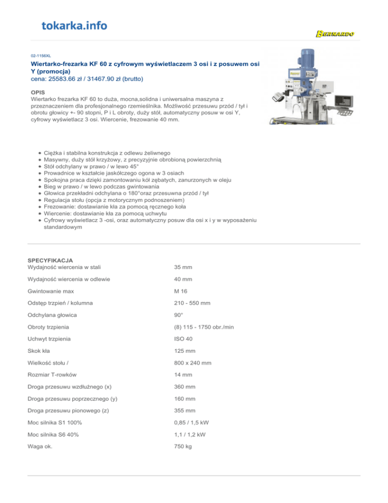 Wiertarko-frezarka KF 60 z cyfrowym wyświetlaczem 3 osi i z