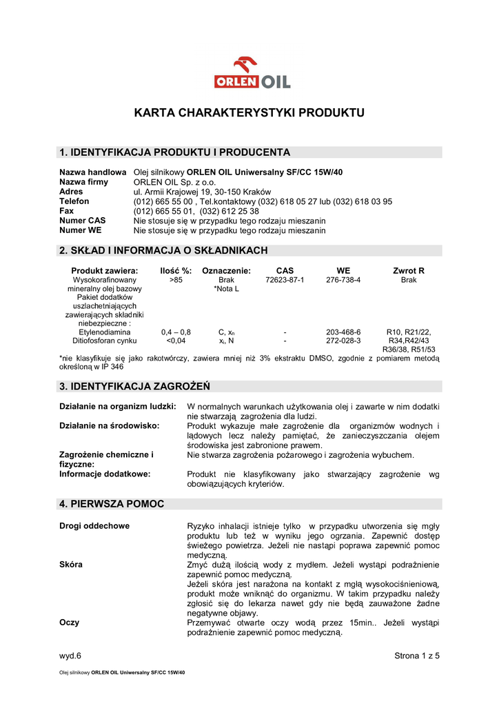KARTA CHARAKTERYSTYKI PRODUKTU 1. IDENTYFIKACJA PRODUKTU I PRODUCENTA Nazwa handlowa Nazwa firmy Adres Telefon Fax Numer CAS Numer WE Olej silnikowy ORLEN OIL Uniwersalny SF/CC 15W/40 ORLEN OIL Sp. z o.o. ul. Armii Krajowej 19, 30-150 Kraków (012) 665 55 00 , Tel.kontaktowy (032) 618 05 27 lub (032) 618 03 95 (012) 665 55 01, (032) 612 25 38 N i e s t o s u j e s i ę w p r z y p a d k u t e g o r o d z a j u m i e s z a n i n N i e s t o s u j e s i ę w p r z y p a d k u t e g o r o d z a j u m i e s z a n i n 2. SKŁAD I INFORMACJA O SKŁADNIKACH Produkt zawiera: Ilość %: Oznaczenie: CAS WE Zwrot R Wysokorafinowany mineralny olej bazowy Pakiet dodatków >85 Brak *Nota L 72623-87-1 276-738-4 Brak 0,4 – 0,8 <0,04 C, xn xi, N - 203-468-6 272-028-3 R10, R21/22, R34,R42/43 R36/38, R51/53 u z a s z w i l e a r c a j h e ą c t n y i c a j h ą s c k y ł a c h d n i k i niebezpieczne : Etylenodiamina Ditiofosforan cynku * n o i k e r k e ś l l a o s n y ą f i w k u j I P e s 3 4 i ę j a k o r a k o t w ó r c z y , z a w i e r a m n i e j n i Ŝ 3 % e k s t r a k t u D M S O , z g o d n i e z p o m i a r e m m e t o d ą 6 3. IDENTYFIKACJA ZAGROśEŃ Działanie na organizm ludzki: n o r m a l n y c nie stwarzaj Działanie na środowisko: h w a r u n k a c h u Ŝ y t k o w a n i a o l e j i z a w a r t e w n i m d o d a t k i W r o d u k t w y z a g r o Ŝ e n i a d l a l u d z i . ą k a z u j e m a ł e z a g r o Ŝ e n i e d l a o r g a n i z m ó w w o d n y c h i P l d o w y c h l e c z n a l e Ŝ y p a m i ę t a ć , Ŝ e z a n i e c z y s z c z a n i a o l e j e m ą ś ZagroŜenie chemiczne i fizyczne: Informacje dodatkowe: r o N d i o e r w s o i t d w s k a u k a r j z e a t s z n i t a z g a r e b o k r Ŝ l e a s y o n n i f i i o n a e p k o p o Ŝ w r a a a r n w o e w y m e j . g a o k i z o a s g t r w o a Ŝ r e z n a i j a w c P y y b u z c a h g r e o m Ŝ . e n i e w g ą o b o w i z u j c ą y c h k r y t e r i ó w . ą 4. PIERWSZA POMOC Drogi oddechowe y z y k o i n h a l a c j i i s t n i e j e t y l k o w p r z y p a d k u u t w o r z e n i a s i ę m g ł y R l produktu ś w i e Ŝ e g o u b p t o w i e Ŝ e t w r z a w . J y e Ŝ n e i l k u i j n i e e g n o a o s t g p r i z a p o n i p r a . a Z w a a p z e a w p n e i w ć d n i ć p o s o m t ę p o c ą m e d y c z n . ą Skóra Z m y ć d u Ŝ i l ś o c i w ą z a p e w n i ć o d y z m y d ł e m . J e Ŝ e l i w y s t p ą p o m o c i p o d r a Ŝ n i e n i e ą m e d y c z n . ą J e Ŝ e l i s k ó r a j e s t n a r a Ŝ o n a n a k o n t a k t z m g ł w y s o k o c i ś n i e n i n a o w , ą p r o d u k t m o Ŝ e w n i k n ć d o o r g a n i z m u . t g ł o s i ć s i ę d o l e k a ą k i m p r z y p a d k u l e Ŝ y W ą z a r z a n a w e t g d y n i e b ę d z a u w a Ŝ o n e Ŝ a d n e ą negatywne objawy. Oczy r z e m y w a ć o t w a r t e o c z y w o d p P p r z e z d r a Ŝ n i e n i e z a p e w n i ć p o m o c m e Olej silnikowy ORLEN OIL Uniwersalny SF/CC 15W/40 5 m i n . . J e Ŝ e l i w y s t p i ą d y c z n ą wyd.6 1 ą o . Strona 1 z 5 Połknięcie N i n e p a s r t o w p o i p k o o p w r a a ć w w a y z a m i p e o t w ó n w i . ć N p i o e m p o o c d m a w e d a y ć c n z i n c d o u s t n i e . J e Ŝ e l i n i e . ą ą 5. POSTĘPOWANIE W PRZYPADKU POśARU Odpowiednie środki gaśnicze i a n a , s u c h e p m Nieodpowiednie środki gaśnicze Sprzęt ochronny Informacje dodatkowe r o s z k i g ś a n i c z e , C O 2, P a ł y c h p o Ŝ a r ó w piasek lub ziemia tylko w . przypadku Woda o zwartym strumieniu Kompletne ubranie ochronne z indywidualnym aparatem oddechowych. o d c z a s r o z k ł a d u t e r m i c z n e g o n a s t p P i ć m o Ŝ e w y d z i e l a n i e t l e n k u ą siarki, azotu , siarkowodór. 6. POSTĘPOWANIE W PRZYPADKU NIEZAMIERZONEGO UWOLNIENIA DO ŚRODOWISKA Indywidualne środki ostroŜności Zabezpieczenie środowiskaduŜe rozlewiska U n i k a ć k o n t a k t u z e s k ó r i o c z a m i , u Ŝ y w a ć m a s k i o c h r o n n e j , u b r a ń ą powlekanych, butów na gumowej podeszwie. D u t Ŝ w e o r r z o z c l b e w a i r i s e k r a z y z a b p i e a z s p k i u e c z , y z ć i p e m r i z l e u d r b m o a z t p e r r i z a e ł s t u r z p e o n c i h ł a n a i n i e m a c ą Z e p b o r j m ć d m e j n s e i g ę o . ą a e i s j o i c k u s t u ę p d . n o o y p z o m ó s s ź t n a ł p i e j ś o r z s c ę z i t e e p m g o i o t r u o a m d k t i z o y w ś e s k a c i u ć l j a ć w u o b k s m z k a ł n ł a a y k d o o w w w y a a c i n n e i k y m a s w z c z e l n y m stosownym . P Zabezpieczenie środowiskamałe wycieki Z e b r a ć m i e s z a j c u p r z e d n i o z z i e m i , ą a d o s z n o r a k p c y o j w n y a m n y Z m p i a s k i e m l u b m a t e r i a ł e m ą . s e z b c r z a e ć l n d y o m s p t o j ę p e n m y n m i s k u d p r o z p ę ó t ź e m n i i e j s z e g u m o s i k ł ś e a c d i o ć w w a n i a w stosownym miejscu. 7. POSTĘPOWANIE Z PRODUKTEM I JEGO MAGAZYNOWANIE POSTĘPOWANIE Zabezpieczenie uŜytkownika: t o s o w a ć o d p o w i e d n i w S e n t y l a c j ę w p r z y p a d k u z a i s t n i e n i a ą w a r u n k ó w d o w y t w o r z e n i a s i ę p a r y b d ź m g ł y . t r o d k i o g r a n i c z a j c e r y z y k o k o n s o w a ć w s z e l k i e S ą ś o t a k t u z w ł a s z c z a z o l e j e m ą p r z e p r a c o w a n y m . r z e t r z y m y w a ć z d a l a o d m a t e r i a ł ó w P ł Zabezpieczenie przed eksplozją i poŜarem: a t w o u s p t a l e o n y p c a h k , o o w d a Ŝ n i y w a n i ś o z b i c o i r i n n i a k p i o m j o ó w . g z P a w i e r a ć p a l n e l u b w y b u c h o w e ą N pary. w y k a s c z o n e o l e j e m u b r a n i a i p a p i e r l u b s z m a t y ą o r z y s t y w a n e d o w y c i e r a n i a r o z l a n e g o o l e j u s t w a r z a j ą z a g m r a o t Ŝ e e r i n a ł i ó e p w o . Ŝ a o z r o b w y e