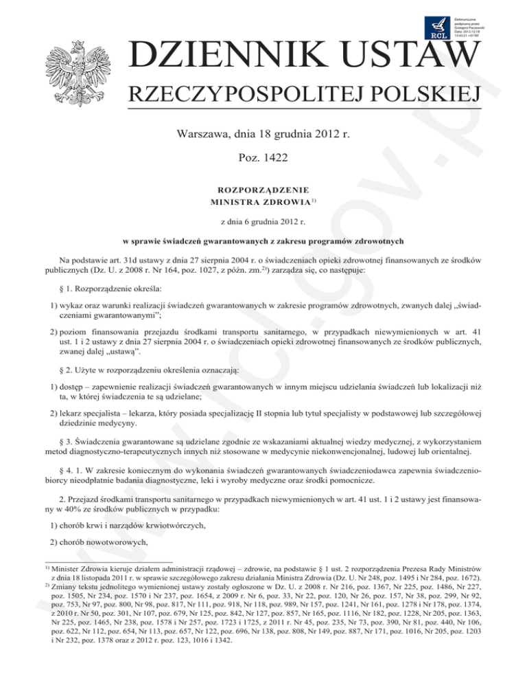 Elektronicznie podpisany przez Grzegorz Paczowski Data: 2012.12.18 13:43:21 +01'00' DZIENNIK USTAW v.p l RZECZYPOSPOLITEJ POLSKIEJ Warszawa, dnia 18 grudnia 2012 r. Poz. 1422 ROZPORZĄDZENIE MINISTRA ZDROWIA 1) .go z dnia 6 grudnia 2012 r. w sprawie świadczeń gwarantowanych z zakresu programów zdrowotnych Na podstawie art. 31d ustawy z dnia 27 sierpnia 2004 r. o świadczeniach opieki zdrowotnej finansowanych ze środków publicznych (Dz. U. z 2008 r. Nr 164, poz. 1027, z późn. zm.2)) zarządza się, co następuje: § 1. Rozporządzenie określa: 1) wykaz oraz warunki realizacji świadczeń gwarantowanych w zakresie programów zdrowotnych, zwanych dalej „świadczeniami gwarantowanymi”; w. rcl 2) poziom finansowania przejazdu środkami transportu sanitarnego, w przypadkach niewymienionych w art. 41 ust. 1 i 2 ustawy z dnia 27 sierpnia 2004 r. o świadczeniach opieki zdrowotnej finansowanych ze środków publicznych, zwanej dalej „ustawą”. § 2. Użyte w rozporządzeniu określenia oznaczają: 1) dostęp – zapewnienie realizacji świadczeń gwarantowanych w innym miejscu udzielania świadczeń lub lokalizacji niż ta, w której świadczenia te są udzielane; 2) lekarz specjalista – lekarza, który posiada specjalizację II stopnia lub tytuł specjalisty w podstawowej lub szczegółowej dziedzinie medycyny. § 3. Świadczenia gwarantowane są udzielane zgodnie ze wskazaniami aktualnej wiedzy medycznej, z wykorzystaniem metod diagnostyczno-terapeutycznych innych niż stosowane w medycynie niekonwencjonalnej, ludowej lub orientalnej. § 4. 1. W zakresie koniecznym do wykonania świadczeń gwarantowanych świadczeniodawca zapewnia świadczeniobiorcy nieodpłatnie badania diagnostyczne, leki i wyroby medyczne oraz środki pomocnicze. ww 2. Przejazd środkami transportu sanitarnego w przypadkach niewymienionych w art. 41 ust. 1 i 2 ustawy jest finansowany w 40% ze środków publicznych w przypadku: 1) chorób krwi i narządów krwiotwórczych, 2) chorób nowotworowych, Minister Zdrowia kieruje działem administracji rządowej – zdrowie, na podstawie § 1 ust. 2 rozporządzenia Prezesa Rady Ministrów z dnia 18 listopada 2011 r. w sprawie szczegółowego zakresu działania Ministra Zdrowia (Dz. U. Nr 248, poz. 1495 i Nr 284, poz. 1672). 2) Zmiany tekstu jednolitego wymienionej ustawy zostały ogłoszone w Dz. U. z 2008 r. Nr 216, poz. 1367, Nr 225, poz. 1486, Nr 227, poz. 1505, Nr 234, poz. 1570 i Nr 237, poz. 1654, z 2009 r. Nr 6, poz. 33, Nr 22, poz. 120, Nr 26, poz. 157, Nr 38, poz. 299, Nr 92, poz. 753, Nr 97, poz. 800, Nr 98, poz. 817, Nr 111, poz. 918, Nr 118, poz. 989, Nr 157, poz. 1241, Nr 161, poz. 1278 i Nr 178, poz. 1374, z 2010 r. Nr 50, poz. 301, Nr 107, poz. 679, Nr 125, poz. 842, Nr 127, poz. 857, Nr 165, poz. 1116, Nr 182, poz. 1228, Nr 205, poz. 1363, Nr 225, poz. 1465, Nr 238, poz. 1578 i Nr 257, poz. 1723 i 1725, z 2011 r. Nr 45, poz. 235, Nr 73, poz. 390, Nr 81, poz. 440, Nr 106, poz. 622, Nr 112, poz. 654, Nr 113, poz. 657, Nr 122, poz. 696, Nr 138, poz. 808, Nr 149, poz. 887, Nr 171, poz. 1016, Nr 205, poz. 1203 i Nr 232, poz. 1378 oraz z 2012 r. poz. 123, 1016 i 1342. 1) Dziennik Ustaw –2– Poz. 1422 3) chorób oczu, 5) chorób psychicznych i zaburzeń zachowania, 6) chorób skóry i tkanki podskórnej, 7) chorób układu krążenia, 8) chorób układu moczowo-płciowego, 9) chorób układu nerwowego, 10) chorób układu oddechowego, 11) chorób układu ruchu, .go 12) chorób układu trawiennego, v.p l 4) chorób przemiany materii, 13) chorób układu wydzielania wewnętrznego, 14) chorób zakaźnych i pasożytniczych, 15) urazów i zatruć, 16) wad rozwojowych wrodzonych, zniekształceń i aberracji chromosomowych w. rcl – gdy ze zlecenia lekarza ubezpieczenia zdrowotnego lub felczera ubezpieczenia zdrowotnego wynika, że świadczeniobiorca jest zdolny do samodzielnego poruszania się bez stałej pomocy innej osoby, ale wymaga przy korzystaniu ze środków transportu publicznego pomocy innej osoby lub środka transportu publicznego dostosowanego do potrzeb osób niepełnosprawnych. § 5. Wykaz świadczeń gwarantowanych z zakresu programów zdrowotnych oraz warunki ich realizacji określa załącznik do rozporządzenia. § 6. 1. Świadczeniodawca niespełniający warunków realizacji świadczeń gwarantowanych określonych w rozporządzeniu, z którym przed dniem wejścia w życie rozporządzenia zawarto umowę o udzielanie świadczeń opieki zdrowotnej na okres dłuższy niż do dnia 31 grudnia 2013 r., może realizować świadczenia gwarantowane na warunkach określonych w tej umowie, nie dłużej jednak niż do dnia 31 grudnia 2013 r. 2. Świadczeniodawca niespełniający warunków realizacji świadczeń gwarantowanych określonych w rozporządzeniu, z którym przed dniem wejścia w życie rozporządzenia zawarto umowę o udzielanie świadczeń opieki zdrowotnej na okres nie dłuższy niż do dnia 31 grudnia 2013 r., może realizować świadczenia gwarantowane na warunkach określonych w tej umowie. ww § 7. Świadczeniobiorcy, którzy zostali, przed dniem 1 lipca 2012 r., zakwalifikowani do leczenia w ramach terapeutycznych programów zdrowotnych, kontynuują po tym dniu to leczenie w ramach odpowiednich programów lekowych przysługujących na podstawie art. 15 ust. 2 pkt 15 ustawy z dnia 27 sierpnia 2004 r. o świadczeniach opieki zdrowotnej finansowanych ze środków publicznych, przy czym świadczenia chemioterapii niestandardowej realizowane są na zasadach określonych w art. 70 ustawy z dnia 12 maja 2011 r. o refundacji leków, środków spożywczych specjalnego przeznaczenia żywieniowego oraz wyrobów medycznych (Dz. U. Nr 122, poz. 696 oraz z 2012 r. poz. 95 i 742). § 8. Rozporządzenie wchodzi w życie z dniem następującym po dniu ogłoszenia, z mocą od dnia 1 lipca 2012 r., z wyjątkiem lp. 6 załącznika do rozporządzenia, który wchodzi w życie z dniem 1 stycznia 2013 r.3) 3) Minister Zdrowia: B.A. Arłukowicz iniejsze rozpor