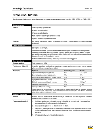 Instrukcja Techniczna Strona 1/4 StoMurisol SP fein Szerokoporowa, hydrofobowa tynkarska zaprawa renowacyjna zgodna z wytycznymi Instrukcji WTA. R CS II wg PN-EN 998-1 Charakterystyka Funkcja Szerokoporowy, hydrofobowy Wysoka zdolność dyfuzji Wysoka zawartość porów Mała zdolność kapilarnego wchłaniania wody Wysoka zdolność magazynowania soli Obróbka Ręczna lub maszynowa (zaleca się agregaty tynkarskie z dodatkowym urządzeniem napowietrzającym). Zakres stosowania Do wnętrz i na zewnątrz. StoMurisol SP fein jest hydrofobowym tynkiem renowacyjnym stosowanym na zawilgocone i zawierające szkodliwe związki soli ściany. Zalecany głównie w ochronie architektury zabytkowej, a także przy wewnętrznych izolacjach ścian piwnicznych jako tynk podkładowy zapobiegający powstawaniu kondensacji pary wodnej. StoMurisol SP fein nie może być mieszany i stosowany razem z gipsem. Dane techniczne Grupa produktów Tynk renowacyjny WTA Podstawowe składniki Krzemian wapniowy, wodorotlenek wapniowy, proszek polimerowy, węglan wapnia, węglan glinu, wypełniacze nieorganiczne, dodatki Parametry Kryterium Gęstość stwardniałej zaprawy (28 dni) Norma / Wytyczne WTA Wartość 1,2-1,4 g/cm3 Zawartość porów w stwardniałej zaprawie WTA 47 % Wytrzymałość na rozciąganie przy zginaniu (28 dni) WTA 1-2 MPa Wytrzymałość na ściskanie (28 dni) WTA 3-4 MPa Zdolność kapilarnego podciągania wody w24 WTA <1,0 kg/m2 Głębokość wsiąkania wody h WTA 3,0 mm Wsp. oporu dyfuzji pary wodnej µ WTA 10 Podane parametry są wartościami średnimi wyników uzyskanych podczas badań. Z uwagi na stosowanie surowców naturalnych rzeczywiste wartości mogą nieznacznie odbiegać od wielkości podanych w tabeli. Różnice te nie mają jednak wpływu na jakość i właściwości produktu. Obróbka - Wskazówki Podłoże Przygotowanie podłoża Podłoże musi być trwałe, czyste, suche i nośne jak również bez zgorzelin, wykwitów i środków antyadhezyjnych, wolne od przemrożeń. 1. Istniejący zawilgocony tynk należy usunąć całkowicie do wysokości ok. 1 m powyżej poziomu zawilgocenia, odpady natychmiast wywieźć. 2. Usunąć zaprawę ze spoin na głębokość ok. 2 – 3 cm. 3. Za pomocą stalowej szczotki lub piaskowania starannie usunąć z powierzchni muru luźne cząstki, zanieczyszczenia, kurz, materiały bitumiczne i inne, zmniejszające przyczepność elementy. 4. W razie potrzeby wymienić uszkodzone cegły. Instrukcja Techniczna Strona 2/4 StoMurisol SP fein Szerokoporowa, hydrofobowa tynkarska zaprawa renowacyjna zgodna z wytycznymi Instrukcji WTA. R CS II wg PN-EN 998-1 5. Podłoża o wysokiej chłonności należy zwilżyć. 6. Dla poprawy przyczepności i/lub regulacji chłonności należy wykonać częściową obrzutkę na powierzchni ściany przy użyciu StoMurisol VS. 7. W przypadku muru kamiennych wykonanie obrzutki przy użyciu StoMurisol VS jest konieczne. Przy zastosowaniu StoMurisol SP fein na porowatym tynku podkładowym należy przestrzegać wskazówek obróbki materiału, zawartych w Instrukcji Technicznej StoMurisol GP. Temperatura obróbki Minimalna temperatura obróbki i podłoża +5°C. Nie stosować w przypadku zagrożenia nocnymi przymrozkami. W przypadku bezpośredniego oddziaływania promieni słonecznych i/lub silnego wiatru postępować jak ze wszystkimi materiałami na bazie cementu. Proporcje mieszania 30 kg StoMurisol SP fein : ok. 7-8 l czystej wody Przygotowanie materiału Do przygotowania zaprawy StoMurisol SP fein należy stosować czystą wodę. Nie dodawać innych materiałów. Przestrzegać czasu mieszania, w przeciwnym przypadku może wystąpić znaczny spadek wytrzymałości. Związany już materiał nie może być ponownie mieszany. Mieszanie Wymieszać materiał z wodą do uzyskania jednorodnej konsystencji. Czas mieszania powinien wynosić ok. 2 minuty, tak, by dodatki mogły uaktywnić swoje fizyczne właściwości. Po ok. 5 minutach zaprawę wymieszać ponownie. Zużycie Zastosowanie na 1 cm grubości warstwy Zużycie ok. 10 – 11 kg/m2 Zużycie materiału uzależnione jest od rodzaju podłoża i sposobu nanoszenia. Podane wartości zużycia są wartościami orientacyjnymi. Obróbka 1. Wykonać obrzutkę, przy użyciu StoMurisol VS, w formie placków lub gniazd. Ok. 50% powierzchni muru powinno być przykryte zaprawą. Grubość warstwy obrzutki nie powinna przekraczać 0,5 cm. 2. Przy większych grubościach warstw i/lub silniejszym oddziaływaniu soli należy wykonać warstwę wyrównawczą z zaprawy StoMurisol GP (patrz Instrukcja Techniczna). 3. Nanieść warstwę tynku renowacyjnego StoMurisol SP fein o grubości co najmniej 2,0 cm. W przypadku podkładu z tynku StoMurisol GP minimalna grubość tynku StoMurisol SP fein może wynosić 1,5 cm. Nie zaleca się wykonywania StoMurisol SP fein w łącznej grubości większej niż 4 cm. W przypadku, gdy StoMurisol SP fein ma być pokryty dekoracyjnym tynkiem wierzchnim, jego powierzchni należy nadać odpowiednią szorstkość. Należy przestrzegać aktualnych Wytycznych WTA 2.2.91 i 2.6.99 oraz wymogów norm PN-B10109. Zaprawa StoMurisol SP fein może być nakładana przy zastosowaniu pomp ślimakowych lub tłokowych. Przy użyciu zwykłych pomp mieszających konieczne jest stosowanie osłony ślimaka do porów powietrznych, urządzenia do mieszania powietrznego Airmix, mieszarki wtórnej Rotomix lub podobnych, umożliwiających uzyskanie odpowiedniej zawartości porów powietrznych. Nie należy stosować mieszarek wolnospadowych. Dodatek wody musi być dostosowany każdorazowo do konkretnej maszyny / pompy. Rodzaj techniki wykonawczej, narzędzia robocze oraz podłoże mają istotny wpływ na końcowy efekt. Instrukcja Techniczna Strona 3/4 StoMurisol SP fein Szerokoporowa, hydrofobowa tynkarska zaprawa renowacyjna zgodna z wytycznymi Instrukcji WTA. R CS II wg PN-EN 998-1 W pomieszczeniach przy niskiej temperaturze i/lub wysokiej wilgotności powietrza należy zapewnić warunki umo