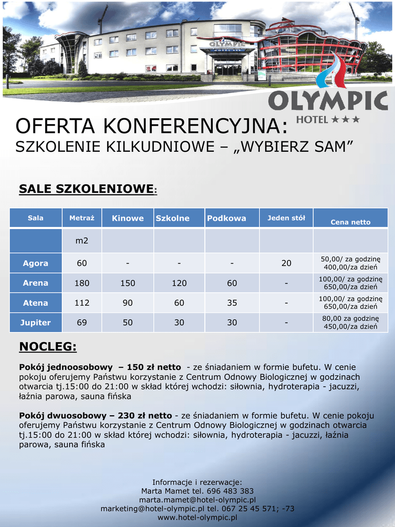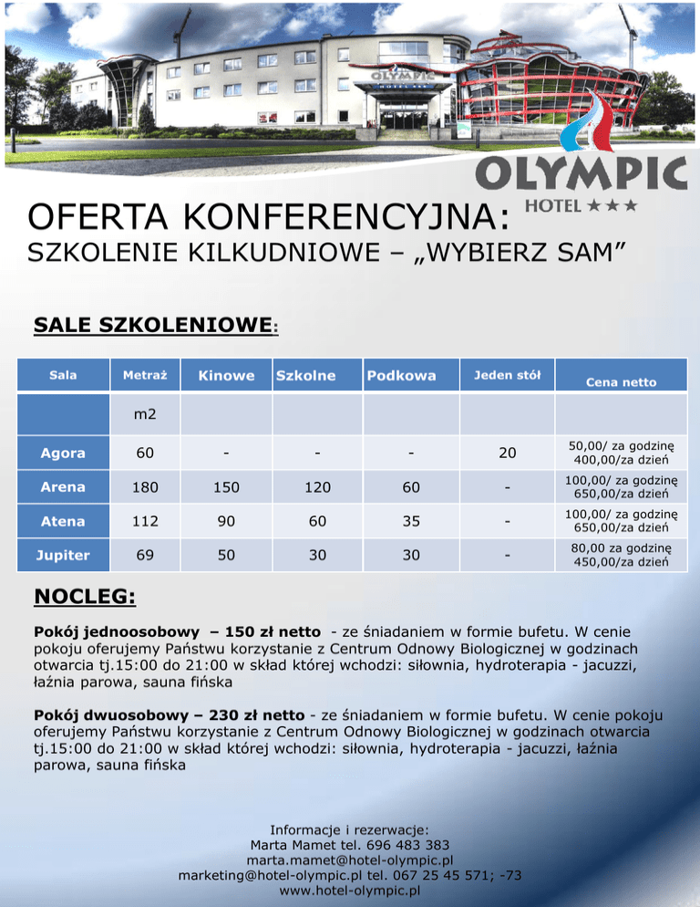 OFERTA KONFERENCYJNA: SZKOLENIE KILKUDNIOWE – „WYBIERZ SAM” SALE SZKOLENIOWE: Sala Metraż Kinowe Szkolne Podkowa Jeden stół Cena netto m2 Agora 60 - - - 20 50,00/ za godzinę 400,00/za dzień Arena 180 150 120 60 - 100,00/ za godzinę 650,00/za dzień Atena 112 90 60 35 - 100,00/ za godzinę 650,00/za dzień Jupiter 69 50 30 30 - 80,00 za godzinę 450,00/za dzień NOCLEG: Pokój jednoosobowy – 150 zł netto - ze śniadaniem w formie bufetu. W cenie pokoju oferujemy Państwu korzystanie z Centrum Odnowy Biologicznej w godzinach otwarcia tj.15:00 do 21:00 w skład której wchodzi: siłownia, hydroterapia - jacuzzi, łaźnia parowa, sauna fińska Pokój dwuosobowy – 230 zł netto - ze śniadaniem w formie bufetu. W cenie pokoju oferujemy Państwu korzystanie z Centrum Odnowy Biologicznej w godzinach otwarcia tj.15:00 do 21:00 w skład której wchodzi: siłownia, hydroterapia - jacuzzi, łaźnia parowa, sauna fińska Informacje i rezerwacje: Marta Mamet tel. 696 483 383 [email protected] [email protected] tel. 067 25 45 571; -73 www.hotel-olympic.pl OFERTA KONFERENCYJNA: SZKOLENIE KILKUDNIOWE – „WYBIERZ SAM” SERWIS KAWOWY: Wersja podstawowa – 22 zł netto/osoba kawa- 2 por/os., herbata- 1 por./os., woda - o,2l/os., soki - 0,2 l/os., wypieki domowe 150 g /os., świeże owoce - 300 g / os Wersja rozszerzona – 25 zł netto/osoba kawa- 2 por/os., herbata- 1 por./os., woda - o,2l/os. , soki - 0,2 l/os., wypieki domowe - 150 g /os., świeże owoce - 300 g / os, kanapki – 3 sztuki/os LUNCH: 40 zł netto/osoba W każdy zestaw wliczono napoje - porcja soku i wody w ilości 0,25 litra/osoba. Lunch trzydaniowy. Poniżej przykładowa propozycja. Wszystkie zestawy menu dostępne na zapytanie. Zestaw przykładowy: Zupa kalafiorowa na bekonie Duszona roladka z kurczaka z kaszą kuskus i szpinakiem podana z sosem ziołowym Budyń czekoladowy KOLACJA: SERWOWANA – 50 zł netto/osoba W każdy zestaw wliczono napoje - porcja soku i wody w ilości 0,25 litra/osoba. Poniżej przykładowa propozycja. Wszystkie zestawy menu dostępne na zapytanie. Zestaw przykładowy Sałatka Cezar Krem pieczarkowy Pieczony halibut podany z grzybowym ragout i z ryżem Informacje i rezerwacje: Marta Mamet tel. 696 483 383 [email protected] [email protected] tel. 067 25 45 571; -73 www.hotel-olympic.pl OFERTA KONFERENCYJNA: SZKOLENIE KILKUDNIOWE – „WYBIERZ SAM” KOLACJA: BUFET – 75 zł netto/osoba W każdy zestaw wliczono napoje - porcja soku i wody w ilości 0,25 litra/osoba. Poniżej przykładowa propozycja. Wszystkie zestawy menu dostępne na zapytanie. Zestaw przykładowy Zupa gulaszowa węgierska Pstrąg grillowany Roladka z kurczaka z papryką Pierogi ruskie, ziemniaki gotowane Sos ziołowy Bufet sałatkowy: cezar, owocowa, jarzynowa Pieczywo, masło Kawa, herbata UROCZYSTA KOLACJA – 90 zł netto/osoba W cenę wliczono napoje - porcja soku i wody w ilości 0,25 litra/osoba. Poniżej przykładowa propozycja: Dania ciepłe: Żurek staropolski z jajkiem Roladka z serem lazur Roladki ze schabu ze szpinakiem Kurczak z Mozzarellą Koperta ze schabu z serem i z szynką Grillowany łosoś Pierogi z kapustą z grzybami Krokiety ziemniaczane Ziemniaki gotowane Warzywa gotowane Galantyna z kurczaka Schab po królewsku Indyk w maladze Szparagi w szynce Smalec, ogórki, pieczywo Befsztyk tatarski Deser: Fontanna czekolady Atrakcje dodatkowo płatne podawane przez Kucharza - cena zależna od ilości osób: Indyk faszerowany w całości, udziec pieczony w całości, pierś z indyka faszerowana bakaliami, prosię pieczone Informacje i rezerwacje: Marta Mamet tel. 696 483 383 [email protected] [email protected] tel. 067 25 45 571; -73 www.hotel-olympic.pl