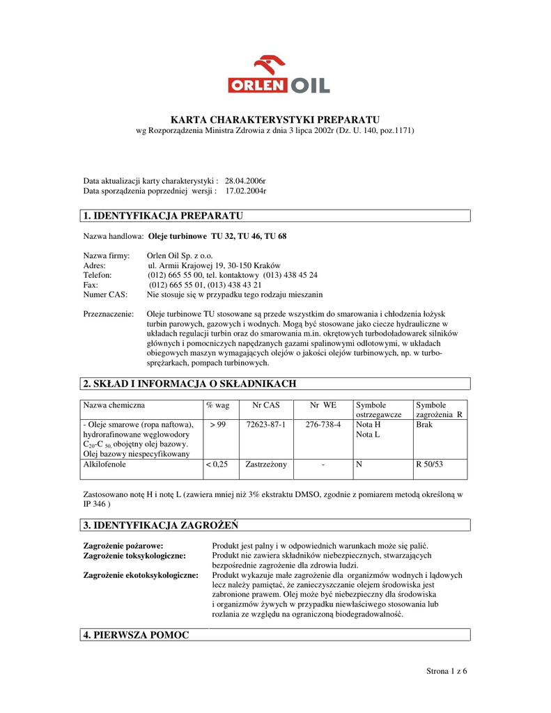 KARTA CHARAKTERYSTYKI PREPARATU wg Rozporządzenia Ministra Zdrowia z dnia 3 lipca 2002r (Dz. U. 140, poz.1171) Data aktualizacji karty charakterystyki : 28.04.2006r Data sporządzenia poprzedniej wersji : 17.02.2004r 1. IDENTYFIKACJA PREPARATU Nazwa handlowa: Oleje turbinowe TU 32, TU 46, TU 68 Nazwa firmy: Adres: Telefon: Fax: Numer CAS: Orlen Oil Sp. z o.o. ul. Armii Krajowej 19, 30-150 Kraków (012) 665 55 00, tel. kontaktowy (013) 438 45 24 (012) 665 55 01, (013) 438 43 21 Nie stosuje się w przypadku tego rodzaju mieszanin Przeznaczenie: Oleje turbinowe TU stosowane są przede wszystkim do smarowania i chłodzenia łożysk turbin parowych, gazowych i wodnych. Mogą być stosowane jako ciecze hydrauliczne w układach regulacji turbin oraz do smarowania m.in. okrętowych turbodoładowarek silników głównych i pomocniczych napędzanych gazami spalinowymi odlotowymi, w układach obiegowych maszyn wymagających olejów o jakości olejów turbinowych, np. w turbosprężarkach, pompach turbinowych. 2. SKŁAD I INFORMACJA O SKŁADNIKACH Nazwa chemiczna - Oleje smarowe (ropa naftowa), hydrorafinowane węglowodory C20-C 50, obojętny olej bazowy. Olej bazowy niespecyfikowany Alkilofenole % wag Nr CAS Nr WE > 99 72623-87-1 276-738-4 < 0,25 Zastrzeżony - Symbole ostrzegawcze Nota H Nota L Symbole zagrożenia R Brak N R 50/53 Zastosowano notę H i notę L (zawiera mniej niż 3% ekstraktu DMSO, zgodnie z pomiarem metodą określoną w IP 346 ) 3. IDENTYFIKACJA ZAGROŻEŃ Zagrożenie pożarowe: Zagrożenie toksykologiczne: Zagrożenie ekotoksykologiczne: Produkt jest palny i w odpowiednich warunkach może się palić. Produkt nie zawiera składników niebezpiecznych, stwarzających bezpośrednie zagrożenie dla zdrowia ludzi. Produkt wykazuje małe zagrożenie dla organizmów wodnych i lądowych lecz należy pamiętać, że zanieczyszczanie olejem środowiska jest zabronione prawem. Olej może być niebezpieczny dla środowiska i organizmów żywych w przypadku niewłaściwego stosowania lub rozlania ze względu na ograniczoną biodegradowalność. 4. PIERWSZA POMOC Strona 1 z 6 Oleje turbinowe TU 32, TU 46, TU 68 Drogi oddechowe: W temperaturach otoczenia olej nie wykazuje działania szkodliwego na drogi oddechowe ze względu na niską zawartość składników nielotnych. Ryzyko inhalacji istnieje tylko w przypadku utworzenia się mgły produktu lub też w wyniku jego ogrzania. Zapewnić dostęp świeżego powietrza. Jeżeli nie nastąpi poprawa zapewnić pomoc medyczną. Skóra: Zmyć dużą ilością wody z mydłem. Jeżeli wystąpi podrażnienie zapewnić pomoc medyczną. Jeżeli skóra jest narażona na kontakt z mgłą wysokociśnieniową, produkt może wniknąć do organizmu. W takim przypadku należy zgłosić się do lekarza, nawet gdy nie będą zauważone żadne negatywne objawy. Przemywać otwarte oczy wodą przez 15min.. Jeżeli wystąpi podrażnienie zapewnić pomoc medyczną. Ze względu na własności organoleptyczne istnieje małe prawdopodobieństwo dostania się drogą pokarmową. Nie prowokować wymiotów. Nie podawać nic doustnie. Jeżeli nie nastąpi poprawa zapewnić pomoc medyczną. Oczy: Połknięcie: 5. POSTĘPOWANIE W PRZYPADKU POŻARU Temp. zapłonu: Temp. samozapłonu: powyżej 210°C Brak danych. Do pominięcia w normalnych warunkach użytkowania. Środki gaśnicze: Piana, mgła wodna, suche proszki gaśnicze, CO2, piasek lub ziemia tylko w przypadku małych pożarów. Kompletne ubranie ochronne z indywidualnym aparatem oddechowym. Nie stosować zwartych strumieni wody na powierzchnię palącej się cieczy. Powoduje to rozrzucenie ognisk pożaru. Można zastosować wodę w postaci rozpylonej lub mgły wodnej w celu chłodzenia. Pod wpływem wysokiej temperatury tworzą się pary, które po zmieszaniu z powietrzem i zetknięciu ze źródłem zapłonu, mogą palić się w przestrzeni otwartej lub eksplodować w pomieszczeniu zamkniętym. Pary produktu są cięższe od powietrza i mogą przemieszczać się na duże odległości na poziomie gruntu, a po napotkaniu źródła ognia mogą spowodować ponowny zapłon. Silnie rozproszona mgła produktu może zapalać się poniżej znormalizowanej temperatury zapłonu. Spalająca się ciecz może pływać po powierzchni wody. Tlenki węgla, tlenki azotu, tlenki siarki i inne gazy niebezpieczne dla zdrowia. Sprzęt ochronny: Nieodpowiednie środki gaśnicze: Zagrożenia związane z gaszeniem pożarów: Produkty spalania: 6. POSTĘPOWANIE W PRZYPADKU NIEZAMIERZONEGO UWOLNIENIA DO ŚRODOWISKA Indywidualne środki ochrony: Zabezpieczenie środowiskaduże rozlewiska: Zabezpieczenie środowiskamałe wycieki: Unikać kontaktu ze skórą i oczami, używać ubrań powlekanych, butów na gumowej podeszwie. Duże rozlewiska zabezpieczyć przed rozprzestrzenianiem się tworząc bariery z piasku, ziemi lub materiału pochłaniającego. Zebrać dostępnym sprzętem i umieścić w oznakowanym, szczelnym pojemniku do późniejszego odzysku lub składowania w stosownym miejscu. Pozostałości potraktować jak mały wyciek. Zebrać, mieszając uprzednio z ziemią, piaskiem lub innym materiałem pochłaniającym, dostępnym sprzętem i umieścić w oznakowanym szczelnym pojemniku do późniejszego składowania w stosownym miejscu. 7. POSTĘPOWANIE Z PREPARATEM I JEGO MAGAZYNOWANIE POSTĘPOWANIE Zabezpieczenie użytkownika: Zabezpieczenie przed Stosować odpowiednią wentylację w przypadku zaistnienia warunków do wytworzenia się pary bądź mgły. Stosować wszelkie środki ograniczające ryzyko kontaktu zwłaszcza z olejem przepracowanym. Przetrzymywać z dala od materiałów łatwopalnych, żywności i napojów. Przy manipulowaniu i magazynowaniu przestrzegać ogólnych zasad i przepisów BHP i P.Poż., zaleca się używanie okularów ochronnych i odpowiedniej odzieży ochronnej. Puste opakowania i zbiorniki mogą zawierać palne lub wybuchowe pary. Nie Strona 2 z 6 Oleje turbinowe TU 32, TU 46, TU 68 eksplozją i pożarem: Środki ostro