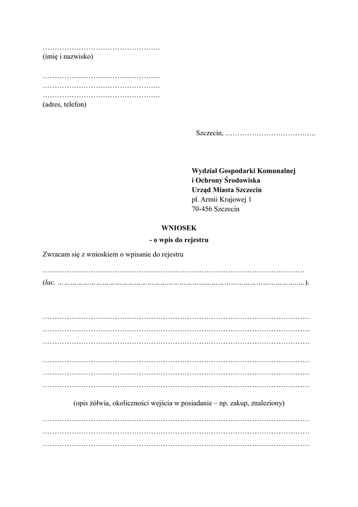 …………………………………………. (imię i nazwisko) …………………………………………. …………………………………………. …………………………………………. (adres, telefon) Szczecin, ……………………………….. Wydział Gospodarki Komunalnej i Ochrony Środowiska Urząd Miasta Szczecin pl. Armii Krajowej 1 70-456 Szczecin WNIOSEK - o wpis do rejestru Zwracam się z wnioskiem o wpisanie do rejestru ………………………………………………………………………………………………. (łac. …………………………………………………………………………………………………..…). ………………………………………………………………………………………………… ………………………………………………………………………………………………… ………………………………………………………………………………………………… ………………………………………………………………………………………………… ………………………………………………………………………………………………… ………………………………………………………………………………………………… (opis żółwia, okoliczności wejścia w posiadanie – np. zakup, znaleziony) ………………………………………………………………………………………………… ………………………………………………………………………………………………… ………………………………………………………………………………………………… ………………………………………………………………………………………………… ………………………………………………………………………………………………… ………………………………………………………………………………………………… (opis warunków i miejsca, w jakim żółw będzie przetrzymywany – wielkość akwarium, wyposażenie, adres) Żółwiem zamierzam opiekować się na stałe, przez czas nieokreślony. Do wniosku dołączam dokumentację fotograficzną żółwia (góra i dół oraz boki karapaksu) oraz akwarium. W załączeniu (niepotrzebne skreślić): 1) Świadectwo pochodzenia i inne dokumenty związane z nabyciem żółwia. 2) Ze względu na nieznane pochodzenie żółwia nie jest możliwie przedstawienie świadectwa pochodzenia ani innych dokumentów. Proszę o pozytywne rozpatrzenie naszego wniosku. Z poważaniem, ………………………………………….. (podpis)
