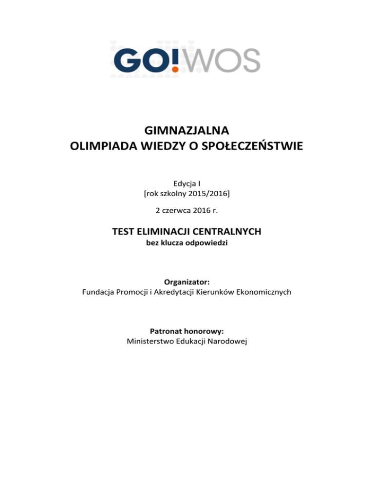GIMNAZJALNA OLIMPIADA WIEDZY O SPOŁECZEŃSTWIE Edycja I [rok szkolny 2015/2016] 2 czerwca 2016 r. TEST ELIMINACJI CENTRALNYCH bez klucza odpowiedzi Organizator: Fundacja Promocji i Akredytacji Kierunków Ekonomicznych Patronat honorowy: Ministerstwo Edukacji Narodowej Gimnazjalna Olimpiada Wiedzy o Społeczeństwie, edycja I Eliminacje centralne, 2 czerwca 2016 r. Instrukcja rozwiązywania testu Na rozwiązanie testu przeznacza się 30 minut. Odliczanie czasu rozpoczyna się od momentu zakończenia czytania instrukcji. Zawody odbywają się w warunkach kontrolowanej samodzielności. Komisja Centralna może zdyskwalifikować zawodnika na skutek stwierdzenia niesamodzielności odpowiedzi lub niespełnienia warunków formalnych określonych w Regulaminie Olimpiady i niniejszej instrukcji. Podczas zawodów zabronione jest w szczególności: posiadanie i używanie jakichkolwiek pomocy (kalkulatora, urządzeń z wbudowaną pamięcią, urządzeń z dostępem do internetu, tablic matematycznych, włączonego telefonu, słowników, podręczników i innych); odpisywanie czy porozumiewanie się pomiędzy zawodnikami; zmienianie miejsca podczas pisania testu lub zamienianie testu z innymi osobami; rozwiązywanie testu ołówkiem. Test składa się z 20 pytań, w tym 10 łatwiejszych i 10 trudniejszych. Należy wybrać jedną, najlepszą odpowiedź lub pole „nie udzielam odpowiedzi” i znaczyć niebieskim lub czarnym długopisem lub piórem na dołączonym do testu arkuszu odpowiedzi. Odpowiedzi nieprzeniesione do arkusza nie będą oceniane. Maksymalnie można otrzymać 30 pkt. Za udzielenie prawidłowej odpowiedzi na pytanie łatwiejsze zawodnik otrzymuje +1 pkt, za wskazanie nieprawidłowej odpowiedzi zawodnik otrzymuje -0,5 pkt. Za zaznaczenie pola „nie udzielam odpowiedzi” zawodnik uzyskuje 0 punktów. Za udzielenie prawidłowej odpowiedzi na pytanie trudniejsze zawodnik otrzymuje +2 pkt., za wskazanie nieprawidłowej odpowiedzi zawodnik otrzymuje -0,5 pkt. Za zaznaczenie pola „nie udzielam odpowiedzi” zawodnik uzyskuje 0 punktów. Wszystkie poprawki w arkuszu odpowiedzi traktowane są jako odpowiedzi błędne. Zaznaczenie więcej niż jednego pola lub niezaznaczeni żadnego pola odpowiedzi traktowane jest jako odpowiedź błędna. Pola na pierwszej stronie testu należy wypełnić. Po zakończeniu pisania testu należy zwrócić zarówno arkusz odpowiedzi, jak i sam test. Powodzenia! 2 Gimnazjalna Olimpiada Wiedzy o Społeczeństwie, edycja I Eliminacje centralne, 2 czerwca 2016 r. TEST 1. (1 pkt) Obowiązkiem obywatela Polski nie jest: a) troska o dobro wspólne, b) dbałość o stan środowiska, c) dbanie o czystość języka polskiego, d) przestrzeganie prawa. 2. (1 pkt) Który element nie jest niezbędny do powstania i przetrwania narodu? a) poczucie tożsamości narodowej, b) państwo narodowe, c) świadomość narodowa, d) kultura narodowa. 3. (1 pkt) Trójelementowa definicja państwa nie odnosi się do: a) terytorium państwa, b) ludzi zamieszkujących państwo, c) zorganizowanej, suwerennej władzy, d) formy rządów. 4. (1 pkt) Która z zasad nie znalazłaby się w kodeksie etyki urzędniczej: a) relatywizm, b) obiektywizm, c) profesjonalizm, d) rzetelność. 5. (1 pkt) W Polsce za realizację polityki pieniężnej odpowiada: a) Europejski Bank Centralny, b) Ministerstwo Finansów, c) Narodowy Bank Polski, d) Rada Polityki Pieniężnej. 6. (1 pkt) Europejska Wspólnota Gospodarcza (EWG) została powołana na mocy: a) Traktatów rzymskich, b) Traktatu amsterdamskiego, c) Traktatu brukselskiego, d) Traktatu nicejskiego. 7. (1 pkt) Funkcję Przewodniczącego Parlamentu Europejskiego pełni obecnie (stan na marzec 2016 r.): a) Donald Tusk, b) Jean-Claude Juncker, c) Jerzy Buzek, d) Martin Schulz. 3 Gimnazjalna Olimpiada Wiedzy o Społeczeństwie, edycja I Eliminacje centralne, 2 czerwca 2016 r. 8. (1 pkt) Największym pod względem wielkości populacji państwem o ustroju demokratycznym, w którym dominuje religia muzułmańska, jest: a) Arabia Saudyjska, b) Islamska Republika Iranu, c) Turcja, d) Indonezja. 9. (1 pkt) Zgodnie z protokołem dyplomatycznym dziekanem (przewodniczącym) korpusu dyplomatycznego w Polsce jest: a) najstarszy wiekiem ambasador akredytowany w Polsce, b) nuncjusz apostolski, c) ambasador Unii Europejskiej, d) ambasador USA. 10. (1 pkt) Pokojowa Nagroda Nobla jest wręczana w: a) Szwecji, b) Norwegii, c) Danii, d) Francji. 11. (2 pkt) Human Development Index jest wskaźnikiem rozwoju społecznego (ludzkiego) opracowywanym przez: a) Bank Światowy, b) Organizację Współpracy Gospodarczej i Rozwoju, c) Program Narodów Zjednoczonych ds. Rozwoju, d) Unię Europejską. 12. (2 pkt) Do strefy Schengen nie należy (stan na marzec 2016 r.): a) Szwecja, b) Norwegia, c) Cypr, d) Islandia. 13. (2 pkt) Do państw BRICS nie zalicza się: a) Brazylii, b) Indonezji, c) Chin, d) Republiki Południowej Afryki. 14. (2 pkt) Które z państw Ameryki Południowej jest członkiem OECD: a) Argentyna, b) Brazylia, c) Chile, d) Wenezuela. 4 Gimnazjalna Olimpiada Wiedzy o Społeczeństwie, edycja I Eliminacje centralne, 2 czerwca 2016 r. 15. (2 pkt) Falklandy/Malwiny to archipelag w pobliżu wybrzeża Ameryki Południowej, o który w sporze terytorialnym z Wielką Brytanią pozostaje: a) Brazylia, b) Urugwaj, c) Argentyna, d) Wenezuela. 16. (2 pkt) Poniższe zdjęcie stało się symbolem jednego z ważnych wydarzeń w dziejach Polski w XX w. Jakiego? Źródło: http://culture.pl a) b) c) d) wydarzeń na Wybrzeżu w 1970 r., wprowadzenia stanu wojennego w 1981 r., obrad Okrągłego Stołu w 1989 r., wyboru Wojciech Jaruzelskiego na prezydenta PRL w 1989 r. 17. (2 pkt) Dopasuj poniższe flagi do nazw państw europejskich: a) 1 – Hiszpania; 2 – Litwa; 3 – Szwajcaria, b) 1 – Łotwa; 2 – Litwa; 3 – Austria, c) 1 – Austria; 2 – Belgia; 3 – Łotwa, d) 1 – Portugalia; 2 – Rumunia; 3 – Słowacja. źródło: http://www.flagipanstw.eu 1. 2. 3. 18. (2 pkt) Xi Jinpi